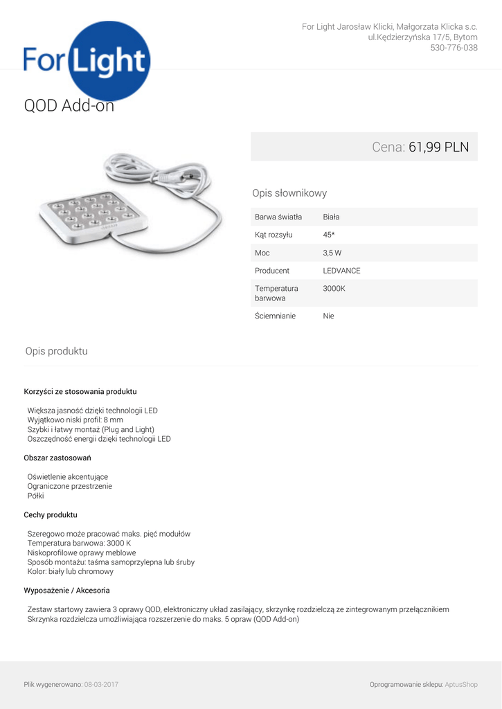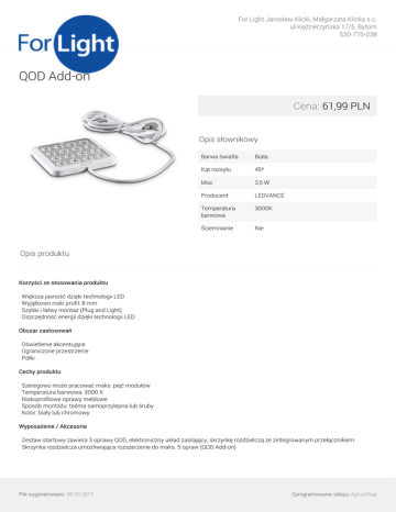 For Light Jarosław Klicki, Małgorzata Klicka s.c. ul.Kędzierzyńska 17/5, Bytom 530-776-038 QOD Add-on Cena: 61,99 PLN Opis słownikowy Barwa światła Biała Kąt rozsyłu 45* Moc 3,5 W Producent LEDVANCE Temperatura barwowa 3000K Ściemnianie Nie Opis produktu Korzyści ze stosowania produktu Większa jasność dzięki technologii LED Wyjątkowo niski profil: 8 mm Szybki i łatwy montaż (Plug and Light) Oszczędność energii dzięki technologii LED Obszar zastosowań Oświetlenie akcentujące Ograniczone przestrzenie Półki Cechy produktu Szeregowo może pracować maks. pięć modułów Temperatura barwowa: 3000 K Niskoprofilowe oprawy meblowe Sposób montażu: taśma samoprzylepna lub śruby Kolor: biały lub chromowy Wyposażenie / Akcesoria Zestaw startowy zawiera 3 oprawy QOD, elektroniczny układ zasilający, skrzynkę rozdzielczą ze zintegrowanym przełącznikiem Skrzynka rozdzielcza umożliwiająca rozszerzenie do maks. 5 opraw (QOD Add-on) Plik wygenerowano: 08-03-2017 Oprogramowanie sklepu: AptusShop For Light Jarosław Klicki, Małgorzata Klicka s.c. ul.Kędzierzyńska 17/5, Bytom 530-776-038 Plik wygenerowano: 08-03-2017 Powered by TCPDF (www.tcpdf.org) Oprogramowanie sklepu: AptusShop