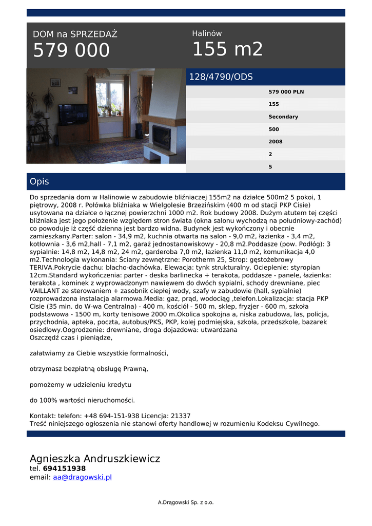 Halinów DOM na SPRZEDAŻ 155 m2 579 000 128/4790/ODS 579 000 PLN 155 Secondary 500 2008 2 5 Opis Do sprzedania dom w Halinowie w zabudowie bliźniaczej 155m2 na działce 500m2 5 pokoi, 1 piętrowy, 2008 r. Połówka bliźniaka w Wielgolesie Brzezińskim (400 m od stacji PKP Cisie) usytowana na działce o łącznej powierzchni 1000 m2. Rok budowy 2008. Dużym atutem tej części bliźniaka jest jego położenie względem stron świata (okna salonu wychodzą na południowy-zachód) co powoduje iż część dzienna jest bardzo widna. Budynek jest wykończony i obecnie zamieszkany.Parter: salon - 34,9 m2, kuchnia otwarta na salon - 9,0 m2, łazienka - 3,4 m2, kotłownia - 3,6 m2,hall - 7,1 m2, garaż jednostanowiskowy - 20,8 m2.Poddasze (pow. Podłóg): 3 sypialnie: 14,8 m2, 14,8 m2, 24 m2, garderoba 7,0 m2, łazienka 11,0 m2, komunikacja 4,0 m2.Technologia wykonania: Ściany zewnętrzne: Porotherm 25, Strop: gęstożebrowy TERIVA.Pokrycie dachu: blacho-dachówka. Elewacja: tynk strukturalny. Ocieplenie: styropian 12cm.Standard wykończenia: parter - deska barlinecka + terakota, poddasze - panele, łazienka: terakota , kominek z wyprowadzonym nawiewem do dwóch sypialni, schody drewniane, piec VAILLANT ze sterowaniem + zasobnik ciepłej wody, szafy w zabudowie (hall, sypialnie) rozprowadzona instalacja alarmowa.Media: gaz, prąd, wodociąg ,telefon.Lokalizacja: stacja PKP Cisie (35 min. do W-wa Centralna) - 400 m, kościół - 500 m, sklep, fryzjer - 600 m, szkoła podstawowa - 1500 m, korty tenisowe 2000 m.Okolica spokojna a, niska zabudowa, las, policja, przychodnia, apteka, poczta, autobus/PKS, PKP, kolej podmiejska, szkoła, przedszkole, bazarek osiedlowy.Oogrodzenie: drewniane, droga dojazdowa: utwardzana Oszczędź czas i pieniądze, załatwiamy za Ciebie wszystkie formalności, otrzymasz bezpłatną obsługę Prawną, pomożemy w udzieleniu kredytu do 100% wartości nieruchomości. Kontakt: telefon: +48 694-151-938 Licencja: 21337 Treść niniejszego ogłoszenia nie stanowi oferty handlowej w rozumieniu Kodeksu Cywilnego. Agnieszka Andruszkiewicz tel. 694151938 email: [email protected] A.Drągowski Sp. z o.o. A.Drągowski Sp. z o.o. Powered by TCPDF (www.tcpdf.org)
