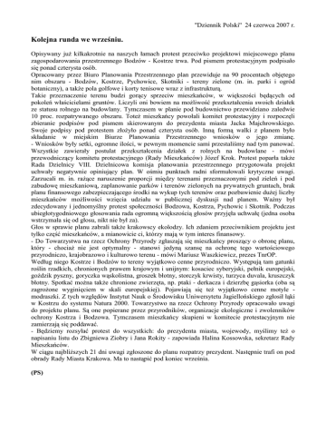 ''Dziennik Polski'' 24 czerwca 2007 r. Kolejna runda we wrześniu. Opisywany juŜ kilkakrotnie na naszych łamach protest przeciwko projektowi miejscowego planu zagospodarowania przestrzennego Bodzów - Kostrze trwa. Pod pismem protestacyjnym podpisało się ponad czterysta osób. Opracowany przez Biuro Planowania Przestrzennego plan przewiduje na 90 procentach objętego nim obszaru - Bodzów, Kostrze, Pychowice, Skotniki - tereny zielone (m. in. parki i ogród botaniczny), a takŜe pola golfowe i korty tenisowe wraz z infrastrukturą. Takie przeznaczenie terenu budzi gorący sprzeciw mieszkańców, w większości będących od pokoleń właścicielami gruntów. Liczyli oni bowiem na moŜliwość przekształcenia swoich działek ze statusu rolnego na budowlany. Tymczasem w planie pod budownictwo przewidziano zaledwie 10 proc. rozpatrywanego obszaru. ToteŜ mieszkańcy powołali komitet protestacyjny i rozpoczęli zbieranie podpisów pod pismem skierowanym do prezydenta miasta Jacka Majchrowskiego. Swoje podpisy pod protestem złoŜyło ponad czterysta osób. Inną formą walki z planem było składanie w miejskim Biurze Planowania Przestrzennego wniosków o jego zmianę. - Wniosków były setki, ogromne ilości, w pewnym momencie sami przestaliśmy nad tym panować. Wszystkie zawierały postulat przekształcenia działek z rolnych na budowlane - mówi przewodniczący komitetu protestacyjnego (Rady Mieszkańców) Józef Krok. Protest poparła takŜe Rada Dzielnicy VIII. Dzielnicowa komisja planowania przestrzennego przygotowała projekt uchwały negatywnie opiniujący plan. W ośmiu punktach radni sformułowali krytyczne uwagi. Zarzucali m. in. raŜące naruszenie proporcji między terenami przeznaczonymi pod zieleń i pod zabudowę mieszkaniową, zaplanowanie parków i terenów zielonych na prywatnych gruntach, brak planu finansowego zabezpieczającego środki na wykup tych terenów oraz pozbawienie duŜej liczby mieszkańców moŜliwości wzięcia udziału w publicznej dyskusji nad planem. WaŜny był zdecydowany i jednomyślny protest społeczności Bodzowa, Kostrza, Pychowic i Skotnik. Podczas ubiegłotygodniowego głosowania rada ogromną większością głosów przyjęła uchwałę (jedna osoba wstrzymała się od głosu, nikt nie był za). Głos w sprawie planu zabrali takŜe krakowscy ekolodzy. Ich zdaniem przeciwnikiem projektu jest tylko część mieszkańców, a mianowicie ci, którzy mają w tym interes finansowy. - Do Towarzystwa na rzecz Ochrony Przyrody zgłaszają się mieszkańcy proszący o obronę planu, który - chociaŜ nie jest optymalny - stanowi jedyną szansę na ochronę tego wartościowego przyrodniczo, krajobrazowo i kulturowo terenu - mówi Mariusz Waszkiewicz, prezes TnrOP. Według niego Kostrze i Bodzów to tereny wyjątkowo cenne przyrodniczo. Występują tam gatunki roślin rzadkich, chronionych prawem krajowym i unijnym: kosaciec syberyjski, pełnik europejski, goŜdzik pyszny, goryczka wąskolistna, groszek błotny, storczyk krwisty, turzyca duvala, kruszczyk błotny. Spotkać moŜna takŜe chronione zwierzęta, np. ptaki - derkacza i dzierzbę gąsiorka (oba są zagroŜone wyginięciem w skali europejskiej). Pojawiają się teŜ wyjątkowo cenne motyle modraszki. Z tych względów Instytut Nauk o Środowisku Uniwersytetu Jagiellońskiego zgłosił łąki w Kostrzu do systemu Natura 2000. Towarzystwo na rzecz Ochrony Przyrody opracowało uwagi do projektu planu. Są one popierane przez przyrodników, organizacje ekologiczne i zwolenników ochrony Kostrza i Bodzowa. Tymczasem mieszkańcy skupieni w komitecie protestacyjnym nie zamierzają się poddawać. - Będziemy rozsyłać protest do wszystkich: do prezydenta miasta, wojewody, myślimy teŜ o napisaniu listu do Zbigniewa Ziobry i Jana Rokity - zapowiada Halina Kossowska, sekretarz Rady Mieszkańców. W ciągu najbliŜszych 21 dni uwagi zgłoszone do planu rozpatrzy prezydent. Następnie trafi on pod obrady Rady Miasta Krakowa. Ma to nastąpić pod koniec września. (PS)