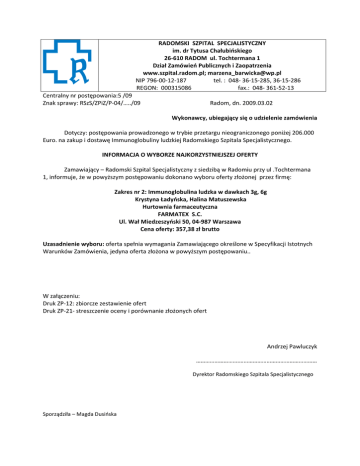 RADOMSKI SZPITAL SPECJALISTYCZNY im. dr Tytusa Chałubińskiego 26-610 RADOM ul. Tochtermana 1 Dział Zamówień Publicznych i Zaopatrzenia www.szpital.radom.pl; [email protected] NIP 796-00-12-187 tel. : 048- 36-15-285, 36-15-286 REGON: 000315086 fax.: 048- 361-52-13 Centralny nr postępowania:5 /09 Znak sprawy: RSzS/ZPiZ/P-04/…../09 Radom, dn. 2009.03.02 Wykonawcy, ubiegający się o udzielenie zamówienia Dotyczy: postępowania prowadzonego w trybie przetargu nieograniczonego poniżej 206.000 Euro. na zakup i dostawę Immunoglobuliny ludzkiej Radomskiego Szpitala Specjalistycznego. INFORMACJA O WYBORZE NAJKORZYSTNIEJSZEJ OFERTY Zamawiający – Radomski Szpital Specjalistyczny z siedzibą w Radomiu przy ul .Tochtermana 1, informuje, że w powyższym postępowaniu dokonano wyboru oferty złożonej przez firmę: Zakres nr 2: Immunoglobulina ludzka w dawkach Zg, 6g Krystyna Ładyńska, Halina Matuszewska Hurtownia farmaceutyczna FARMATEX S.C. Ul. Wał Miedzeszyński 50, 04-987 Warszawa Cena oferty: Z57,Z8 zł brutto Uzasadnienie wyboru: oferta spełnia wymagania Zamawiającego określone w Specyfikacji Istotnych Warunków Zamówienia, jedyna oferta złożona w powyższym postępowaniu.. W załączeniu: Druk ZP-12: zbiorcze zestawienie ofert Druk ZP-21- streszczenie oceny i porównanie złożonych ofert Andrzej Pawluczyk ……………………….…………………………………………… Dyrektor Radomskiego Szpitala Specjalistycznego Sporządziła – Magda Dusińska RADOMSKI SZPITAL SPECJALISTYCZNY im. dr Tytusa Chałubińskiego 26-610 RADOM ul. Tochtermana 1 Dział Zamówień Publicznych i Zaopatrzenia www.szpital.radom.pl; [email protected] NIP 796-00-12-187 tel. : 048- 36-15-285, 36-15-286 REGON: 000315086 fax.: 048- 361-52-13 Centralny nr postępowania:5 /09 Znak sprawy: RSzS/ZPiZ/P-04/…../09 Radom, dn. 2009.03.02 Wykonawcy, ubiegający się o udzielenie zamówienia Dotyczy: postępowania prowadzonego w trybie przetargu nieograniczonego poniżej 206.000 Euro. na zakup i dostawę Immunoglobuliny ludzkiej Radomskiego Szpitala Specjalistycznego. INFORMACJA O WYBORZE NAJKORZYSTNIEJSZEJ OFERTY Zamawiający – Radomski Szpital Specjalistyczny z siedzibą w Radomiu przy ul .Tochtermana 1, informuje, że w powyższym postępowaniu dokonano wyboru oferty złożonej przez firmę: Zakres nr 1: Immunoglobulina ludzka w dawkach 2,5g, 5g ASCLEPIOS S.A. Ul. Rymera 12 41-800 Zabrze Cena oferty: 70Z,84 zł brutto Uzasadnienie wyboru: oferta spełnia wymagania Zamawiającego określone w Specyfikacji Istotnych Warunków Zamówienia, jedyna oferta złożona w powyższym postępowaniu.. W załączeniu: Druk ZP-12: zbiorcze zestawienie ofert Druk ZP-21- streszczenie oceny i porównanie złożonych ofert Andrzej Pawluczyk ………………………..…………………………………………… Dyrektor Radomskiego Szpitala Specjalistycznego Sporządziła – Magda Dusińska