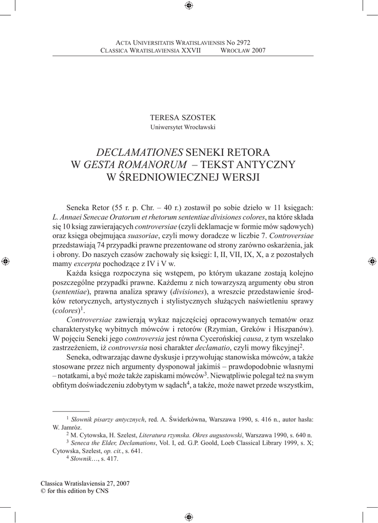 Acta Universitatis Wratislaviensis No 2972 Classica Wratislaviensia XXVII Wrocław 2007 171 Teresa Szostek Uniwersytet Wrocławski Declamationes Seneki Retora w Gesta Romanorum – tekst antyczny w średniowiecznej wersji Seneka Retor (55 r. p. Chr. – 40 r.) zostawił po sobie dzieło w 11 księgach: L. Annaei Senecae Oratorum et rhetorum sententiae divisiones colores, na które składa się 10 ksiąg zawierających controversiae (czyli deklamacje w formie mów sądowych) oraz księga obejmująca suasoriae, czyli mowy doradcze w liczbie 7. Controversiae przedstawiają 74 przypadki prawne prezentowane od strony zarówno oskarżenia, jak i obrony. Do naszych czasów zachowały się księgi: I, II, VII, IX, X, a z pozostałych mamy excerpta pochodzące z IV i V w. Każda księga rozpoczyna się wstępem, po którym ukazane zostają kolejno poszczególne przypadki prawne. Każdemu z nich towarzyszą argumenty obu stron (sententiae), prawna analiza sprawy (divisiones), a wreszcie przedstawienie środków retorycznych, artystycznych i stylistycznych służących naświetleniu sprawy (colores). Controversiae zawierają wykaz najczęściej opracowywanych tematów oraz charakterystykę wybitnych mówców i retorów (Rzymian, Greków i Hiszpanów). W pojęciu Seneki jego controversia jest równa Cycerońskiej causa, z tym wszelako zastrzeżeniem, iż controversia nosi charakter declamatio, czyli mowy fikcyjnej. Seneka, odtwarzając dawne dyskusje i przywołując stanowiska mówców, a także stosowane przez nich argumenty dysponował jakimiś – prawdopodobnie własnymi – notatkami, a być może także zapiskami mówców. Niewątpliwie polegał też na swym obfitym doświadczeniu zdobytym w sądach, a także, może nawet przede wszystkim, Słownik pisarzy antycznych, red. A. Świderkówna, Warszawa 1990, s. 416 n., autor hasła: W. Jamróz. M. Cytowska, H. Szelest, Literatura rzymska. Okres augustowski, Warszawa 1990, s. 640 n. Seneca the Elder, Declamations, Vol. I, ed. G.P. Goold, Loeb Classical Library 1999, s. X; Cytowska, Szelest, op. cit., s. 641. Słownik…, s. 417. Classica Wratislaviensia 27, 2007 © for this edition by CNS 172 Teresa Szostek na rewelacyjnej i dobrze wyćwiczonej pamięci. Sam bowiem nie wymyślał ani tematów, które omawiano, ani przebiegu dyskusji. W Declamationes Kwintyliana można natomiast odnaleźć zarówno bardzo podobne do senecjańskich kwestie, które nie są jednak identyczne, jak i takie, w których trudno się dopatrzeć jakichkolwiek rozbieżności. Wydaje się, iż retorzy, swobodnie podchodząc do tematyki, korzystali jednakże ze stałego kanonu spraw prawnych, które były przypadkami rozpatrywanymi w ramach ćwiczeń retorycznych w szkołach. Zbiór zwany Gesta Romanorum obejmuje pewną, bardzo rozpowszechnioną, kolekcję exemplów średniowiecznych, której popularność sięga w przyszłość daleko poza wieki średnie. Taki właśnie tytuł jest stosowany w odniesieniu do owego kompendium powszechnie od pierwszej połowy XIV w. Już incipity informowały odbiorcę jednoznacznie o tematyce poruszanej w opowiadaniach opatrzonych moralistyczną interpretacją. Najstarszy datowany rękopis znajdujący się w Innsbrucku pochodzi z 1342 r. i można przypuszczać, iż zawiera najstarsze teksty Gesta Romanorum (220 opowiadań). Jednym z podstawowych, tzn. najczęściej się powtarzających źródeł przywoływanych w Gesta Romanorum była kolekcja exemplów zwana Compilatio exemplorum anglicorum składająca się z 4 części, a mianowicie: Moralitates Holkota, Imagines Fulgentii, Enigmata Aristotelis moralizata (w liczbie siedmiu zagadek) oraz Declamationes Senece moralizate. I właśnie to ostatnie źródło, a raczej sposób jego wykorzystywania przez Gesta Romanorum stanowi przedmiot rozważań niniejszego artykułu. Obydwa teksty, i antyczny, i średniowieczny, powstały w pewnym sensie na zamówienie społeczne. W Rzymie okresu cesarstwa retoryka spadła do poziomu ćwiczeń szkolnych. Wymyślano fikcyjne tematy rozpraw (controversiae), nieistniejący aparat sądowniczy, sztuczne, bo nieprawdziwe przepisy prawne. Seneka, boleśnie zdając sobie sprawę z upadku sztuki wymowy, napisał dzieło retoryczne na potrzeby swych synów, spełniając w ten sposób ich oczekiwania. Autorzy kompilacji przykładów zawartych Ibidem; Cytowska, Szelest, op. cit., s. 641; Seneca the Elder, Declamations, s. X; J. Fairweather, Seneca the Elder, Cambridge 1981, s. 37–49, 228–234. Np. Declamatio VI Kwintyliana zawiera wspólne z wersją przypadku przedstawianego przez Senekę (Sen. 7, 4) motywy, takie jak: niewola ojca u piratów, list wysłany do domu z prośbą o okup, ślepota matki, która z rozpaczy wypłakała sobie oczy, wyprawa syna na ratunek ojcu. Są też jednak istotne różnice. Pierwsza z nich jawi się zaraz na wstępie – otóż u Seneki prawo mówi, iż dzieci, które nie opiekują się rodzicami, powinny zostać uwięzione, a Kwintylian podaje, że kto w potrzebie zostawi rodziców, temu odmawia się prawa pogrzebu po śmierci. Wedle powyższej wersji historia tej rodziny ma swój ciąg dalszy. Otóż później syn ginie na morzu, które wyrzuca jego zwłoki na ojczysty brzeg. Wówczas ojciec pragnie pochować syna, a matka jest temu przeciwna. Quintiliani quae feruntur Declamationes XIX maiores, ed. Georgius Lehnert, Lipsiae MCMV, s. 111. Inne znowu przykłady nie różnią się niczym między sobą w wersji Seneki i Kwintyliana, por. np. przypadek zwycięskiego żołnierza, który został oskarżony o zbezczeszczenie grobowca (Sen. 3, 7; Kwintylian Declamatio CCCLXIX, M. Fabii Quintiliani Declamationes, quae supersunt, rec. Constantinus Ritter, Lipsiae MDCCCLXXXIV, s. 405). T. Szostek, ‘Exemplum’ w polskim średniowieczu, Warszawa 1997, s. 20. Problem czasu i miejsca powstania Gesta: ibidem, s. 22–30. Seneka, Controversiae 1, wstęp 8–10. Classica Wratislaviensia 27, 2007 © for this edition by CNS Declamationes Seneki Retora w 