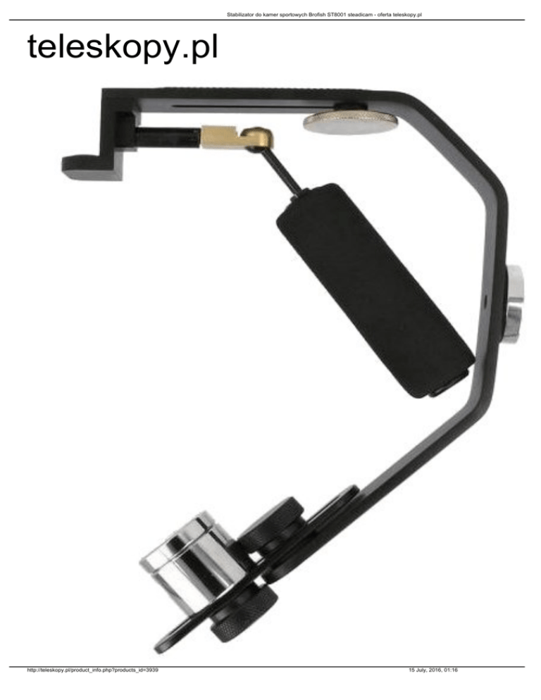 Stabilizator do kamer sportowych Brofish ST8001 steadicam - oferta teleskopy.pl teleskopy.pl http://teleskopy.pl/product_info.php?products_id=3939 15 July, 2016, 01:16 Stabilizator do kamer sportowych Brofish ST8001 steadicam - oferta teleskopy.pl Brofish Stabilizer Pro to stabilizator wideo przeznaczony do kamer sportowych GoPro, Sony ActionCam, Redleaf, SjCam oraz innych urz±dzeñ o wadze do 500 g. Zastosowany przegub kulowy oraz regulowana przeciwwaga umo¿liwiaj± pozbycie siê niepo¿±danych wstrz±sów i wibracji podczas nagrywania filmów. Stabilizator wyposa¿ony jest w wygodny uchwyt pokryty piank±, dziêki czemu pewnie le¿y w d³oni. Monta¿ kamery odbywa siê za po¶rednictwem gwintu 1/4", w urz±dzeniach pozbawionych takiego mocowania wymagane jest u¿ycie tzw. adaptera statywowego. W zestawie znajduje siê praktyczna, twarda walizka z miejscem na przenoszenie kamery oraz adapter z mocowaniem typu GoPro HERO. Parametry techniczne • • • • • mocowanie: 1/4" oraz adapter do kamer z mocowaniem GoPro maksymalne obci±¿enie 500 g materia³: stop aluminium wymiary: 24 x 16 x 3 cm (oko³o) waga: 350 g W NASZEJ OFERCIE POSIADAMY KAMERY GOPRO: najnowsze Hero4 Black i Hero 4 Silver oraz bogaty wybór akcesoriów do GoPro (w tym Hero 3+, 3 i 2) - zachêcamy do kontaktu. Jeste¶my Autoryzowanym Sprzedawc± Detalicznym GoPro - oferowane przez nas kamery i akcesoria GoPro pochodz± z oficjalnej polskiej dystrybucji i posiadaj± 2-letni±, realizowan± w Polsce gwarancjê dystrybutora. http://teleskopy.pl/product_info.php?products_id=3939 15 July, 2016, 01:16