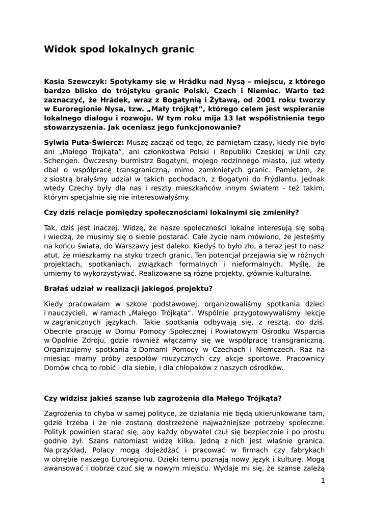 Widok spod lokalnych granic Kasia Szewczyk: Spotykamy się w Hrádku nad Nysą – miejscu, z którego bardzo blisko do trójstyku granic Polski, Czech i Niemiec. Warto też zaznaczyć, że Hrádek, wraz z Bogatynią i Żytawą, od 2001 roku tworzy w Euroregionie Nysa, tzw. „Mały trójkąt”, którego celem jest wspieranie lokalnego dialogu i rozwoju. W tym roku mija 13 lat współistnienia tego stowarzyszenia. Jak oceniasz jego funkcjonowanie? Sylwia Puta-Świercz: Muszę zacząć od tego, że pamiętam czasy, kiedy nie było ani „Małego Trójkąta”, ani członkostwa Polski i Republiki Czeskiej w Unii czy Schengen. Ówczesny burmistrz Bogatyni, mojego rodzinnego miasta, już wtedy dbał o współpracę transgraniczną, mimo zamkniętych granic. Pamiętam, że z siostrą brałyśmy udział w takich pochodach, z Bogatyni do Frýdlantu. Jednak wtedy Czechy były dla nas i reszty mieszkańców innym światem - też takim, którym specjalnie się nie interesowałyśmy. Czy dziś relacje pomiędzy społecznościami lokalnymi się zmieniły? Tak, dziś jest inaczej. Widzę, że nasze społeczności lokalne interesują się sobą i wiedzą, że musimy się o siebie postarać. Całe życie nam mówiono, że jesteśmy na końcu świata, do Warszawy jest daleko. Kiedyś to było zło, a teraz jest to nasz atut, że mieszkamy na styku trzech granic. Ten potencjał przejawia się w różnych projektach, spotkaniach, związkach formalnych i nieformalnych. Myślę, że umiemy to wykorzystywać. Realizowane są różne projekty, głównie kulturalne. Brałaś udział w realizacji jakiegoś projektu? Kiedy pracowałam w szkole podstawowej, organizowaliśmy spotkania dzieci i nauczycieli, w ramach „Małego Trójkąta“. Wspólnie przygotowywaliśmy lekcje w zagranicznych językach. Takie spotkania odbywają się, z resztą, do dziś. Obecnie pracuję w Domu Pomocy Społecznej i Powiatowym Ośrodku Wsparcia w Opolnie Zdroju, gdzie również włączamy się we współpracę transgraniczną. Organizujemy spotkania z Domami Pomocy w Czechach i Niemczech. Raz na miesiąc mamy próby zespołów muzycznych czy akcje sportowe. Pracownicy Domów chcą to robić i dla siebie, i dla chłopaków z naszych ośrodków. Czy widzisz jakieś szanse lub zagrożenia dla Małego Trójkąta? Zagrożenia to chyba w samej polityce, że działania nie będą ukierunkowane tam, gdzie trzeba i że nie zostaną dostrzeżone najważniejsze potrzeby społeczne. Polityk powinien starać się, aby każdy obywatel czuł się bezpiecznie i po prostu godnie żył. Szans natomiast widzę kilka. Jedną z nich jest właśnie granica. Na przykład, Polacy mogą dojeżdżać i pracować w firmach czy fabrykach w obrębie naszego Euroregionu. Dzięki temu poznają nowy język i kulturę. Mogą awansować i dobrze czuć się w nowym miejscu. Wydaje mi się, że szanse zależą 1 przede wszystkim od zwykłych ludzi. Czy chce się im starać i kontynuować te działania. Rolą polityka jest natomiast, aby wspierać i nasłuchiwać potrzeb, i oczekiwań mieszkańców. Mieszkasz w Hrádku nad Nysą od 10 lat. Byłaś obecna podczas wspólnego wstąpienia dwóch państw do Unii Europejskiej. Czytałam, że tutaj, w punkcie trójstyku, wydarzenie to miało bardzo symboliczne znaczenie. Pamiętam, że dla mnie osobiście było to bardzo emocjonalne przeżycie. Byłam wzruszona tą chwilą, bo wiedziałam, że jest to historyczny moment. Myślę, że dzięki temu wstąpieniu kontakty tutaj się zmieniły, bo dawna granica robiła jednak swoje. Kiedyś, jak widziało się uzbrojoną armię, to człowiek był raczej przerażony. Istotne jest, że środki unijne dają szansę i umożliwiają nam rozpoczęcie projektów w naszym środowisku lokalnym. Potem ludzie już sami organizują się w nieformalne grupy, szukają kontaktu ze sobą i zaczynają coś tworzyć. Nie potrzebują koordynacji z zewnątrz i sami potrafią sobie poradzić. Właśnie temu mają służyć realizowane projekty. Na począku pobudzić, skłonić do działania i pokazać możliwości. To jest najważniejsze. W Twoim życiu od dawna obecna jest polityka regionalna - i polska, i czeska. Sama byłaś m.in. wiceprzewodniczącą Rady Gminy i Miasta oraz radną powiatu i członkiem zarządu, a Twoim mężem jest Hetman kraju libereckiego, Pan Martin Půta. Czy obserwując Czechów sądzisz, że interesują się oni polityką regionalną? Kiedy razem z mężem jeździliśmy po hospodach, bo tutaj, w Czechach, życie towarzyskie toczy się głównie w takich miejscach, brałam udział w spotkaniach z Czechami z naszego regionu. Podczas rozmów zauważyłam, że oni postrzegają ten obszar jako swój. Nie trzeba im mówić, że powinni o niego zadbać. Bardzo im zależy, żeby dobrze działał i się rozwijał. Interesowali się np. drogą transgraniczną, mieli dużą wiedzę na temat jej finansowania. Starsze osoby też bywają bardzo zaangażowane w takie dyskusje. Spotkani przez nas Czesi często interesowali się też polskimi politykami lokalnymi. O niektórych pytali, cieszyli się z ich wizyty. Muszę przyznać, że byłam pozytywnie zaskoczona ich wiedzą na temat polityki regionalnej. Przed przeprowadzką do Czech mieszkałaś i pracowałaś w Bogatyni oraz studiowałaś w Zielonej Górze. Czy było coś, co sprawiało Ci szczególny problem, po przyjeździe tutaj na stałe? No cóż, nie będę słodzić. Nie było mi łatwo, kiedy się tu przeprowadziłam. Mąż o tym wie. Wcześniej myślałam sobie, że Czesi są tacy podobni do nas i do naszej mentalności, ale tak nie jest. Jakie widzisz więc różnice między nami? 2 W Czechach często trzeba prosić o drobną pomoc. Pamiętam, że kiedy się tutaj przeprowadziłam i jeździłam do Bogatyni z małą córeczką, mąż pytał mnie, kto mi pomoże z wózkiem. Podobnie było, kiedy jeździłam z walizką do Warszawy, gdzie kończyłam specjalizację. Dla mnie naturalne było, że ktoś mi pomoże w obu tych sytuacj