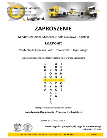 ZAPROSZENIE Międzyuczelniane Studenckie Koło Naukowe Logistyki LogPoint Politechniki Opolskiej oraz Uniwersytetu Opolskiego Ma zaszczyt zaprosić na Ogólnopolską Konferencję Logistyczną Której tematem przewodnim będzie: Koordynacja Organizacja i Transport w Logistyce Opole, 9-10 maj 2013 r. www.logpoint.po.opole.pl | [email protected] tel. 668 223 474 Studenckie Koło Naukowe Logistyki - LogPoint Strona 1 W dniach 9-10 maja 2013 roku LogPoint organizuje konferencję logistyczną. Odbędzie się ona w budynku Politechniki Opolskiej. Konferencja będzie składać się z 3 części: Wykładowa – na której to zaproszone przedsiębiorstwa z województwa opolskiego zaprezentują działania logistyczne w zakresie organizacji, koordynacji i transportu Turystyczna – w czasie której będzie można poznać uroki Stolicy Polskiej Piosenki oraz odwiedzić opolskie firmy Warsztatowa – doskonaląca przekazaną w czasie wykładów wiedzę w aspekcie praktycznym Organizowana przez nas konferencja ma przede wszystkim na celu wymianę doświadczeń w dziedzinie logistyki oraz zacieśnianie współpracy i więzów między kołami logistycznymi różnych uczelni. W czasie konferencji skupimy się na omówieniu zagadnień związanych z logistyczną działalnością czołowych firm działających na Opolszczyźnie. Przykładowo jeden z wykładów będzie poświęcony koordynacji autokarów liniowych na przykładzie firmy Sindbad - lidera przewozów międzynarodowych na polskim rynku. www.logpoint.po.opole.pl | [email protected] tel. 668 223 474 Studenckie Koło Naukowe Logistyki - LogPoint Strona 2 UCZESTNICTWO TERMINY i INFORMACJE Opłata konferencyjna: 70 zł Maksymalna ilość uczestników z jednego koła: 5 osób1 Termin nadsyłania zgłoszeń: do 17 marca 2013r. Termin wniesienia opłaty: do 31 marca 2013r.2 KONTAKT Przewodnicząca koła Lucyna Skrzypczyk [email protected] tel. 606 928 133 Koordynator ds. kontaktu z uczestnikami Piotr Partyka [email protected] tel. 668 223 474 INFORMACJE DODATKOWE Szczegółowe informacje dostępne na stronach: facebook.com/sknlogpoint logpoint.po.opole.pl Po zgłoszeniu uczestnictwa informacje będą również wysyłane na bieżąco do kół. Pytania prosimy kierować do koordynatora ds. kontaktu lub przewodniczącej koła. Formularz zgłoszeniowy w załączniku. Pozdrawiamy, zespół LogPoint 1 2 Ilość planowa, w przypadku chęci zgłoszenia większej ilości uczestników prosimy o kontakt Dane do przelewu zostaną przesłane drogą mailową po zgłoszeniu chęci uczestnictwa www.logpoint.po.opole.pl | [email protected] tel. 668 223 474 Studenckie Koło Naukowe Logistyki - LogPoint Strona 3