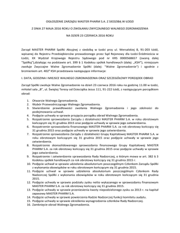 OGŁOSZENIE ZARZĄDU MASTER PHARM S.A. Z SIEDZIBĄ W ŁODZI Z DNIA 27 MAJA 2016 ROKU O ZWOŁANIU ZWYCZAJNEGO WALNEGO ZGROMADZENIA NA DZIEŃ 23 CZERWCA 2016 ROKU Zarząd MASTER PHARM Spółki Akcyjnej z siedzibą w Łodzi przy ul. Wersalskiej 8, 91-203 Łódź, wpisanej do Rejestru Przedsiębiorców prowadzonego przez Sąd Rejonowy dla Łodzi-Śródmieścia w Łodzi, XX Wydział Krajowego Rejestru Sądowego pod nr KRS 0000568657 (zwaną dalej "Spółką"),działając na podstawie art. 399 § 1 Kodeksu spółek handlowych (dalej: „KSH”), niniejszym zwołuje Zwyczajne Walne Zgromadzenie Spółki (dalej: "Walne Zgromadzenie") i zgodnie z brzmieniem art. 402² KSH przedstawia następujące informacje: I. DATA, GODZINA I MIEJSCE WALNEGO ZGROMADZENIA ORAZ SZCZEGÓŁOWY PORZĄDEK OBRAD Zarząd Spółki zwołuje Walne Zgromadzenie na dzień 23 czerwca 2016 roku na godzinę 11.00 w Łodzi, mHotel sala „B”, ul. Świętej Teresy od Dzieciątka Jezus 111, 91-222 Łódź, z następującym porządkiem obrad: 1. Otwarcie Walnego Zgromadzenia. 2. Wybór Przewodniczącego Walnego Zgromadzenia. 3. Stwierdzenie prawidłowości zwołania Walnego Zgromadzenia i jego zdolności do podejmowania uchwał. 4. Podjęcie uchwały w sprawie przyjęcia porządku obrad Walnego Zgromadzenia. 5. Rozpatrzenie sprawozdania Zarządu z działalności MASTER PHARM S.A. w roku obrotowym kończącym się 31 grudnia 2015 oraz podjęcie uchwały w sprawie jego zatwierdzenia. 6. Rozpatrzenie sprawozdania finansowego MASTER PHARM S.A. za rok obrotowy kończący się 31 grudnia 2015 oraz podjęcie uchwały w sprawie jego zatwierdzenia. 7. Rozpatrzenie sprawozdania Zarządu z działalności Grupy Kapitałowej MASTER PHARM S.A. w roku obrotowym kończącym się 31 grudnia 2015 oraz podjęcie uchwały w sprawie jego zatwierdzenia. 8. Rozpatrzenie skonsolidowanego sprawozdania finansowego Grupy Kapitałowej MASTER PHARM S.A. za rok obrotowy kończący się 31 grudnia 2015 oraz podjęcie uchwały w sprawie jego zatwierdzenia. 9. Rozpatrzenie i zatwierdzenie sprawozdania Rady Nadzorczej, o którym mowa w art. 382 § 3 Kodeksu spółek handlowych za rok obrotowy kończący się 31 grudnia 2015 r. 10. Podjęcie uchwał w sprawie udzielenia absolutorium poszczególnym Członkom Zarządu Spółki z wykonania obowiązków w roku obrotowym kończącym się 31 grudnia 2015. 11. Podjęcie uchwał w sprawie udzielenia absolutorium poszczególnym Członkom Rady Nadzorczej Spółki z wykonania obowiązków w roku obrotowym kończącym się 31 grudnia 2015. 12. Podjęcie uchwały w sprawie podziału zysku netto wykazanego w sprawozdaniu finansowym MASTER PHARM S.A. za rok obrotowy kończący się 31 grudnia 2015. 13. Podjęcie uchwały w sprawie przeniesienia kwoty niepodzielonego zysku za 2013 r. na kapitał zapasowy MASTER PHARM S.A. 14. Podjęcie uchwały w sprawie powierzenia Radzie Nadzorczej funkcji komitetu audytu. 15. Podjęcie uchwały w sprawie określenia wynagrodzenia członków Rady Nadzorczej. 16. Zamknięcie obrad Walnego Zgromadzenia. II. DZIEŃ REJESTRACJI UCZESTNICTWA W WALNYM ZGROMADZENIU ORAZ INFORMACJA O PRAWIE UCZESTNICTWA W WALNYM ZGROMADZENIU Stosownie do art. 406¹ § 1 KSH dzień rejestracji uczestnictwa w Walnym Zgromadzeniu przypada na szesnaście dni przed datą Walnego Zgromadzenia, tj. na dzień 7 czerwca 2016 r. Prawo uczestniczenia w Walnym Zgromadzeniu mają tylko osoby będące Akcjonariuszami Spółki w dniu 7 czerwca 2016 roku, tj. w dniu rejestracji uczestnictwa w Walnym Zgromadzeniu. Akcjonariusz w celu udziału w Walnym Zgromadzeniu, powinien zażądać, nie wcześniej niż po ogłoszeniu o zwołaniu Walnego Zgromadzenia i nie później niż w pierwszym dniu powszednim po dniu rejestracji uczestnictwa w Walnym Zgromadzeniu, to jest nie później niż 8 czerwca 2016 r. od podmiotu prowadzącego rachunek papierów wartościowych wystawienia imiennego zaświadczenia o prawie uczestnictwa w Walnym Zgromadzeniu. Zaświadczenie powinno zawierać wszystkie informacje, o których mowa w art. 406³ § 3 KSH., to jest: 1) firmę (nazwę), siedzibę, adres i pieczęć wystawiającego oraz numer zaświadczenia, 2) liczbę akcji, 3) rodzaj i kod akcji, 4) firmę (nazwę), siedzibę i adres spółki, która wyemitowała akcje, 5) wartość nominalną akcji, 6) imię i nazwisko albo firmę (nazwę) uprawnionego z akcji, 7) siedzibę (miejsce zamieszkania) i adres uprawnionego z akcji, 8) cel wystawienia zaświadczenia, 9) datę i miejsce wystawienia zaświadczenia, 10) podpis osoby upoważnionej do wystawienia zaświadczenia. Listę Akcjonariuszy uprawnionych do uczestnictwa w Walnym Zgromadzeniu, Zarząd Spółki ustala na podstawie wykazu sporządzonego przez Krajowy Depozyt Papierów Wartościowych S.A. zgodnie z przepisami o obrocie instrumentami finansowymi. Akcjonariusz Spółki może przenosić akcje w okresie między dniem rejestracji uczestnictwa w Walnym Zgromadzeniu a dniem zakończenia Walnego Zgromadzenia. Akcjonariusz na Walnym Zgromadzeniu winien dysponować dokumentem stwierdzającym jego tożsamość. Akcjonariusz niebędący osobą fizyczną może uczestniczyć w Walnym Zgromadzeniu oraz wykonywać prawo głosu przez osobę uprawnioną do składania oświadczeń woli w jego imieniu lub przez pełnomocnika. Osoby uprawnione do uczestniczenia w Walnym Zgromadzeniu proszone są o dokonanie rejestracji i pobranie kart do głosowania bezpośrednio przed salą obrad na 30 minut przed rozpoczęciem obrad. III. PROCEDURY DOTYCZĄCE UCZESTNICZENIA W WALNYM ZGROMADZENIU I WYKONYWANIA PRAWA GŁOSU 1. Informacja o prawie Akcjonariusza do żądania umieszczenia określonych spraw w porządku obrad Walnego Zgromadzenia. Akcjonariusz lub Akcjonariusze, którzy reprezentują co najmniej jedną dwudziestą kapitału zakładowego Spółki mogą żądać umieszczenia określonych spraw w porządku obrad Walnego Zgromadzenia. Żądanie Akcjonariusza lub Akcjonariuszy powinno zostać zgłoszone Zarządowi Spółki nie p