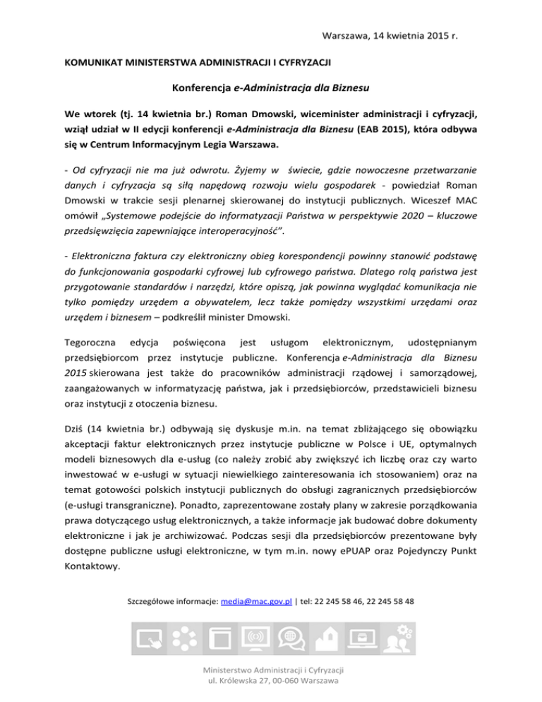 Warszawa, 14 kwietnia 2015 r. KOMUNIKAT MINISTERSTWA ADMINISTRACJI I CYFRYZACJI Konferencja e-Administracja dla Biznesu We wtorek (tj. 14 kwietnia br.) Roman Dmowski, wiceminister administracji i cyfryzacji, wziął udział w II edycji konferencji e-Administracja dla Biznesu (EAB 2015), która odbywa się w Centrum Informacyjnym Legia Warszawa. - Od cyfryzacji nie ma już odwrotu. Żyjemy w świecie, gdzie nowoczesne przetwarzanie danych i cyfryzacja są siłą napędową rozwoju wielu gospodarek - powiedział Roman Dmowski w trakcie sesji plenarnej skierowanej do instytucji publicznych. Wiceszef MAC omówił „Systemowe podejście do informatyzacji Państwa w perspektywie 2020 – kluczowe przedsięwzięcia zapewniające interoperacyjność”. - Elektroniczna faktura czy elektroniczny obieg korespondencji powinny stanowić podstawę do funkcjonowania gospodarki cyfrowej lub cyfrowego państwa. Dlatego rolą państwa jest przygotowanie standardów i narzędzi, które opiszą, jak powinna wyglądać komunikacja nie tylko pomiędzy urzędem a obywatelem, lecz także pomiędzy wszystkimi urzędami oraz urzędem i biznesem – podkreślił minister Dmowski. Tegoroczna edycja poświęcona jest usługom elektronicznym, udostępnianym przedsiębiorcom przez instytucje publiczne. Konferencja e-Administracja dla Biznesu 2015 skierowana jest także do pracowników administracji rządowej i samorządowej, zaangażowanych w informatyzację państwa, jak i przedsiębiorców, przedstawicieli biznesu oraz instytucji z otoczenia biznesu. Dziś (14 kwietnia br.) odbywają się dyskusje m.in. na temat zbliżającego się obowiązku akceptacji faktur elektronicznych przez instytucje publiczne w Polsce i UE, optymalnych modeli biznesowych dla e-usług (co należy zrobić aby zwiększyć ich liczbę oraz czy warto inwestować w e-usługi w sytuacji niewielkiego zainteresowania ich stosowaniem) oraz na temat gotowości polskich instytucji publicznych do obsługi zagranicznych przedsiębiorców (e-usługi transgraniczne). Ponadto, zaprezentowane zostały plany w zakresie porządkowania prawa dotyczącego usług elektronicznych, a także informacje jak budować dobre dokumenty elektroniczne i jak je archiwizować. Podczas sesji dla przedsiębiorców prezentowane były dostępne publiczne usługi elektroniczne, w tym m.in. nowy ePUAP oraz Pojedynczy Punkt Kontaktowy. Szczegółowe informacje: [email protected] | tel: 22 245 58 46, 22 245 58 48 Ministerstwo Administracji i Cyfryzacji ul. Królewska 27, 00-060 Warszawa Jutrzejsze sesje (środa 15.04. br.) poświęcone będą transgranicznym e-usługom. Zaprezentowane zostaną działania administracji w Polsce zmierzające do integracji krajowych systemów informatycznych z systemami innych krajów UE. Zwieńczeniem każdego dnia konferencji jest dyskusja przedstawicieli świata administracji, sądownictwa i przedsiębiorców na temat oceny i oczekiwań świata biznesu w zakresie eusług. Konferencja jest współorganizowana przez Instytut Logistyki i Magazynowania, Ministerstwo Administracji i Cyfryzacji oraz Ministerstwo Gospodarki. Artur Koziołek rzecznik prasowy Ministerstwa Administracji i Cyfryzacji Ministerstwo Administracji i Cyfryzacji ul. Królewska 27, 00-060 Warszawa