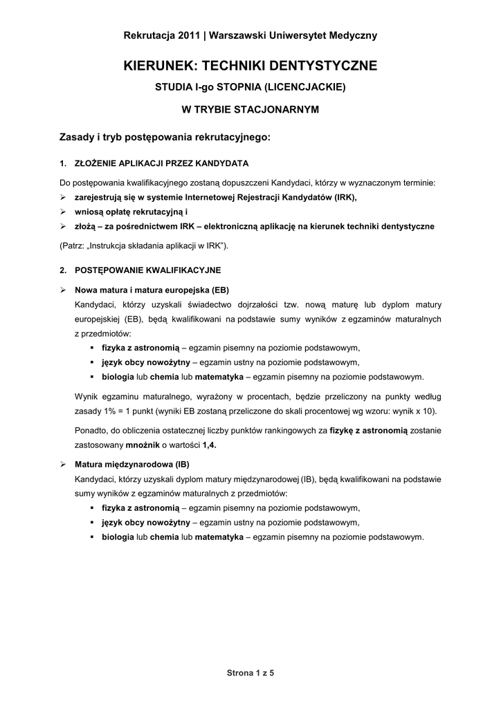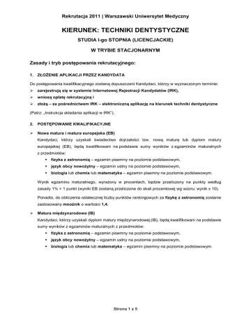 Rekrutacja 2011 | Warszawski Uniwersytet Medyczny KIERUNEK: TECHNIKI DENTYSTYCZNE STUDIA I-go STOPNIA (LICENCJACKIE) W TRYBIE STACJONARNYM Zasady i tryb postępowania rekrutacyjnego: 1. ZŁOŻENIE APLIKACJI PRZEZ KANDYDATA Do postępowania kwalifikacyjnego zostaną dopuszczeni Kandydaci, którzy w wyznaczonym terminie: zarejestrują się w systemie Internetowej Rejestracji Kandydatów (IRK), wniosą opłatę rekrutacyjną i złożą – za pośrednictwem IRK – elektroniczną aplikację na kierunek techniki dentystyczne (Patrz: „Instrukcja składania aplikacji w IRK”). 2. POSTĘPOWANIE KWALIFIKACYJNE Nowa matura i matura europejska (EB) Kandydaci, którzy uzyskali świadectwo dojrzałości tzw. nową maturę lub dyplom matury europejskiej (EB), będą kwalifikowani na podstawie sumy wyników z egzaminów maturalnych z przedmiotów: fizyka z astronomią – egzamin pisemny na poziomie podstawowym, język obcy nowożytny – egzamin ustny na poziomie podstawowym, biologia lub chemia lub matematyka – egzamin pisemny na poziomie podstawowym. Wynik egzaminu maturalnego, wyrażony w procentach, będzie przeliczony na punkty według zasady 1% = 1 punkt (wyniki EB zostaną przeliczone do skali procentowej wg wzoru: wynik x 10). Ponadto, do obliczenia ostatecznej liczby punktów rankingowych za fizykę z astronomią zostanie zastosowany mnożnik o wartości 1,4. Matura międzynarodowa (IB) Kandydaci, którzy uzyskali dyplom matury międzynarodowej (IB), będą kwalifikowani na podstawie sumy wyników z egzaminów maturalnych z przedmiotów: fizyka z astronomią – egzamin pisemny na poziomie podstawowym, język obcy nowożytny – egzamin ustny na poziomie podstawowym, biologia lub chemia lub matematyka – egzamin pisemny na poziomie podstawowym. Strona 1 z 5 Rekrutacja 2011 | Warszawski Uniwersytet Medyczny Zasady przeliczania na punkty ocen z matury międzynarodowej przedstawia poniższa tabela: „matura międzynarodowa” IB wynik z przedmiotu na świadectwie punkty kwalifikacyjne (*) 2 38 3 53 4 66 5 78 6 89 7 98 (*) liczba punktów jest wartością środkową przedziału odpowiadającego ocenie Ponadto, do obliczenia ostatecznej liczby punktów rankingowych za fizykę z astronomią zostanie zastosowany mnożnik o wartości 1,4. Stara matura i matura uzyskana za granicą Kandydaci, którzy uzyskali świadectwo dojrzałości tzw. starą maturę lub świadectwo maturalne poza granicami Polski, będą kwalifikowani na podstawie sumy wyników z egzaminów maturalnych z przedmiotów: fizyka z astronomią – egzamin pisemny na poziomie podstawowym, język obcy nowożytny – egzamin ustny na poziomie podstawowym, biologia lub chemia lub matematyka – egzamin pisemny na poziomie podstawowym. Zasady przeliczania na punkty ocen ze „starej matury” i matury uzyskanej za granicą przedstawia poniższa tabela: Punkty kwalifikacyjne (*) * Ocena za przedmiot na polskim świadectwie dojrzałości „stara matura” Ocena na świadectwie dojrzałości lub maturalnym uzyskanym w innym kraju (**) 40 2 Mediocre (E) 61 3 Satisfactory (D) 78 4 Good (C) 90 5 Very good (B) 98 6 Excellent (A) liczba punktów jest wartością środkową przedziału odpowiadającego ocenie ** w przypadku innej skali ocen, zostanie zastosowana równoważna zasada Ponadto, do obliczenia ostatecznej liczby punktów rankingowych za fizykę z astronomią zostanie zastosowany mnożnik o wartości 1,4. Kandydatom ze „starą maturą”, którzy na podstawie uzyskanego certyfikatu byli zwolnieni ze zdawania egzaminu dojrzałości z języka obcego nowożytnego, przyznaje się za ten język liczbę punktów zależną od rodzaju certyfikatu i uzyskanego wyniku (patrz zakładka „Certyfikaty językowe”). W przypadku braku na świadectwie dojrzałości oceny z egzaminu z któregoś z wymaganych przedmiotów, Kandydat może przystąpić do Uczelnianego Egzaminu Wstępnego (UEW): pisemnego, równoważnego poziomowi podstawowemu „nowej matury”; do wyboru: biologia, chemia, fizyka z astronomią; ustnego; do wyboru: angielski, francuski, niemiecki, rosyjski. Strona 2 z 5 Rekrutacja 2011 | Warszawski Uniwersytet Medyczny Do UEW zostaną dopuszczeni Kandydaci, którzy w wyznaczonym terminie złożą w IRK aplikację z zaznaczonym podaniem o dopuszczenie do egzaminu z wybranego przedmiotu/języka. Wszyscy Kandydaci Dodatkowe kryterium: Kandydatom posiadającym dyplom zawodowy (uzyskany w liceum medycznym lub pomaturalnej szkole medycznej) określony przez Oddziałową Komisję Rekrutacyjną jako zgodny z wybranym kierunkiem studiów, przyznaje się dodatkowo 100 punktów rankingowych. Laureaci / finaliści etapu centralnego (najwyższego) olimpiad przedmiotowych − Kandydaci, którzy w 2010 lub 2011 r. uzyskali dyplom laureata lub finalisty etapu centralnego olimpiady przedmiotowej z biologii, chemii, fizyki, matematyki i/lub wiedzy ekologicznej oraz − Laureaci etapu centralnego pierwszych trzech miejsc regionalnej mazowieckiej olimpiady wiedzy przyrodniczej są plasowani na szczycie listy rankingowej – przysługuje im uprawnienie do przyjęcia na studia w pierwszej kolejności (UWAGA: uprawnienie do przyjęcia na studia w pierwszej kolejności wynikające z posiadania tytułu laureata lub finalisty olimpiady Kandydat może wykorzystać tylko jeden raz). − Laureaci i finaliści etapu centralnego olimpiad przedmiotowych z języka obcego nowożytnego oraz − Kandydaci, którzy uzyskali dyplom laureata lub finalisty etapu centralnego olimpiady przedmiotowej z biologii, chemii, fizyki i/lub matematyki w 2009 r. lub w latach wcześniejszych uzyskują w postępowaniu kwalifikacyjnym 100 punktów za określony przedmiot będący kryterium kwalifikacyjnym. Na podstawie wyników uzyskanych w postępowaniu kwalifikacyjnym przez wszystkich Kandydatów, zostanie utworzona jedna lista rankingowa dla danego kierunku. Kandydaci będą umieszczeni na tej liście w kolejności według malejącej liczby punktów. W oparciu o przyznane limity 