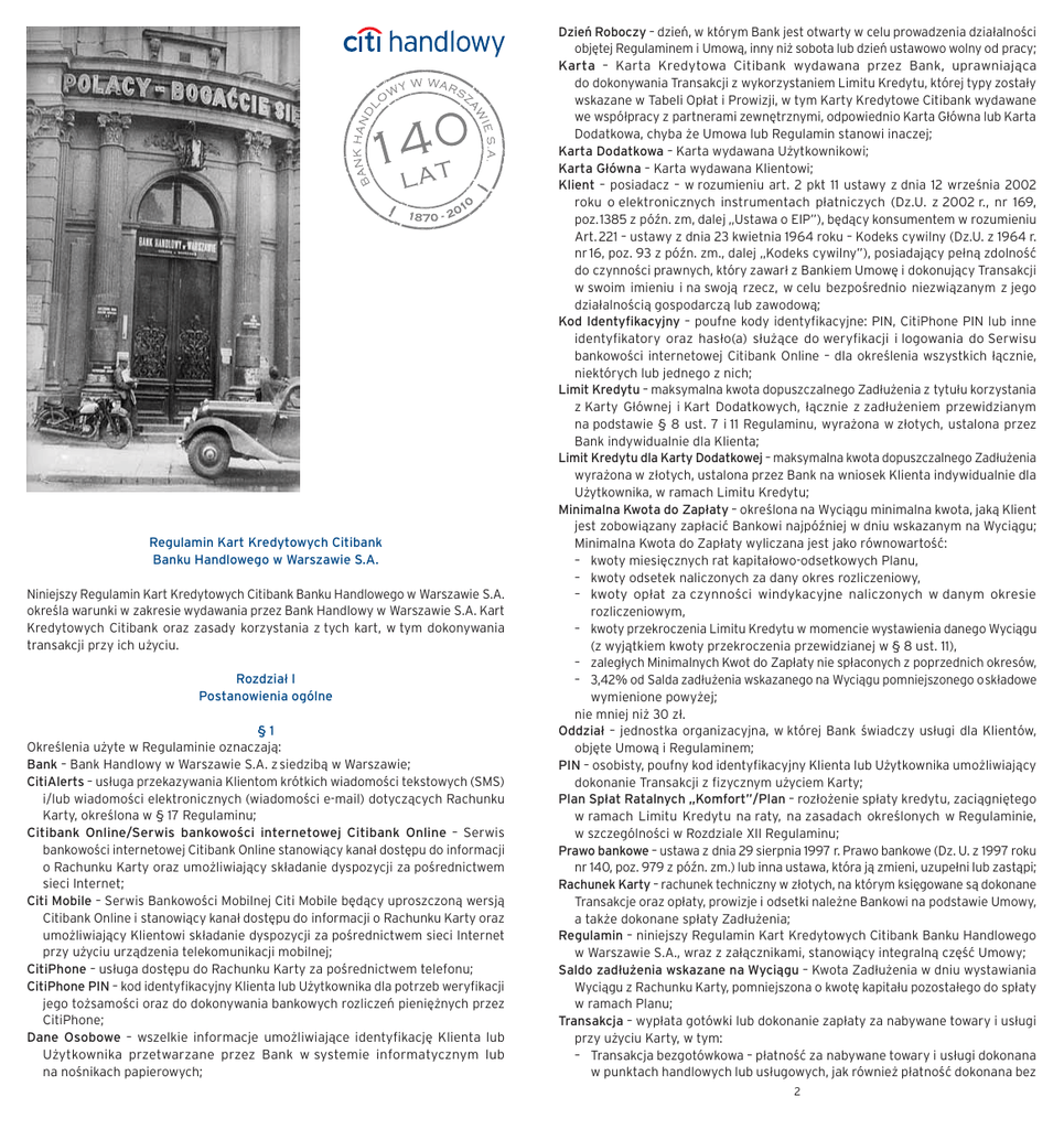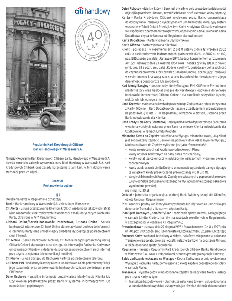 Regulamin Kart Kredytowych Citibank Banku Handlowego w Warszawie S.A. Niniejszy Regulamin Kart Kredytowych Citibank Banku Handlowego w Warszawie S.A. określa warunki w zakresie wydawania przez Bank Handlowy w Warszawie S.A. Kart Kredytowych Citibank oraz zasady korzystania z tych kart, w tym dokonywania transakcji przy ich użyciu. Rozdział I Postanowienia ogólne §1 Określenia użyte w Regulaminie oznaczają: Bank – Bank Handlowy w Warszawie S.A. z siedzibą w Warszawie; CitiAlerts – usługa przekazywania Klientom krótkich wiadomości tekstowych (SMS) i/lub wiadomości elektronicznych (wiadomości e-mail) dotyczących Rachunku Karty, określona w § 17 Regulaminu; Citibank Online/Serwis bankowości internetowej Citibank Online – Serwis bankowości internetowej Citibank Online stanowiący kanał dostępu do informacji o Rachunku Karty oraz umożliwiający składanie dyspozycji za pośrednictwem sieci Internet; Citi Mobile – Serwis Bankowości Mobilnej Citi Mobile będący uproszczoną wersją Citibank Online i stanowiący kanał dostępu do informacji o Rachunku Karty oraz umożliwiający Klientowi składanie dyspozycji za pośrednictwem sieci Internet przy użyciu urządzenia telekomunikacji mobilnej; CitiPhone – usługa dostępu do Rachunku Karty za pośrednictwem telefonu; CitiPhone PIN – kod identyfikacyjny Klienta lub Użytkownika dla potrzeb weryfikacji jego tożsamości oraz do dokonywania bankowych rozliczeń pieniężnych przez CitiPhone; Dane Osobowe – wszelkie informacje umożliwiające identyfikację Klienta lub Użytkownika przetwarzane przez Bank w systemie informatycznym lub na nośnikach papierowych; Dzień Roboczy – dzień, w którym Bank jest otwarty w celu prowadzenia działalności objętej Regulaminem i Umową, inny niż sobota lub dzień ustawowo wolny od pracy; Karta – Karta Kredytowa Citibank wydawana przez Bank, uprawniająca do dokonywania Transakcji z wykorzystaniem Limitu Kredytu, której typy zostały wskazane w Tabeli Opłat i Prowizji, w tym Karty Kredytowe Citibank wydawane we współpracy z partnerami zewnętrznymi, odpowiednio Karta Główna lub Karta Dodatkowa, chyba że Umowa lub Regulamin stanowi inaczej; Karta Dodatkowa – Karta wydawana Użytkownikowi; Karta Główna – Karta wydawana Klientowi; Klient – posiadacz – w rozumieniu art. 2 pkt 11 ustawy z dnia 12 września 2002 roku o elektronicznych instrumentach płatniczych (Dz.U. z 2002 r., nr 169, poz. 1385 z późn. zm, dalej „Ustawa o EIP”), będący konsumentem w rozumieniu Art. 221 – ustawy z dnia 23 kwietnia 1964 roku – Kodeks cywilny (Dz.U. z 1964 r. nr 16, poz. 93 z późn. zm., dalej „Kodeks cywilny”), posiadający pełną zdolność do czynności prawnych, który zawarł z Bankiem Umowę i dokonujący Transakcji w swoim imieniu i na swoją rzecz, w celu bezpośrednio niezwiązanym z jego działalnością gospodarczą lub zawodową; Kod Identyfikacyjny – poufne kody identyfikacyjne: PIN, CitiPhone PIN lub inne identyfikatory oraz hasło(a) służące do weryfikacji i logowania do Serwisu bankowości internetowej Citibank Online – dla określenia wszystkich łącznie, niektórych lub jednego z nich; Limit Kredytu – maksymalna kwota dopuszczalnego Zadłużenia z tytułu korzystania z Karty Głównej i Kart Dodatkowych, łącznie z zadłużeniem przewidzianym na podstawie § 8 ust. 7 i 11 Regulaminu, wyrażona w złotych, ustalona przez Bank indywidualnie dla Klienta; Limit Kredytu dla Karty Dodatkowej – maksymalna kwota dopuszczalnego Zadłużenia wyrażona w złotych, ustalona przez Bank na wniosek Klienta indywidualnie dla Użytkownika, w ramach Limitu Kredytu; Minimalna Kwota do Zapłaty – określona na Wyciągu minimalna kwota, jaką Klient jest zobowiązany zapłacić Bankowi najpóźniej w dniu wskazanym na Wyciągu; Minimalna Kwota do Zapłaty wyliczana jest jako równowartość: – kwoty miesięcznych rat kapitałowo-odsetkowych Planu, – kwoty odsetek naliczonych za dany okres rozliczeniowy, – kwoty opłat za czynności windykacyjne naliczonych w danym okresie rozliczeniowym, – kwoty przekroczenia Limitu Kredytu w momencie wystawienia danego Wyciągu (z wyjątkiem kwoty przekroczenia przewidzianej w § 8 ust. 11), – zaległych Minimalnych Kwot do Zapłaty nie spłaconych z poprzednich okresów, – 3,42% od Salda zadłużenia wskazanego na Wyciągu pomniejszonego o składowe wymienione powyżej; nie mniej niż 30 zł. Oddział – jednostka organizacyjna, w której Bank świadczy usługi dla Klientów, objęte Umową i Regulaminem; PIN – osobisty, poufny kod identyfikacyjny Klienta lub Użytkownika umożliwiający dokonanie Transakcji z fizycznym użyciem Karty; Plan Spłat Ratalnych „Komfort”/Plan – rozłożenie spłaty kredytu, zaciągniętego w ramach Limitu Kredytu na raty, na zasadach określonych w Regulaminie, w szczególności w Rozdziale XII Regulaminu; Prawo bankowe – ustawa z dnia 29 sierpnia 1997 r. Prawo bankowe (Dz. U. z 1997 roku nr 140, poz. 979 z późn. zm.) lub inna ustawa, która ją zmieni, uzupełni lub zastąpi; Rachunek Karty – rachunek techniczny w złotych, na którym księgowane są dokonane Transakcje oraz opłaty, prowizje i odsetki należne Bankowi na podstawie Umowy, a także dokonane spłaty Zadłużenia; Regulamin – niniejszy Regulamin Kart Kredytowych Citibank Banku Handlowego w Warszawie S.A., wraz z załącznikami, stanowiący integralną część Umowy; Saldo zadłużenia wskazane na Wyciągu – Kwota Zadłużenia w dniu wystawiania Wyciągu z Rachunku Karty, pomniejszona o kwotę kapitału pozostałego do spłaty w ramach Planu; Transakcja – wypłata gotówki lub dokonanie zapłaty za nabywane towary i usługi przy użyciu Karty, w tym: – Transakcja bezgotówkowa – płatność za nabywane towary i usługi dokonana w punktach handlowych lub usługowych, jak również płatność dokonana bez 2 fizycznego użycia Karty, w szczególności zamówienia składane listownie,