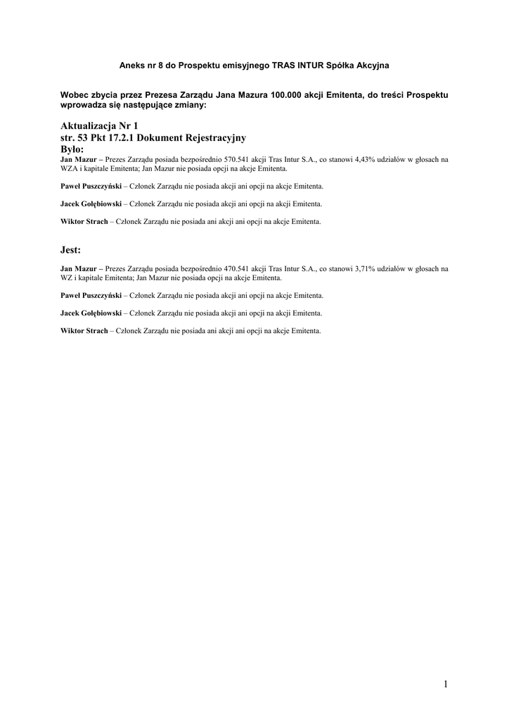 Aneks nr 8 do Prospektu emisyjnego TRAS INTUR Spółka Akcyjna Wobec zbycia przez Prezesa Zarządu Jana Mazura 100.000 akcji Emitenta, do treści Prospektu wprowadza się następujące zmiany: Aktualizacja Nr 1 str. 53 Pkt 17.2.1 Dokument Rejestracyjny Było: Jan Mazur – Prezes Zarządu posiada bezpośrednio 570.541 akcji Tras Intur S.A., co stanowi 4,43% udziałów w głosach na WZA i kapitale Emitenta; Jan Mazur nie posiada opcji na akcje Emitenta. Paweł Puszczyński – Członek Zarządu nie posiada akcji ani opcji na akcje Emitenta. Jacek Gołębiowski – Członek Zarządu nie posiada akcji ani opcji na akcji Emitenta. Wiktor Strach – Członek Zarządu nie posiada ani akcji ani opcji na akcje Emitenta. Jest: Jan Mazur – Prezes Zarządu posiada bezpośrednio 470.541 akcji Tras Intur S.A., co stanowi 3,71% udziałów w głosach na WZ i kapitale Emitenta; Jan Mazur nie posiada opcji na akcje Emitenta. Paweł Puszczyński – Członek Zarządu nie posiada akcji ani opcji na akcje Emitenta. Jacek Gołębiowski – Członek Zarządu nie posiada akcji ani opcji na akcji Emitenta. Wiktor Strach – Członek Zarządu nie posiada ani akcji ani opcji na akcje Emitenta. 1