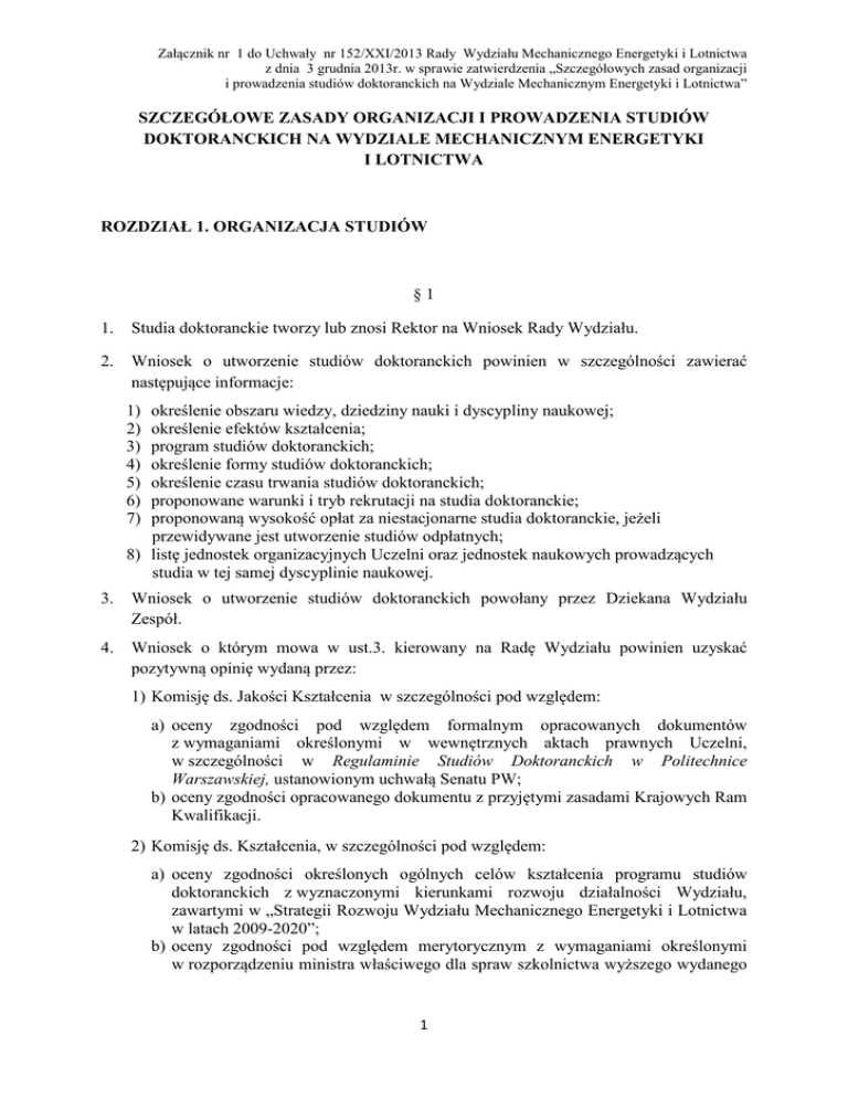 Załącznik nr 1 do Uchwały nr 152/XXI/2013 Rady Wydziału Mechanicznego Energetyki i Lotnictwa z dnia 3 grudnia 2013r. w sprawie zatwierdzenia „Szczegółowych zasad organizacji i prowadzenia studiów doktoranckich na Wydziale Mechanicznym Energetyki i Lotnictwa” SZCZEGÓŁOWE ZASADY ORGANIZACJI I PROWADZENIA STUDIÓW DOKTORANCKICH NA WYDZIALE MECHANICZNYM ENERGETYKI I LOTNICTWA ROZDZIAŁ 1. ORGANIZACJA STUDIÓW §1 1. Studia doktoranckie tworzy lub znosi Rektor na Wniosek Rady Wydziału. 2. Wniosek o utworzenie studiów doktoranckich powinien w szczególności zawierać następujące informacje: 1) 2) 3) 4) 5) 6) 7) określenie obszaru wiedzy, dziedziny nauki i dyscypliny naukowej; określenie efektów kształcenia; program studiów doktoranckich; określenie formy studiów doktoranckich; określenie czasu trwania studiów doktoranckich; proponowane warunki i tryb rekrutacji na studia doktoranckie; proponowaną wysokość opłat za niestacjonarne studia doktoranckie, jeżeli przewidywane jest utworzenie studiów odpłatnych; 8) listę jednostek organizacyjnych Uczelni oraz jednostek naukowych prowadzących studia w tej samej dyscyplinie naukowej. 3. Wniosek o utworzenie studiów doktoranckich powołany przez Dziekana Wydziału Zespół. 4. Wniosek o którym mowa w ust.3. kierowany na Radę Wydziału powinien uzyskać pozytywną opinię wydaną przez: 1) Komisję ds. Jakości Kształcenia w szczególności pod względem: a) oceny zgodności pod względem formalnym opracowanych dokumentów z wymaganiami określonymi w wewnętrznych aktach prawnych Uczelni, w szczególności w Regulaminie Studiów Doktoranckich w Politechnice Warszawskiej, ustanowionym uchwałą Senatu PW; b) oceny zgodności opracowanego dokumentu z przyjętymi zasadami Krajowych Ram Kwalifikacji. 2) Komisję ds. Kształcenia, w szczególności pod względem: a) oceny zgodności określonych ogólnych celów kształcenia programu studiów doktoranckich z wyznaczonymi kierunkami rozwoju działalności Wydziału, zawartymi w „Strategii Rozwoju Wydziału Mechanicznego Energetyki i Lotnictwa w latach 2009-2020”; b) oceny zgodności pod względem merytorycznym z wymaganiami określonymi w rozporządzeniu ministra właściwego dla spraw szkolnictwa wyższego wydanego 1 Załącznik nr 1 do Uchwały nr 152/XXI/2013 Rady Wydziału Mechanicznego Energetyki i Lotnictwa z dnia 3 grudnia 2013r. w sprawie zatwierdzenia „Szczegółowych zasad organizacji i prowadzenia studiów doktoranckich na Wydziale Mechanicznym Energetyki i Lotnictwa” w sprawie kształcenia na studiach doktoranckich w uczelniach i jednostkach naukowych; c) oceny zapewnienia możliwości pod względem infrastruktury dydaktycznej i naukowej, możliwości kadrowych prawidłowego funkcjonowania studiów doktoranckich. 5. Wniosek o którym mowa w ust.3 powinien uzyskać akceptację Dziekana Wydziału. §2 1. 2. 3. Wydział Mechaniczny Energetyki i Lotnictwa (zwany dalej Wydziałem) prowadzi studia doktoranckie w dziedzinie nauk technicznych. Wydział prowadzi studia doktoranckie w następujących dyscyplinach naukowych: 1) Automatyka i Robotyka; 2) Budowa i Eksploatacja Maszyn; 3) Energetyka; 4) Mechanika. Wydział prowadzi studia doktoranckie w formie studiów stacjonarnych i niestacjonarnych w języku polskim i angielskim. §3 1. 2. 3. Studia doktoranckie prowadzone na Wydziale są realizowane według ramowych programów kształcenia w danej dyscyplinie zatwierdzonych przez Radę Wydziału. Studia doktoranckie trwają 4 lata. W szczególnych przypadkach, o których mowa w §5 ust.6 i 7 Rozdziału 5. „Zasady studiowania” Kierownik Studiów może podjąć decyzję o przedłużeniu okresu studiów. Studia doktoranckie obejmują: 1) uczestniczenie w programowych (obowiązkowych i fakultatywnych) zajęciach dydaktycznych oraz uzyskiwanie zaliczeń przedmiotów i innych rygorów zgodnie z planem studiów; 2) realizację badań naukowych zgodnie z wcześniej opracowanym szczegółowym harmonogramem, stanowiącym podstawę do przygotowania rozprawy doktorskiej; 3) przeprowadzenie określonej liczby godzin zajęć dydaktycznych w formie praktyki zawodowej, w celu przygotowania do wykonywania zawodu nauczyciela akademickiego. §4 1. Przyjętym systemem organizacji prowadzonych przez Wydział studiów jest Elastyczny System Studiów. System ten zakłada elastyczność tematyki studiów, miejsca, okresu trwania studiów. 2 Załącznik nr 1 do Uchwały nr 152/XXI/2013 Rady Wydziału Mechanicznego Energetyki i Lotnictwa z dnia 3 grudnia 2013r. w sprawie zatwierdzenia „Szczegółowych zasad organizacji i prowadzenia studiów doktoranckich na Wydziale Mechanicznym Energetyki i Lotnictwa” 2. W przypadku studiów doktoranckich warunki zapewnienia elastyczności systemu studiów realizowane są na Wydziale poprzez 1) zapewnienie elastyczności poprzez: a) wyboru specjalności naukowej w ramach określonej dyscypliny naukowej, w jakiej będzie pisana rozprawa doktorska; b) wyboru przedmiotów realizowanych w ramach programu kształcenia oferowanych w Uczelnianej Ofercie Dydaktycznej dla doktorantów; 2) zapewnienie elastyczności miejsca studiowania – umożliwienie doktorantom: a) odbywanie części studiów doktoranckich w innej jednostce uprawnionej do prowadzenia studiów w ramach tej samej lub pokrewnej dyscypliny naukowej; b) udziału w zajęciach prowadzonych poza Wydziałem • ramach w Uczelnianej Ofercie Dydaktycznej, • zajęciach prowadzonych na innym wydziale, nie stanowiących Uczelnianą Ofertę Dydaktyczną, • udziału w zajęciach prowadzonych na innej Uczelni, • zapewnienie możliwości samodzielnego studiowania pod nadzorem opiekuna; 3) zapewnienie elastyczności czasu studiowania – na zasadach określonych w obowiązującym w tym zakresie aktach prawnych Wydziału MEiL i Uczelni. §5 Na Wydziale we wszystkich formach prowadzonych studiów doktoranckich stosuje się System Akumulacji i Transferu Punktów. Poszczególnym modułom kształceni