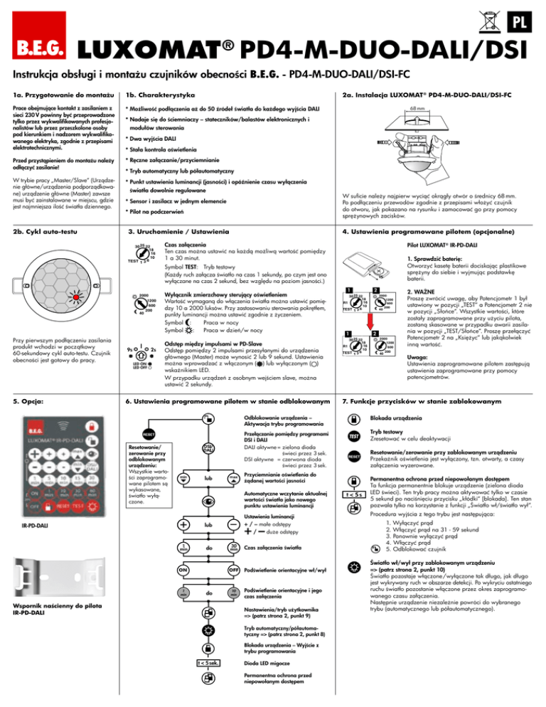 PL LUXOMAT ® PD4-M-DUO-DALI/DSI Instrukcja obsługi i montażu czujników obecności B.E.G. - PD4-M-DUO-DALI/DSI-FC 1a. Przygotowanie do montażu 1b. Charakterystyka Prace obejmujące kontakt z zasilaniem z sieci 230 V powinny być przeprowadzone tylko przez wykwalifikowanych profesjonalistów lub przez przeszkolone osoby pod kierunkiem i nadzorem wykwalifikowanego elektryka, zgodnie z przepisami elektrotechnicznymi. * Możliwość podłączenia aż do 50 źródeł światła do każdego wyjścia DALI Przed przystąpieniem do montażu należy odłączyć zasilanie! * Ręczne załączanie/przyciemnianie W trybie pracy „Master/Slave” (Urządzenie główne/urządzenia podporządkowane) urządzenie główne (Master) zawsze musi być zainstalowane w miejscu, gdzie jest najmniejsza ilość światła dziennego. * Punkt ustawienia luminancji (jasności) i opóźnienie czasu wyłączenia 2b. Cykl auto-testu 5. Opcja: 68 mm * Nadaje się do ściemniaczy – stateczników/balastów elektronicznych i modułów sterowania * Dwa wyjścia DALI * Stała kontrola oświetlenia * Tryb automatyczny lub półautomatyczny światła dowolnie regulowane W suficie należy najpierw wyciąć okrągły otwór o średnicy 68 mm. Po podłączeniu przewodów zgodnie z przepisami włożyć czujnik do otworu, jak pokazano na rysunku i zamocować go przy pomocy sprężynowych zacisków. * Sensor i zasilacz w jednym elemencie * Pilot na podczerwień 60 3A.120 Uruchomienie / Ustawienia 50 40 30 15 305251022 18 16 R1 10 6 TEST 1 3 16 10 5 2 1 TEST 15 30 2000 1200 600 200 40 Przy pierwszym podłączeniu zasilania produkt wchodzi w początkowy 60-sekundowy cykl auto-testu. Czujnik obecności jest gotowy do pracy. 2a. Instalacja LUXOMAT ® PD4-M-DUO-DALI/DSI-FC 9s 2s LED ON LED OFF 4. Ustawienia programowane pilotem (opcjonalne) Czas załączenia Ten czas można ustawić na każdą możliwą wartość pomiędzy 1 a 30 minut. Symbol TEST: Tryb testowy (Każdy ruch załącza światło na czas 1 sekundy, po czym jest ono wyłączane na czas 2 sekund, bez względu na poziom jasności.) Wyłącznik zmierzchowy sterujący oświetleniem Wartość wymaganą do włączenia światła można ustawić pomiędzy 10 a 2000 luksów. Przy zastosowaniu sterowania pokrętłem, punkty luminancji można ustawić zgodnie z życzeniem. Symbol : Praca w nocy Symbol : Praca w dzień/w nocy Odstęp między impulsami w PD-Slave Odstęp pomiędzy 2 impulsami przesyłanymi do urządzenia głównego (Master) może wynosić 2 lub 9 sekund. Ustawienia można wprowadzać z włączonym ( ) lub wyłączonym ( ) wskaźnikiem LED. W przypadku urządzeń z osobnym wejściem slave, można ustawić 2 sekundy. 6. U stawienia programowane pilotem w stanie odblokowanym Resetowanie/ zerowanie przy odblokowanym urządzeniu: Wszystkie wartości zaprogramowane pilotem są wykasowane, światło wyłączone. IR-PD-DALI 30 25 22 18 16 R1 10 TEST 1 3 6 1 2 2000 1200 600 200 40 2 2000 1200 600 200 40 30 25 22 18 16 R1 10 TEST 1 3 6 2. WAŻNE Proszę zwrócić uwagę, aby Potencjometr 1 był ustawiony w pozycji „TEST” a Potencjometr 2 nie w pozycji „Słońce”. Wszystkie wartości, które zostały zaprogramowane przy użyciu pilota, zostaną skasowane w przypadku awarii zasilania w pozycji „TEST/Słońce”. Proszę przełączyć Potencjometr 2 na „Księżyc” lub jakąkolwiek inną wartość. Uwaga: Ustawienia zaprogramowane pilotem zastępują ustawienia zaprogramowane przy pomocy potencjometrów. 7. Funkcje przycisków w stanie zablokowanym Tryb testowy Zresetować w celu deaktywacji DSI/ DALI lub Przyciemnianie oświetlenia do żądanej wartości jasności + lub 1 min max do – max50 Lux 30 min 50 Ustawienia luminancji Lux + / – małe odstępy / duże odstępy 1500 + – do 10 min Wspornik naścienny do pilota IR-PD-DALI Lux Podświetlenie orientacyjne wł/wył Podświetlenie orientacyjne OFF i jego czas załączenia Tryb automatyczny/półautomatyczny => (patrz strona 2, punkt 8) t < 5 sek. 1500 Lux t < 5s Permanentna ochrona przed niepowołanym dostępem Ta funkcja permanentnie blokuje urządzenie (zielona dioda LED świeci). Ten tryb pracy można aktywować tylko w czasie 5 sekund po naciśnięciu przycisku „kłódki” [blokada]. Ten stan pozwala tylko na korzystanie z funkcji „Światło wł/światło wył”. Procedura wyjścia z tego trybu jest następująca: 50 Lux 1500 Lux 1. Wyłączyć prąd 2. Włączyć prąd na 31 - 59 sekund 3. Ponownie wyłączyć prąd 4. Włączyć prąd 5. Odblokować czujnik max Nastawienia/tryb użytkownika => (patrz strona 2, punkt 9) 50 Lux Resetowanie/zerowanie przy zablokowanym urządzeniu Przekaźnik oświetlenia jest wyłączony, tzn. otwarty, a czasy załączenia wyzerowane. 1500 Lux Czas załączenia światła ON OFF OFF OFF 1 Przełączanie pomiędzy programami DSI i DALI DALI aktywne= z ielona dioda świeci przez 3 sek. DSI aktywne = c zerwona dioda świeci przez 3 sek. ON ON 5 2 1 TEST 15 30 1. Sprawdzić baterię: Otworzyć kasetę baterii dociskając plastikowe sprężyny do siebie i wyjmując podstawkę baterii. Blokada urządzenia Automatyczne wczytanie aktualnej wartości światła jako nowego punktu ustawienia luminancji 1 min 16 10 Pilot LUXOMAT® IR-PD-DALI Odblokowanie urządzenia – Aktywacja trybu programowania ON max 120 60 50 A 40 30 15 5 10 Blokada urządzenia – Wyjście z trybu programowania Dioda LED migocze Permanentna ochrona przed niepowołanym dostępem Światło wł/wył przy zablokowanym urządzeniu => (patrz strona 2, punkt 10) Światło pozostaje włączone /wyłączone tak długo, jak długo jest wykrywany ruch w obszarze detekcji. Po wykryciu ostatniego ruchu światło pozostanie włączone przez okres zaprogramowanego czasu załączenia. Następnie urządzenie niezależnie powróci do wybranego trybu (automatycznego lub półautomatycznego). ON 8. Tryb automatyczny i półautomatyczny OFF (funkcje pilota IR-PDim – patrz strona 1) System przełącza się, gdy przycisk „Ś