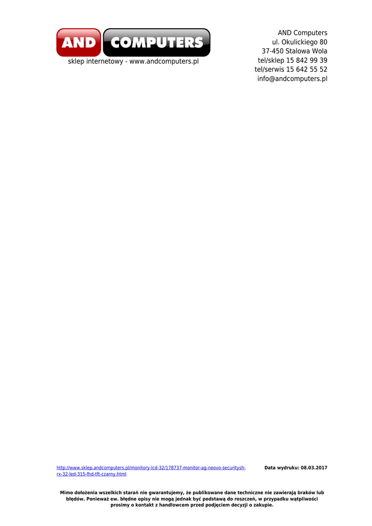 sklep internetowy - www.andcomputers.pl http://www.sklep.andcomputers.pl/monitory-lcd-32/178737-monitor-ag-neovo-securityshrx-32-led-315-fhd-tft-czarny.html AND Computers ul. Okulickiego 80 37-450 Stalowa Wola tel/sklep 15 842 99 39 tel/serwis 15 642 55 52 [email protected] Data wydruku: 08.03.2017 Mimo dołożenia wszelkich starań nie gwarantujemy, że publikowane dane techniczne nie zawierają braków lub błędów. Ponieważ ew. błędne opisy nie mogą jednak być podstawą do roszczeń, w przypadku wątpliwości prosimy o kontakt z handlowcem przed podjęciem decyzji o zakupie.