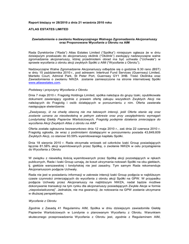 Raport bieŜący nr 28/2010 z dnia 21 września 2010 roku ATLAS ESTATES LIMITED Zawiadomienie o zwołaniu Nadzwyczajnego Walnego Zgromadzenia Akcjonariuszy oraz Proponowane Wycofanie z Obrotu na AIM Rada Dyrektorów (“Rada”) Atlas Estates Limited (“Spółka”) niniejszym ogłasza Ŝe w dniu dzisiejszym przekazało do akcjonariuszy okólnik (“Okólnik”) zwołujący nadzwyczajne walne zgromadzenia akcjonariuszy, której przedmiotem obrad ma być uchwała (“Uchwała”) w sprawie wycofania z obrotu akcji zwykłych Spółki z AIM (“Wycofanie z Obrotu”). Nadzwyczajne Walne Zgromadzenie Akcjonariuszy odbędzie się o godzinie 9.30 rano (BST) w dniu 15 października 2010 r., pod adresem: Intertrust Fund Services (Guernsey) Limited, Martello Court, Admiral Park, St Peter Port, Guernsey GY1 3HB. Treść Okólnika oraz Zawiadomienia o zwołaniu NWZA zostanie zamieszczone na stronie internetowej Spółki www.atlasestates.com. Podstawy i przyczyny Wycofania z Obrotu Dnia 7 maja 2010 r. Fragiolig Holdings Limited, spółka naleŜąca do grupy Izaki, opublikowała dokument zawierający zgodnie z prawem ofertę zakupu wszystkich Zwykłych Akcji nie naleŜących do Fragiolig i osób działających w porozumieniu z nim. Oferta zawierała następujące stwierdzenie: „ZwaŜywszy, iŜ na chwilę obecną nie ma takowych intencji, jeśli Oferta stanie się oraz zostanie uznana za nieodwołalną w pełnym zakresie oraz przy uwzględnieniu wymagań Londyńskiej Giełdy Papierów Wartościowych, Fragiolig podejmie działania zmierzające do wycofania Akcji Zwykłych Atlas z obrotu na AIM” Oferta została ogłoszona bezwarunkowo dnia 12 maja 2010 r., zaś dnia 22 czerwca 2010 r. Fragiolig ogłosiła, Ŝe wraz z podmiotami działającymi w porozumieniu posiada 43,849,609 Zwykłych Akcji, co stanowi 93.59% wyemitowanego kapitału Spółki. Dnia 18 sierpnia 2010 r. Rada otrzymała wniosek od członków Izaki Group posiadających łącznie 81.58% akcji wyemitowanych przez Spółkę, o zwołanie NWZA w celu przystąpienia do Wycofania z Obrotu W związku z niewielką ilością wyemitowanych przez Spółkę akcji pozostających w rękach publicznych, Rada i Izaki Group uznają, Ŝe koszt utrzymania notowań Spółki na obu giełdach, tj. giełdzie warszawskiej i londyńskiej nie jest zasadny. Tym samym Rada rekomenduje Akcjonariuszom podjęcie Uchwały. Rada nie jest w posiadaniu informacji w zakresie intencji Izaki Group podjęcia w najbliŜszym czasie czynności zmierzających do wycofania z obrotu akcji Spółki na GPW. W przypadku podjęcia Uchwały przez Akcjonariuszy na najbliŜszym NWZA, nadal będzie moŜliwe dokonywanie transakcji na tym rynku dla akcjonariuszy posiadających Zwykłe Akcje w formie „niepoświadczonej”. JednakŜe, nie ma gwarancji, Ŝe notowania na GPW zostanie utrzymane w dłuŜszej perspektywie. Wycofanie z Obrotu Zgodnie z Zasadą 41 Regulaminu AIM, Spółka w dniu dzisiejszym zawiadomiła Giełdę Papierów Wartościowych w Londynie o planowanym Wycofaniu z Obrotu. Warunkiem skutecznego przeprowadzenia Wycofania z Obrotu jest, zgodnie z Regulaminem AIM, uzyskanie zgody przynajmniej 75 procent głosów oddanych przez Akcjonariuszy na Nadzwyczajnym Walnym Zgromadzeniu Akcjonariuszy. Pod warunkiem uzyskania wymaganej zgody Akcjonariuszy, oczekuje się, Ŝe Wycofanie z Obrotu nastąpi z dniem 25 października 2010 r. o godzinie 7:00. Tryb przekazywania Akcjonariuszom informacji po Wycofaniu z Obrotu Dyrektorzy są świadomi potrzeby zachowania przepływu informacji skierowanych do Akcjonariuszy z poza terytorium Polski. ChociaŜ po Wycofaniu z Obrotu Spółka nie będzie podlegała obowiązkowi dokonywania ogłoszeń za pośrednictwem oficjalnego serwisu informacyjnego w Zjednoczonym Królestwie, niemniej Spółka będzie dokładać wszelkich starań, aby wymagane przepisami prawa ogłoszenia dokonywane przez Spółkę były zamieszczane w języku angielskim na stronie internetowej Spółki (www.atlasestates.com). Obrót Akcjami Zwykłymi przed Wycofaniem z Obrotu JeŜeli Akcjonariusze będą chcieli sprzedać posiadane przez siebie Akcje Zwykłe na AIM, będą musieli dokonać transakcji przed planowaną datą Wycofania z Obrotu (co nastąpi nie wcześniej niŜ pięć dni roboczych po odbyciu Nadzwyczajnego Walnego Zgromadzenia Akcjonariuszy). JeŜeli uchwała podana pod głosowanie na NWZA zostanie przyjęta, oczekuje się, Ŝe obrót Akcjami Zwykłymi na AIM zakończy się z końcem dnia roboczego 22 października 2010 r., natomiast Wycofanie z Obrotu nastąpi o godzinie 7:00 (BST) w dniu 25 października 2010 r. Obrót Akcjami Zwykłymi po Wycofaniu z Obrotu Po Wycofaniu z Obrotu nie będzie istniała platforma obrotu dla Akcji Zwykłych na AIM. Jednak obrót Akcjami Zwykłymi istniejącymi w postaci zdematerializowanej będzie moŜna nadal prowadzić za pośrednictwem depozytu papierów wartościowych prowadzonego przez KDPW w związku z dopuszczeniem tych akcji do obrotu na GPW. Akcjonariusze powinni jednakŜe zauwaŜyć, Ŝe zgodnie z polskim prawem wszystkie akcje będące w obrocie na GPW istnieją w postaci „niepoświadczonej” lub „zdematerializowanej”. Na dzień opublikowania niniejszego dokumentu 20 Akcji Zwykłych istnieje w formie niezdematerializowanej. Akcje te nie są dopuszczone do obrotu na GPW - aby umoŜliwić sprzedaŜ takich Akcji Zwykłych po Wycofaniu z Obrotu musi nastąpić ich dematerializacja, a następnie Spółka musi złoŜyć wniosek o dopuszczenie takich Akcji Zwykłych do notowań na GPW. JeŜeli Akcjonariusze będą chcieli sprzedać w obrocie publicznym Akcje Zwykłe mające w chwili obecnej formę dokumentu, takie Akcje Zwykłe będą musiały albo zostać zbyte na AIM do dnia 22 października 2010 r. albo będzie musiała nastąpić ich dematerializacja i dopuszczenie do obrotu na GPW. Czas Wycofania z Obrotu W przypadku podjęcia Uchwały w przedmiocie Wycofania z Obrotu przez Akcjonariuszy oczekuje się, Ŝe obrót Akcjam