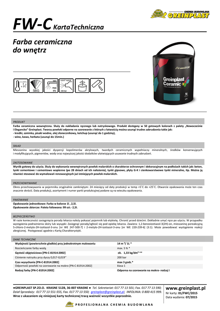 FW-C KartaTechniczna Farba ceramiczna do wnętrz Techniczna PRODUKT Farba ceramiczna wewnętrzna. Służy do nakładania ręcznego lub natryskowego. Produkt dostępny w 50 gotowych kolorach z palety „Nowocześnie i Elegancko” Greinplast. Tworzy powłoki odporne na szorowanie z których z łatwością można usunąć trudne zabrudzenia takie jak: - kredki, szminka, pisaki wodne, olej słonecznikowy, ketchup (usunąć do 1 godziny), - wino, kawa, herbata (usunąć do 15min.) SKŁAD Mieszanina wysokiej jakości dyspersji kopolimerów akrylowych, twardych ceramicznych wypełniaczy mineralnych, środków konserwujących i modyfikujących, pigmentów, wody oraz najwyższej jakości dodatków ułatwiających usuwanie trudnych zabrudzeń. ZASTOSOWANIE Wyrób gotowy do użycia. Służy do wykonania wewnętrznych powłok malarskich o charakterze ochronnym i dekoracyjnym na podłożach takich jak: beton, tynki cementowe i cementowo wapienne (po 28 dniach od ich nałożenia), tynki gipsowe, płyty G-K i cienkowarstwowe tynki mineralne, itp. Można ją również stosować do wymalowań renowacyjnych już istniejących powłok malarskich. PRZECHOWYWANIE Okres przechowywania w pojemniku oryginalnie zamkniętym: 24 miesięcy od daty produkcji w temp +5˚C do +25˚C. Otwarcie opakowania może ten czas znacznie skrócić. Data produkcji, asortyment i numer partii produkcyjnej podane są na wieczku opakowania. PAKOWANIE Opakowanie jednostkowe: Farba w kolorze 1l , 2,5l. Opakowanie zbiorcze: Paleta foliowana: 99 szt.- 2,5l. BEZPIECZEŃSTWO W razie konieczności zasięgnięcia porady lekarza należy pokazać pojemnik lub etykietę. Chronić przed dziećmi. Dokładnie umyć ręce po użyciu. W przypadku wystąpienia podrażnienia skóry lub wysypki: Zasięgnąć porady/zgłosić się pod opiekę lekarza. Zawiera: 1,2-benzoizotiazol-3(2H)-on, mieszaninę poreakcyjną 5-chloro-2-metylo-2H-izotiazol-3-onu [nr WE 247-500-7] i 2-metylo-2H-izotiazol-3-onu [nr WE 220-239-6] (3:1). Może powodować wystąpienie reakcji alergicznej. Postępować zgodnie z Kartą Charakterystyki. DANE TECHNICZNE Wydajność (powierzchnie gładkie) przy jednokrotnym malowaniu Rozcieńczanie farby wodą 14 m ²/ 1L * max. 5 % * Gęstość objętościowa [PN-C-81914:2002] ok. 1,33 kg/dm³ ** Ciśnienie natrysku przy dyszy 0,017-0,019’’ 200 bar Czas wysychania [PN-C-81914:2002] Odporność powłoki na szorowanie na mokro [PN-C-81914:2002] max 3 godz.* klasa 1 Rodzaj farby [PN-C-81914:2002] Odporna na szorowanie na mokro- rodzaj I ●GREINPLAST SP.ZO.O. KRASNE 512B, 36-007 KRASNE ● Tel. Sekretariat: 017 77 13 501; Fax. 017 77 13 590; Dział Sprzedaży: 017 77 13 551-555, Fax. 017 77 13 550; [email protected]; INFOLINIA: 0 800 415 999. Wraz z ukazaniem się niniejszej karty technicznej tracą ważność wszystkie poprzednie. PROFESJONALNA CHEMIA BUDOWLANA www.greinplast.pl Nr karty: 01/FWC/2015 Data wydania: 07/2015 FW-C KartaTechniczna Techniczna Największy rozmiar ziarna [PN-EN 13300:2002] do 100 µm (drobna) Współczynnik kontrastu przy wydajności 142m /l [PN-EN 13300:2002] klasa 3 Połysk [PN-EN 13300:2002] Mat System barwienia Produkt dostępny w palecie 50 gotowych kolorów Zawartość LZO - dopuszczalna od 2010r (kat. A/a/FW): - w wyrobie: max 30g/l ≤ 5,0 g/l – dla białych i pastelowych kolorów ≤ 7,5 g/l – dla ciemnych kolorów * wielkość zależy od warunków temperaturowych, rodzaju oraz chłonności podłoża ** dla farby białej NARZĘDZIA Mieszarka wolnoobrotowa, mieszadło koszyczkowe, wiadro, wałek (zalecane wałki firmy Dynamic®), pędzel, agregat malarski wyposażony w pistolet z wymiennymi dyszami (stosowane ciśnienie robocze około 200 bar przy dyszach 0,017-0,019 cala - testowano agregatem Speeflo PowrTwin 6900GH XLT firmy Wagner®). PRZYGOTOWANIE PODŁOŻA - OGÓLNE ZALECENIA Podłoże musi być nośne, zwarte, suche oczyszczone z kurzu, brudu, wykwitów solnych, resztek organicznych (oleje, tłuszcze, itp.) W przypadku występowania biokorozji konieczne jest zmycie zainfekowanych miejsc odpowiednio rozcieńczonym preparatem AP i zdezynfekowanie preparatem Greinplast AG. Podłoża mineralne niejednorodne lub o zwiększonej chłonności zagruntować lateksową farbą gruntującą Greinplast FWG. Informacje szczegółowe co do typu i sposobu przygotowania podłoża podano w tabeli poniżej. WYKONANIE Do właściwych prac malarskich można przystąpić po odpowiednim przygotowaniu podłoża oraz całkowitym jego wyschnięciu. W zależności od podłoża i warunków aplikacji (temperatura, wilgotność powietrza, chłonność i rodzaj podłoża, itp.) Producent dopuszcza dodanie do farby do 5% wody. Ilość dodawanej wody powinna być jednakowa dla każdego opakowania. Przed rozpoczęciem malowania farbę dokładnie wymieszać. W zależności od rodzaju i sposobu przygotowania podłoża oraz pożądanego końcowego efektu wizualnego nanosić jedną lub dwie warstwy farby (wałkiem lub agregatem do natrysku wysokociśnieniowego). Kolory intensywne o dużym nasyceniu barwy ze względu na swój charakter nie zawsze są w pełni kryjące. Z tego względu zaleca się wykonanie warstwy podkładowej kolorem zbliżonym, dobrze kryjącym (najlepiej na bazie białej). Konieczne może okazać się także naniesienie kolejnej warstwy farby. Zużycie uzależnione jest od sposobu malowania oraz rodzaju, chłonności i faktury podłoża. Prace na ścianie tworzącej jedną płaszczyznę należy prowadzić w sposób ciągły, bez przerw metodą „mokre na mokre” stosując materiał z jednej partii produkcyjnej. Pomieszczeń nie należy wietrzyć w trakcie malowania gdyż może to powodować zbyt szybkie przysychanie farby oraz niejednolitą strukturę (widoczne smugi). Proces malowania należy rozpocząć od wykonania odcięć w narożach malowanego pomieszczenia używając pędzla lub wałka. Przerwanie malowania należy zaplanować wcześniej w miejscach gdzie ewentualne połączenie będzie mało widoczne. ZA