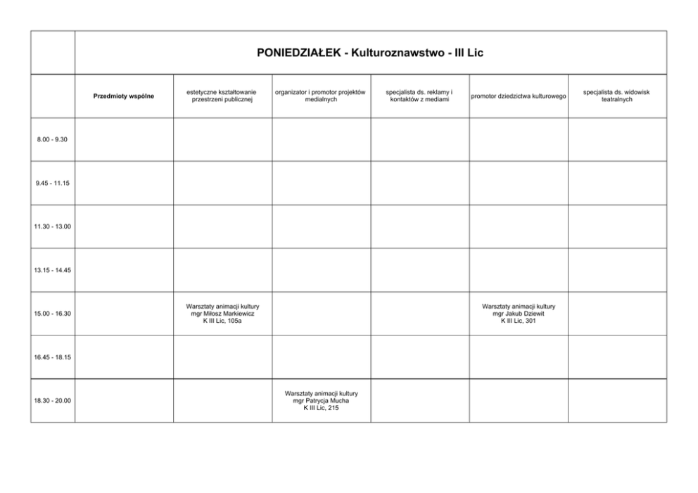 PONIEDZIAŁEK - Kulturoznawstwo - III Lic Przedmioty wspólne estetyczne kształtowanie przestrzeni publicznej organizator i promotor projektów medialnych specjalista ds. reklamy i kontaktów z mediami promotor dziedzictwa kulturowego 8.00 - 9.30 9.45 - 11.15 11.30 - 13.00 13.15 - 14.45 15.00 - 16.30 Warsztaty animacji kultury mgr Miłosz Markiewicz K III Lic, 105a Warsztaty animacji kultury mgr Jakub Dziewit K III Lic, 301 16.45 - 18.15 18.30 - 20.00 Warsztaty animacji kultury mgr Patrycja Mucha K III Lic, 215 specjalista ds. widowisk teatralnych WTOREK - Kulturoznawstwo - III Lic Przedmioty wspólne 8.00 - 9.30 estetyczne kształtowanie przestrzeni publicznej organizator i promotor projektów medialnych specjalista ds. reklamy i kontaktów z mediami promotor dziedzictwa kulturowego DO WYBORU 1-A Kultura języka dr Katarzyna Sujkowska-Sobisz K III Lic, 215 9.45 - 11.15 Przedmiot specjalizacyny dr Alicja Głutkowska-Polniak K III Lic, 215 11.30 - 13.00 Seminarium licencjackie dr Alicja Głutkowska-Polniak K III Lic, 105a Warsztaty animacji kultury mgr Paulina Świtała K III Lic, 301 13.15 - 14.45 Przedmiot specjalizacyjny dr hab. Anna Gomóła K III Lic, 301 15.00 - 16.30 Seminarium licencjackie dr hab. Anna Gomóła K III Lic, 301 16.45 - 18.15 18.30 - 20.00 specjalista ds. widowisk teatralnych ŚRODA - Kulturoznawstwo - III Lic Przedmioty wspólne estetyczne kształtowanie przestrzeni publicznej organizator i promotor projektów medialnych specjalista ds. reklamy i kontaktów z mediami promotor dziedzictwa kulturowego specjalista ds. widowisk teatralnych 8.00 - 9.30 9.45 - 11.15 11.30 - 13.00 13.15 - 14.45 DO WYBORU 1-B Folklor polski dr hab. Dobrosłąwa WężowiczZiółkowska K III Lic, 301 15.00 - 16.30 Seminarium licencjackie dr Ilona Copik K III Lic, 207a Przedmiot specjalizacyjny II dr Ewa Dąbek-Derda K III Lic, 210/211 16.45 - 18.15 Przedmiot specjalizacyjny mgr Hanna Kostrzewska K III Lic, 217 Seminarium licencjackie dr Ewa Dąbek-Derda K III Lic, 210/211 18.30 - 20.00 CZWARTEK - Kulturoznawstwo - III Lic Przedmioty wspólne estetyczne kształtowanie przestrzeni publicznej organizator i promotor projektów medialnych 8.00 - 9.30 Przedmiot specjalizacyjny II dr Magdalena Kempna-Pieniążek K III Lic, s. 217 9.45 - 11.15 Seminarium licencjackie dr Magdalena Kempna-Pieniążek K III Lic, s. 217 11.30 - 13.00 13.15 - 14.45 15.00 - 16.30 16.45 - 18.15 18.30 - 20.00 specjalista ds. reklamy i kontaktów z mediami promotor dziedzictwa kulturowego specjalista ds. widowisk teatralnych Warsztaty animacji kultury dr Aneta Głowacka K III Lic, 210/211 PIĄTEK - Kulturoznawstwo - III Lic Przedmioty wspólne 8.00 - 9.30 9.45 - 11.15 11.30 - 13.00 13.15 - 14.45 15.00 - 16.30 16.45 - 18.15 18.30 - 20.00 estetyczne kształtowanie przestrzeni publicznej organizator i promotor projektów medialnych specjalista ds. reklamy i kontaktów z mediami promotor dziedzictwa kulturowego specjalista ds. widowisk teatralnych
