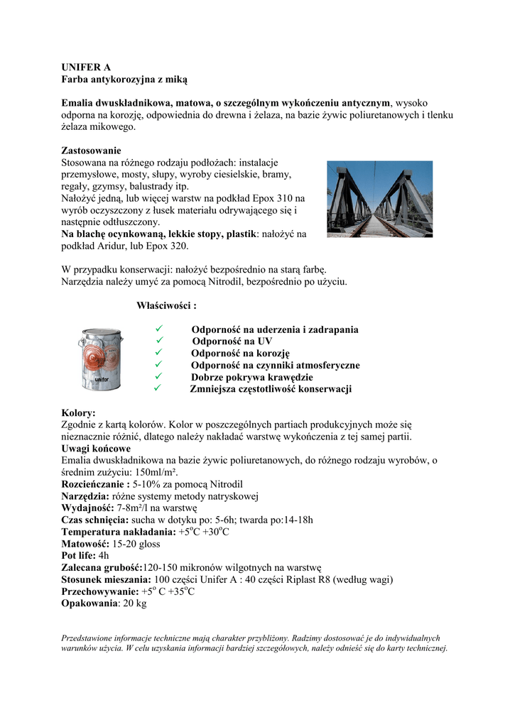 UNIFER A Farba antykorozyjna z miką Emalia dwuskładnikowa, matowa, o szczególnym wykończeniu antycznym, wysoko odporna na korozję, odpowiednia do drewna i żelaza, na bazie żywic poliuretanowych i tlenku żelaza mikowego. Zastosowanie Stosowana na różnego rodzaju podłożach: instalacje przemysłowe, mosty, słupy, wyroby ciesielskie, bramy, regały, gzymsy, balustrady itp. Nałożyć jedną, lub więcej warstw na podkład Epox 310 na wyrób oczyszczony z łusek materiału odrywającego się i następnie odtłuszczony. Na blachę ocynkowaną, lekkie stopy, plastik: nałożyć na podkład Aridur, lub Epox 320. W przypadku konserwacji: nałożyć bezpośrednio na starą farbę. Narzędzia należy umyć za pomocą Nitrodil, bezpośrednio po użyciu. Właściwości : Odporność na uderzenia i zadrapania Odporność na UV Odporność na korozję Odporność na czynniki atmosferyczne Dobrze pokrywa krawędzie Zmniejsza częstotliwość konserwacji Kolory: Zgodnie z kartą kolorów. Kolor w poszczególnych partiach produkcyjnych może się nieznacznie różnić, dlatego należy nakładać warstwę wykończenia z tej samej partii. Uwagi końcowe Emalia dwuskładnikowa na bazie żywic poliuretanowych, do różnego rodzaju wyrobów, o średnim zużyciu: 150ml/m². Rozcieńczanie : 5-10% za pomocą Nitrodil Narzędzia: różne systemy metody natryskowej Wydajność: 7-8m²/l na warstwę Czas schnięcia: sucha w dotyku po: 5-6h; twarda po:14-18h Temperatura nakładania: +5oC +30oC Matowość: 15-20 gloss Pot life: 4h Zalecana grubość:120-150 mikronów wilgotnych na warstwę Stosunek mieszania: 100 części Unifer A : 40 części Riplast R8 (według wagi) Przechowywanie: +5o C +35oC Opakowania: 20 kg Przedstawione informacje techniczne mają charakter przybliżony. Radzimy dostosować je do indywidualnych warunków użycia. W celu uzyskania informacji bardziej szczegółowych, należy odnieść się do karty technicznej.