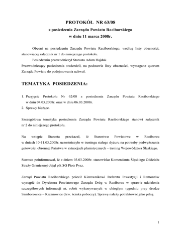 PROTOKÓŁ NR 63/08 z posiedzenia Zarządu Powiatu Raciborskiego w dniu 11 marca 2008r. Obecni na posiedzeniu Zarządu Powiatu Raciborskiego, według listy obecności, stanowiącej załącznik nr 1 do niniejszego protokołu. Posiedzeniu przewodniczył Starosta Adam Hajduk. Przewodniczący posiedzenia stwierdził, na podstawie listy obecności, wymagane quorum Zarządu Powiatu do podejmowania uchwał. TEMATYKA POSIEDZENIA: 1. Przyjęcie Protokołu Nr 62/08 z posiedzenia Zarządu Powiatu Raciborskiego w dniu 04.03.2008r. oraz w dniu 06.03.2008r. 2. Sprawy bieżące. Szczegółowa tematyka posiedzenia Zarządu Powiatu Raciborskiego stanowi załącznik nr 2 do niniejszego protokołu. Na wstępie Starosta przekazał, iż Starostwo Powiatowe w Raciborzu w dniach 10-11.03.2008r. uczestniczyło w treningu stałego dyżuru na potrzeby podwyższania gotowości obronnej Państwa w sytuacjach planistycznych – trening Województwa Śląskiego. Starosta poinformował, iż z dniem 03.03.2008r. stanowisko Komendanta Śląskiego Oddziału Straży Granicznej objął płk SG Piotr Pysz. Zarząd Powiatu Raciborskiego polecił Kierownikowi Referatu Inwestycji i Remontów wystąpić do Dyrektora Powiatowego Zarządu Dróg w Raciborzu w sprawie udzielenia szczegółowych informacji nt. robót wykonywanych w ubiegłym tygodniu przy drodze Samborowice – Krzanowice (tzw. ścinka poboczy). Sprawę należy potraktować jako pilną. 1 Ad. 1 Protokół Nr 62/08 z posiedzenia Zarządu Powiatu Raciborskiego w dniu 04.03.2008r. oraz w dniu 06.03.2008r. przyjęto i podpisano po zapoznaniu się z jego treścią. Ad. 2 Starosta zapoznał zebranych z kartą informacyjną Referatu Architektury i Budownictwa dot. wniosku Burmistrza Miasta Kuźnia Raciborska o uzgodnienie projektu miejscowego planu zagospodarowania przestrzennego Gminy Kuźnia Raciborska obejmującego teren suchego zbiornika przeciwpowodziowego w mieście Kuźnia Raciborska. W/w karta informacyjna stanowi załącznik nr 3 do protokołu. Starosta poinformował, iż wnioskiem z dnia 26.02.2008r. Burmistrz Miasta Kuźnia Raciborska zwrócił się do Zarządu Powiatu Raciborskiego o uzgodnienie projektu miejscowego planu zagospodarowania przestrzennego Gminy Kuźnia Raciborska obejmującego teren suchego zbiornika przeciwpowodziowego w mieście Kuźnia Raciborska. Obowiązek takiego uzgodnienia z zakresie zgodności z zadaniami samorządowymi powiatu wynika z 17 pkt 7 ustawy z dnia 27.03.2003r. o planowaniu i zagospodarowaniu przestrzennym (Dz. U. Nr 80, poz. 717 z 2003r. z późn. zm.). Referat Architektury i Budownictwa po przeanalizowaniu złożonych wraz z wnioskiem dokumentów ustalił, iż nie ma uwag co do proponowanych rozwiązań planistycznych w zakresie ich zgodności z zadaniami samorządowymi powiatu. W związku z powyższym, Zarząd Powiatu Raciborskiego w obecności 5 Członków – 5 głosami za, 0 głosów przeciw, 0 głosów wstrzymujących – uzgodnił, podejmując stosowne postanowienie, projekt miejscowego planu zagospodarowania przestrzennego Gminy Kuźnia Raciborska obejmującego teren suchego zbiornika przeciwpowodziowego w mieście Kuźnia Raciborska, w zakresie zgodności z zadaniami samorządowymi powiatu. Postanowienie stanowi załącznik nr 4 do protokołu. Starosta zaprezentował kartę informacyjną Referatu Księgowości i Płac dot. przyjęcia korekty bilansu za 2005r. i 2006r. Poradni Psychologiczno-Pedagogicznej w Raciborzu ul. Jana oraz zestawienia zmian w funduszu jednostki i rachunku zysków i strat stanowiących załączniki do w/w bilansów. W/w karta informacyjna stanowi załącznik nr 5 do protokołu. 2 Po analizie w/w karty informacyjnej, Zarząd Powiatu Raciborskiego polecił Kierownikowi Referatu Księgowości i Płac, aby wystosowała pismo do Dyrektora Poradni PsychologicznoPedagogicznej w Raciborzu z zapytaniem, dlaczego Pani Dyrektor dopiero w 2008r. wystąpiła do Zarządu z prośbą o przyjęcie korekty bilansu za 2005r. i 2006r. oraz zestawienia zmian w funduszu jednostki i rachunku zysków i strat stanowiących załączniki do w/w bilansu. Ponadto Dyrektor powinna wyjaśnić, jakie konsekwencje wyciągnęła wobec osób, które dopuściły się błędów w sporządzaniu bilansu. Po udzieleniu wyjaśnień przez Dyrektora w/w sprawa powróci na posiedzenie Zarządu. Starosta omówił kartę informacyjną Referatu Inwestycji i Remontów dot. akceptacji umów z „Gminami” o partycypację w środkach finansowych na remonty dróg powiatowych zlokalizowanych na terenie Powiatu Raciborskiego. W/w karta informacyjna stanowi załącznik nr 6 do protokołu. Zarząd Powiatu Raciborskiego zaakceptował projekty umów w sprawie pomocy finansowej udzielonej Powiatowi Raciborskiemu przez Gminy w formie dotacji celowej na realizację określonych odcinków dróg powiatowych oraz budowę chodnika w ul. Ocickiej i Wiejskiej w Raciborzu. Starosta przedstawił kartę informacyjną Referatu Ochrony Środowiska, Gospodarki Wodnej i Rolnictwa dot. dofinansowania do zadania pn. „Wymiana pokrycia dachu i obróbek blacharskich na budynku plebanii, w tym: rozbiórka, transport i utylizacja istniejącego pokrycia z płyt azbestowo – cementowych” w miejscowości Turze, Gm. Kuźnia Raciborska przy ul. Kościelnej 2 dla Parafii Rzymsko – Katolickiej p.w. Najśw. Serca Pana Jezusa. W/w karta informacyjna stanowi załącznik nr 7 do protokołu. Starosta poinformował, iż w dniu 05.03.2008r. Parafia Rzymsko – Katolicka p.w. Najśw. Serca Pana Jezusa uzupełniła wniosek dot. przyznania dotacji na powyższe zadanie. Z informacji zawartych w piśmie wynika, iż budynek plebanii obok funkcji mieszkalnej pełni w znacznej części funkcje o charakterze społecznym, katechetycznym oraz administracyjnym. W pomieszczeniach plebanii odbywają się cyklicznie spotkania i zebrania robocze działającego Parafialnego Zespołu Caritas oraz Społecznej Rady Duszpasterskiej. Pomieszczenia plebanii wykorzystywane są też do uroczystych spotk
