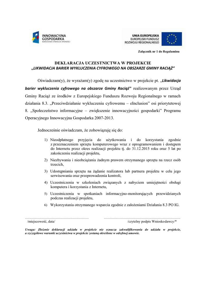 Załącznik nr 1 do Regulaminu DEKLARACJA UCZESTNICTWA W PROJEKCIE „LIKWIDACJA BARIER WYKLUCZENIA CYFROWEGO NA OBSZARZE GMINY RACIĄŻ” Oświadczam(y), że wyrażam(y) zgodę na uczestnictwo w projekcie pt. „Likwidacja barier wykluczenia cyfrowego na obszarze Gminy Raciąż” realizowanym przez Urząd Gminy Raciąż ze środków z Europejskiego Funduszu Rozwoju Regionalnego w ramach działania 8.3. „Przeciwdziałanie wykluczeniu cyfrowemu – eInclusion” osi priorytetowej 8. „Społeczeństwo informacyjne – zwiększenie innowacyjności gospodarki” Programu Operacyjnego Innowacyjna Gospodarka 2007-2013. Jednocześnie oświadczam, że zobowiązuję się do: 1) Nieodpłatnego przyjęcia do użytkowania i do korzystania zgodnie z przeznaczeniem sprzętu komputerowego wraz z oprogramowaniem i dostępem do Internetu przez okres realizacji projektu tj. do 31.12.2015 roku oraz 5 lat po zakończeniu realizacji projektu, 2) Niezbywania i nieobciążania żadnym prawem otrzymanego sprzętu na rzecz osób trzecich, 3) Udostępniania sprzętu na żądanie realizatora lub partnera projektu w celu jego serwisowania oraz przeprowadzenia kontroli, 4) Uczestniczenia w szkoleniach związanych z nabyciem umiejętności obsługi komputera i korzystania z Internetu, w spotkaniach informacyjno-monitorujących przewidzianych podczas realizacji projektu, 5) Uczestniczenia 6) Wykorzystania otrzymanego wsparcia zgodnie z założeniami Działania 8.3 PO IG. …………………………………………………… /miejscowość, data/ ……………………………………………………………… /czytelny podpis Wnioskodawcy/* Uwaga: Złożenie deklaracji udziału w projekcie nie oznacza zakwalifikowania do udziału w projekcie, a szczegółowe warunki uczestnictwa w projekcie zostaną określone w odrębnej umowie.
