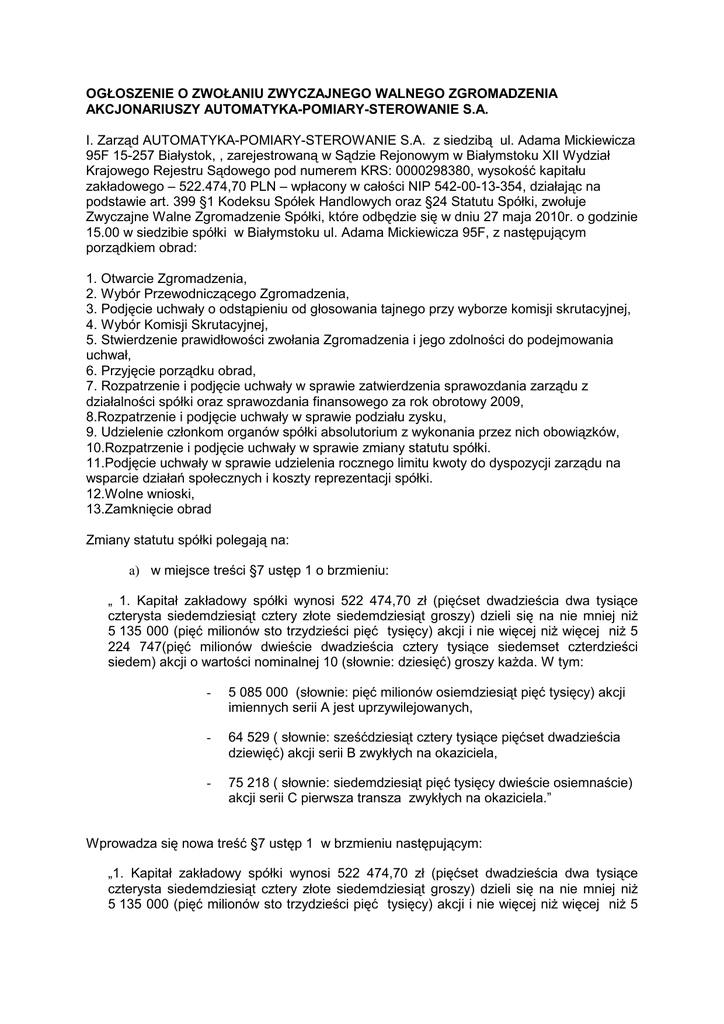 OGŁOSZENIE O ZWOŁANIU ZWYCZAJNEGO WALNEGO ZGROMADZENIA AKCJONARIUSZY AUTOMATYKA-POMIARY-STEROWANIE S.A. I. Zarząd AUTOMATYKA-POMIARY-STEROWANIE S.A. z siedzibą ul. Adama Mickiewicza 95F 15-257 Białystok, , zarejestrowaną w Sądzie Rejonowym w Białymstoku XII Wydział Krajowego Rejestru Sądowego pod numerem KRS: 0000298380, wysokość kapitału zakładowego – 522.474,70 PLN – wpłacony w całości NIP 542-00-13-354, działając na podstawie art. 399 §1 Kodeksu Spółek Handlowych oraz §24 Statutu Spółki, zwołuje Zwyczajne Walne Zgromadzenie Spółki, które odbędzie się w dniu 27 maja 2010r. o godzinie 15.00 w siedzibie spółki w Białymstoku ul. Adama Mickiewicza 95F, z następującym porządkiem obrad: 1. Otwarcie Zgromadzenia, 2. Wybór Przewodniczącego Zgromadzenia, 3. Podjęcie uchwały o odstąpieniu od głosowania tajnego przy wyborze komisji skrutacyjnej, 4. Wybór Komisji Skrutacyjnej, 5. Stwierdzenie prawidłowości zwołania Zgromadzenia i jego zdolności do podejmowania uchwał, 6. Przyjęcie porządku obrad, 7. Rozpatrzenie i podjęcie uchwały w sprawie zatwierdzenia sprawozdania zarządu z działalności spółki oraz sprawozdania finansowego za rok obrotowy 2009, 8.Rozpatrzenie i podjęcie uchwały w sprawie podziału zysku, 9. Udzielenie członkom organów spółki absolutorium z wykonania przez nich obowiązków, 10.Rozpatrzenie i podjęcie uchwały w sprawie zmiany statutu spółki. 11.Podjęcie uchwały w sprawie udzielenia rocznego limitu kwoty do dyspozycji zarządu na wsparcie działań społecznych i koszty reprezentacji spółki. 12.Wolne wnioski, 13.Zamknięcie obrad Zmiany statutu spółki polegają na: a) w miejsce treści §7 ustęp 1 o brzmieniu: „ 1. Kapitał zakładowy spółki wynosi 522 474,70 zł (pięćset dwadzieścia dwa tysiące czterysta siedemdziesiąt cztery złote siedemdziesiąt groszy) dzieli się na nie mniej niŜ 5 135 000 (pięć milionów sto trzydzieści pięć tysięcy) akcji i nie więcej niŜ więcej niŜ 5 224 747(pięć milionów dwieście dwadzieścia cztery tysiące siedemset czterdzieści siedem) akcji o wartości nominalnej 10 (słownie: dziesięć) groszy kaŜda. W tym: - 5 085 000 (słownie: pięć milionów osiemdziesiąt pięć tysięcy) akcji imiennych serii A jest uprzywilejowanych, - 64 529 ( słownie: sześćdziesiąt cztery tysiące pięćset dwadzieścia dziewięć) akcji serii B zwykłych na okaziciela, - 75 218 ( słownie: siedemdziesiąt pięć tysięcy dwieście osiemnaście) akcji serii C pierwsza transza zwykłych na okaziciela.” Wprowadza się nowa treść §7 ustęp 1 w brzmieniu następującym: „1. Kapitał zakładowy spółki wynosi 522 474,70 zł (pięćset dwadzieścia dwa tysiące czterysta siedemdziesiąt cztery złote siedemdziesiąt groszy) dzieli się na nie mniej niŜ 5 135 000 (pięć milionów sto trzydzieści pięć tysięcy) akcji i nie więcej niŜ więcej niŜ 5 224 747(pięć milionów dwieście dwadzieścia cztery tysiące siedemset czterdzieści siedem) akcji o wartości nominalnej 10 (słownie: dziesięć) groszy kaŜda. W tym: 1.1 Akcje serii A : - 5 084 487 (słownie: pięć milionów osiemdziesiąt cztery tysiące czterysta osiemdziesiąt siedem) akcji imiennych uprzywilejowanych, - 513 ( pięćset trzynaście) akcji zwykłych na okaziciela. 1.2 Akcje serii B - 64 529 ( słownie: sześćdziesiąt cztery tysiące pięćset dwadzieścia dziewięć) akcji zwykłych na okaziciela, 1.3 Akcje serii C - 75 218 ( słownie: siedemdziesiąt pięć tysięcy dwieście osiemnaście) akcji serii C pierwsza transza zwykłych na okaziciela.” b) W §7 dodaje się ustęp 7 w brzmieniu następującym: „ 7. Zamiana akcji imiennych na akcje na okaziciela następuje na Wniosek Akcjonariusza skierowany na piśmie do Zarządu. Zarząd podejmuje uchwałę w sprawie zamiany akcji imiennych na akcje na okaziciela raz na kwartał roku obrotowego, w stosunku do wniosków o zamianę akcji zgłoszonych do dnia podjęcia uchwały. Niezwłocznie po podjęciu tej uchwały Zarząd zwoła Walne Zgromadzenie celem dostosowania zapisów Statutu do aktualnej liczby akcji Spółki poszczególnych rodzajów.” c) W § 25 ustęp 1 w miejsce treści: „ 1. Nadzwyczajne Walne Zgromadzenie zwołuje Zarząd Spółki z własnej inicjatywy lub na pisemny wniosek Rady Nadzorczej, albo akcjonariuszy przedstawiających co najmniej 1/10 kapitału zakładowego.” Wprowadza się treść następującą: „ 1. Nadzwyczajne Walne Zgromadzenie zwołuje Zarząd Spółki z własnej inicjatywy lub na pisemny wniosek Rady Nadzorczej, albo akcjonariuszy przedstawiających co najmniej 1/20 kapitału zakładowego.” d) W § 27 ustęp 3 w miejsce treści: „ 3. Wniosek zgłoszony przez akcjonariuszy przedstawiających nie mniej niŜ 1/10 kapitału zakładowego musi być przedstawiony Walnemu Zgromadzeniu” Wprowadza się treść następującą: „ 3. Wniosek zgłoszony przez akcjonariuszy przedstawiających nie mniej niŜ 1/20 kapitału zakładowego musi być przedstawiony Walnemu Zgromadzeniu” II. Procedury i Warunki Uczestnictwa w Walnym Zgromadzeniu a) Akcjonariusz lub akcjonariusze reprezentujący co najmniej jedną dwudziestą kapitału zakładowego mogą Ŝądać umieszczenia określonych spraw w porządku obrad Zgromadzenia. śądanie powinno być zgłoszone Zarządowi nie później niŜ 06.05.2010 r. i powinno zawierać uzasadnienie lub projekt uchwały dotyczącej proponowanego punktu porządku obrad. śądanie powinno być zgłoszone na piśmie lub drogą elektroniczną na adres poczty elektronicznej: [email protected] Akcjonariusz/akcjonariusze powinien/powinni wykazać posiadanie odpowiedniej liczby akcji na dzień złoŜenia Ŝądania załączając do Ŝądania świadectwo/a depozytowe, a w przypadku akcjonariuszy będących osobami prawnymi i spółkami osobowymi potwierdzić równieŜ uprawnienie do działania w imieniu tego podmiotu załączając aktualny odpis z KRS. W przypadku akcjonariuszy zgła
