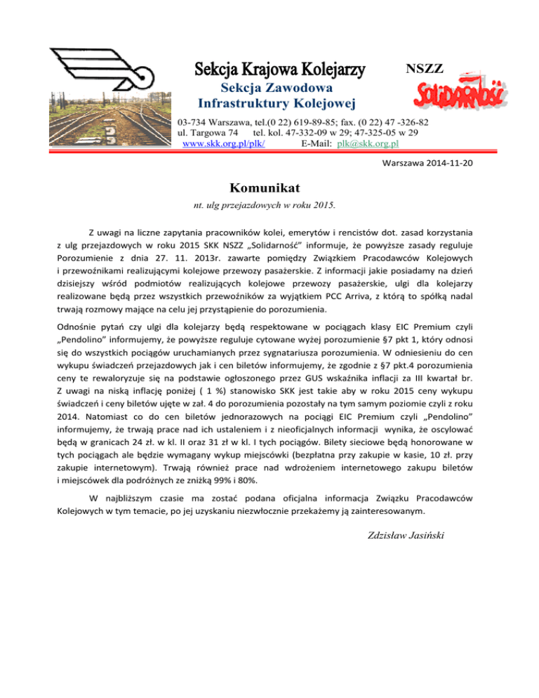 NSZZ Sekcja Zawodowa Infrastruktury Kolejowej SOL 03-734 Warszawa, tel.(0 22) 619-89-85; fax. (0 22) 47 -326-82 ul. Targowa 74 tel. kol. 47-332-09 w 29; 47-325-05 w 29 www.skk.org.pl/plk/ E-Mail: [email protected] Warszawa 2014-11-20 Komunikat nt. ulg przejazdowych w roku 2015. Z uwagi na liczne zapytania pracowników kolei, emerytów i rencistów dot. zasad korzystania z ulg przejazdowych w roku 2015 SKK NSZZ „Solidarność” informuje, że powyższe zasady reguluje Porozumienie z dnia 27. 11. 2013r. zawarte pomiędzy Związkiem Pracodawców Kolejowych i przewoźnikami realizującymi kolejowe przewozy pasażerskie. Z informacji jakie posiadamy na dzień dzisiejszy wśród podmiotów realizujących kolejowe przewozy pasażerskie, ulgi dla kolejarzy realizowane będą przez wszystkich przewoźników za wyjątkiem PCC Arriva, z którą to spółką nadal trwają rozmowy mające na celu jej przystąpienie do porozumienia. Odnośnie pytań czy ulgi dla kolejarzy będą respektowane w pociągach klasy EIC Premium czyli „Pendolino” informujemy, że powyższe reguluje cytowane wyżej porozumienie §7 pkt 1, który odnosi się do wszystkich pociągów uruchamianych przez sygnatariusza porozumienia. W odniesieniu do cen wykupu świadczeń przejazdowych jak i cen biletów informujemy, że zgodnie z §7 pkt.4 porozumienia ceny te rewaloryzuje się na podstawie ogłoszonego przez GUS wskaźnika inflacji za III kwartał br. Z uwagi na niską inflację poniżej ( 1 %) stanowisko SKK jest takie aby w roku 2015 ceny wykupu świadczeń i ceny biletów ujęte w zał. 4 do porozumienia pozostały na tym samym poziomie czyli z roku 2014. Natomiast co do cen biletów jednorazowych na pociągi EIC Premium czyli „Pendolino” informujemy, że trwają prace nad ich ustaleniem i z nieoficjalnych informacji wynika, że oscylować będą w granicach 24 zł. w kl. II oraz 31 zł w kl. I tych pociągów. Bilety sieciowe będą honorowane w tych pociągach ale będzie wymagany wykup miejscówki (bezpłatna przy zakupie w kasie, 10 zł. przy zakupie internetowym). Trwają również prace nad wdrożeniem internetowego zakupu biletów i miejscówek dla podróżnych ze zniżką 99% i 80%. W najbliższym czasie ma zostać podana oficjalna informacja Związku Pracodawców Kolejowych w tym temacie, po jej uzyskaniu niezwłocznie przekażemy ją zainteresowanym. Zdzisław Jasiński