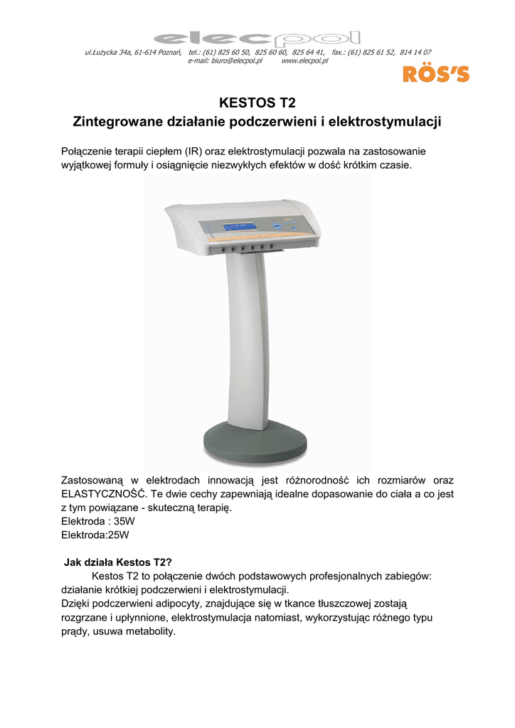 ul.ŁuŜycka 34a, 61-614 Poznań, tel.: (61) 825 60 50, 825 60 60, 825 64 41, fax.: (61) 825 61 52, 814 14 07 e-mail: [email protected] www.elecpol.pl KESTOS T2 Zintegrowane działanie podczerwieni i elektrostymulacji Połączenie terapii ciepłem (IR) oraz elektrostymulacji pozwala na zastosowanie wyjątkowej formuły i osiągnięcie niezwykłych efektów w dość krótkim czasie. Zastosowaną w elektrodach innowacją jest róŜnorodność ich rozmiarów oraz ELASTYCZNOŚĆ. Te dwie cechy zapewniają idealne dopasowanie do ciała a co jest z tym powiązane - skuteczną terapię. Elektroda : 35W Elektroda:25W Jak działa Kestos T2? Kestos T2 to połączenie dwóch podstawowych profesjonalnych zabiegów: działanie krótkiej podczerwieni i elektrostymulacji. Dzięki podczerwieni adipocyty, znajdujące się w tkance tłuszczowej zostają rozgrzane i upłynnione, elektrostymulacja natomiast, wykorzystując róŜnego typu prądy, usuwa metabolity. ul.ŁuŜycka 34a, 61-614 Poznań, tel.: (61) 825 60 50, 825 60 60, 825 64 41, fax.: (61) 825 61 52, 814 14 07 e-mail: [email protected] www.elecpol.pl Zastosowanie: • Delikatny cellulit • DuŜy celulit • Obrzęki cellulitowe • Kształtowanie sylwetki • Intensywne kształtowanie sylwetki • Obrzęki • Lokalnie ograniczone zmiany limfatyczne • Problemy krąŜeniowe • Ujędrnianianie • Poprawa metabolizmu • Relaksujące Charakterystyka bezpośrednia: • 17 rodzajów prądów wykorzystanych w 14 programach • 6 elastycznych, idealnie dopasowujących się, łatwych w uŜyciu oraz łatwych w czyszczeniu elektrod. Dane techniczne: szerokość 590 mm Wymiary wysokość 180 mm głębokość 280 mm Waga 10 kg Pobór mocy 300 W BETA stojak 790 × 450 mm opcjonalnie