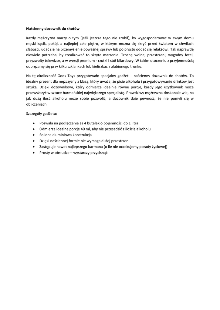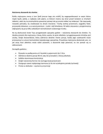 Naścienny dozownik do shotów Każdy mężczyzna marzy o tym (jeśli jeszcze tego nie zrobił), by wygospodarować w swym domu męski kącik, pokój, a najlepiej całe piętro, w którym można się skryć przed światem w chwilach słabości, udać się na przemyślenie poważnej sprawy lub po prostu oddać się relaksowi. Tak naprawdę niewiele potrzeba, by zrealizować to skryte marzenie. Trochę wolnej przestrzeni, wygodny fotel, przyzwoity telewizor, a w wersji premium - rzutki i stół bilardowy. W takim otoczeniu z przyjemnością odprężamy się przy kilku szklankach lub kieliszkach ulubionego trunku. Na tę okoliczność Gods Toys przygotowało specjalny gadżet – naścienny dozownik do shotów. To idealny prezent dla mężczyzny z klasą, który uważa, że picie alkoholu i przygotowywanie drinków jest sztuką. Dzięki dozownikowi, który odmierza idealnie równe porcje, każdy jego użytkownik może przewyższyć w sztuce barmańskiej największego specjalistę. Prawdziwy mężczyzna doskonale wie, na jak dużą ilość alkoholu może sobie pozwolić, a dozownik daje pewność, że nie pomyli się w obliczeniach. Szczegóły gadżetu: Pozwala na podłączenie aż 4 butelek o pojemności do 1 litra Odmierza idealne porcje 40 ml, aby nie przesadzić z ilością alkoholu Solidna aluminiowa konstrukcja Dzięki naściennej formie nie wymaga dużej przestrzeni Zastępuje nawet najlepszego barmana (o ile nie oczekujemy porady życiowej) Prosty w obsłudze – wystarczy przycisnąć
