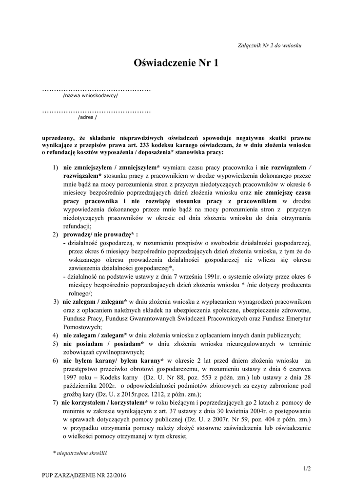 Załącznik Nr 2 do wniosku Oświadczenie Nr 1 .............................................. /nazwa wnioskodawcy/ .............................................. /adres / uprzedzony, że składanie nieprawdziwych oświadczeń spowoduje negatywne skutki prawne wynikające z przepisów prawa art. 233 kodeksu karnego oświadczam, że w dniu złożenia wniosku o refundację kosztów wyposażenia / doposażenia* stanowiska pracy: 1) nie zmniejszyłem / zmniejszyłem* wymiaru czasu pracy pracownika i nie rozwiązałem / rozwiązałem* stosunku pracy z pracownikiem w drodze wypowiedzenia dokonanego przeze mnie bądź na mocy porozumienia stron z przyczyn niedotyczących pracowników w okresie 6 miesiecy bezpośrednio poprzedzających dzień złożenia wniosku oraz nie zmniejszę czasu pracy pracownika i nie rozwiążę stosunku pracy z pracownikiem w drodze wypowiedzenia dokonanego przeze mnie bądź na mocy porozumienia stron z przyczyn niedotyczących pracowników w okresie od dnia złożenia wniosku do dnia otrzymania refundacji; 2) prowadzę/ nie prowadzę* : - działalność gospodarczą, w rozumieniu przepisów o swobodzie działalności gospodarczej, przez okres 6 miesięcy bezpośrednio poprzedzających dzień złożenia wniosku, z tym że do wskazanego okresu prowadzenia działalności gospodarczej nie wlicza się okresu zawieszenia działalności gospodarczej*, - działalność na podstawie ustawy z dnia 7 września 1991r. o systemie oświaty przez okres 6 miesięcy bezpośrednio poprzedzajacych dzień złożenia wniosku * /nie dotyczy producenta rolnego/; 3) nie zalegam / zalegam* w dniu złożenia wniosku z wypłacaniem wynagrodzeń pracownikom oraz z opłacaniem należnych składek na ubezpieczenia społeczne, ubezpieczenie zdrowotne, Fundusz Pracy, Fundusz Gwarantowanych Świadczeń Pracowniczych oraz Fundusz Emerytur Pomostowych; 4) nie zalegam / zalegam* w dniu złożenia wniosku z opłacaniem innych danin publicznych; 5) nie posiadam / posiadam* w dniu złożenia wniosku nieuregulowanych w terminie zobowiązań cywilnoprawnych; 6) nie byłem karany/ byłem karany* w okresie 2 lat przed dniem złożenia wniosku za przestępstwo przeciwko obrotowi gospodarczemu, w rozumieniu ustawy z dnia 6 czerwca 1997 roku – Kodeks karny (Dz. U. Nr 88, poz. 553 z późn. zm.) lub ustawy z dnia 28 października 2002r. o odpowiedzialności podmiotów zbiorowych za czyny zabronione pod groźbą kary (Dz. U. z 2015r.poz. 1212, z późn. zm.); 7) nie korzystałem / korzystałem* w roku bieżącym i poprzedzających go 2 latach z pomocy de minimis w zakresie wynikającym z art. 37 ustawy z dnia 30 kwietnia 2004r. o postępowaniu w sprawach dotyczących pomocy publicznej (Dz. U. z 2007r. Nr 59, poz. 404 z późn. zm.) w przypadku otrzymania pomocy należy złożyć stosowne zaświadczenia lub oświadczenie o wielkości pomocy otrzymanej w tym okresie; * niepotrzebne skreślić 1/2 PUP ZARZĄDZENIE NR 22/2016 8) posiadam / nie posiadam *gospodarstwo rolne w rozumieniu przepisów o podatku rolnym* lub prowadzę / nie prowadzę* dział specjalny produkcji rolnej w rozumieniu przepisów o podatku dochodowym od osób fizycznych* lub przepisów o podatku dochodowym od osób prawnych* przez okres co najmniej 6 miesięcy bezpośrednio poprzedzających dzień złożenia wniosku /dotyczy producenta rolnego/; 9) zapoznałem się z Regulaminem dokonywania podmiotowi prowadzącemu działalność gospodarczą, niepublicznemu przedszkolu, niepublicznej szkole, producentowi rolnemu refundacji kosztów wyposażenia lub doposażenia stanowiska pracy dla skierowanego bezrobotnego i zobowiązuję się do jego przestrzegania; 10) zapoznałem się i spełniam / nie spełniam* warunki określone w rozporządzeniu Ministra Pracy i Polityki Społecznej z dnia 23 kwietnia 2012r. w sprawie dokonywania z Funduszu Pracy refundacji kosztów wyposażenia lub doposażenia stanowiska pracy dla skierowanego bezrobotnego oraz przyznawania środków na podjęcie działalności gospodarczej ( Dz.U 2012. 457 z późn. zm.). 11) w dniu podpisania umowy zobowiązuję się do złożenia dodatkowego oświadczenia o uzyskanej pomocy publicznej, jeżeli od dnia złożenia wniosku do dnia podpisania umowy z Powiatowym Urzędem Pracy otrzymam pomoc publiczną. ………............................................... /data oraz pieczątka i podpis Wnioskodawcy/ * niepotrzebne skreślić 2/2 PUP ZARZĄDZENIE NR 22/2016