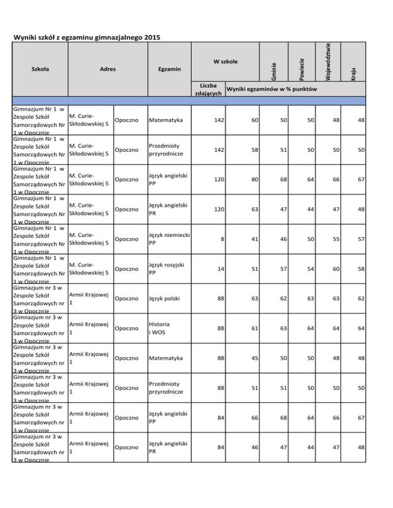 Egzamin Kraju Powiecie Adres Gminie W szkole Szkoła Województwie Wyniki szkół z egzaminu gimnazjalnego 2015 Liczba Wyniki egzaminów w % punktów zdających Gimnazjum Nr 1 w Zespole Szkół Samorządowych Nr 1 w Opocznie Gimnazjum Nr 1 w Zespole Szkół Samorządowych Nr 1 w Opocznie Gimnazjum Nr 1 w Zespole Szkół Samorządowych Nr 1 w Opocznie Gimnazjum Nr 1 w Zespole Szkół Samorządowych Nr 1 w Opocznie Gimnazjum Nr 1 w Zespole Szkół Samorządowych Nr 1 w Opocznie Gimnazjum Nr 1 w Zespole Szkół Samorządowych Nr 1 w Opocznie Gimnazjum nr 3 w Zespole Szkół Samorządowych nr 3 w Opocznie Gimnazjum nr 3 w Zespole Szkół Samorządowych nr 3 w Opocznie Gimnazjum nr 3 w Zespole Szkół Samorządowych nr 3 w Opocznie Gimnazjum nr 3 w Zespole Szkół Samorządowych nr 3 w Opocznie Gimnazjum nr 3 w Zespole Szkół Samorządowych nr 3 w Opocznie Gimnazjum nr 3 w Zespole Szkół Samorządowych nr 3 w Opocznie M. CurieOpoczno Skłodowskiej 5 Matematyka 142 60 50 50 48 48 M. CurieOpoczno Skłodowskiej 5 Przedmioty przyrodnicze 142 58 51 50 50 50 M. CurieOpoczno Skłodowskiej 5 Język angielski PP 120 80 68 64 66 67 M. CurieOpoczno Skłodowskiej 5 Język angielski PR 120 63 47 44 47 48 M. CurieOpoczno Skłodowskiej 5 Język niemiecki PP 8 41 46 50 55 57 M. CurieOpoczno Skłodowskiej 5 Język rosyjski PP 14 51 57 54 60 58 Armii Krajowej Opoczno 1 Język polski 88 63 62 63 63 62 Armii Krajowej Opoczno 1 Historia i WOS 88 61 63 64 64 64 Armii Krajowej Opoczno 1 Matematyka 88 45 50 50 48 48 Armii Krajowej Opoczno 1 Przedmioty przyrodnicze 88 51 51 50 50 50 Armii Krajowej Opoczno 1 Język angielski PP 84 66 68 64 66 67 Armii Krajowej Opoczno 1 Język angielski PR 84 46 47 44 47 48 Gimnazjum nr 3 w Zespole Szkół Samorządowych nr 3 w Opocznie Gimnazjum nr 3 w Zespole Szkół Samorządowych nr 3 w Opocznie Gimnazjum nr 3 w Zespole Szkół Samorządowych nr 3 w Opocznie Gimnazjum nr 3 w Zespole Szkół Samorządowych nr 3 w Opocznie Gimnazjum w Zespole Szkół im. Jana Pawła II w Mroczkowie Gościnnym Gimnazjum w Zespole Szkół im. Jana Pawła II w Mroczkowie Gościnnym Gimnazjum w Zespole Szkół im. Jana Pawła II w Mroczkowie Gościnnym Gimnazjum w Zespole Szkół im. Jana Pawła II w Mroczkowie Gościnnym Gimnazjum w Zespole Szkół im. Jana Pawła II w Mroczkowie Gościnnym Gimnazjum w Zespole Szkół im. Jana Pawła II w Mroczkowie Gościnnym Gimnazjum w Zespole Szkół im. Jana Pawła II w Mroczkowie Gościnnym Gimnazjum w Zespole Szkół w Bukowcu Opoczyńskim Gimnazjum w Zespole Szkół w Bukowcu Opoczyńskim Armii Krajowej Opoczno 1 Język niemiecki PP 2 56 46 50 55 57 Armii Krajowej Opoczno 1 Język niemiecki PR 1 45 33 39 44 41 Armii Krajowej Opoczno 1 Język rosyjski PP 2 91 57 54 60 58 Armii Krajowej Opoczno 1 Język rosyjski PR 2 85 64 64 48 42 50 Mroczków Język polski Gościnny 30 61 62 63 63 62 50 Mroczków Historia Gościnny i WOS 30 57 63 64 64 64 50 Mroczków Matematyka Gościnny 30 40 50 50 48 48 50 Mroczków Przedmioty Gościnny przyrodnicze 30 46 51 50 50 50 50 Mroczków Język angielski Gościnny PP 29 61 68 64 66 67 50 Mroczków Język angielski Gościnny PR 29 40 47 44 47 48 50 Mroczków Język niemiecki Gościnny PP 1 58 46 50 55 57 Bukowiec Opoczyński 74 Bukowiec Język polski Opoczyński 34 62 62 63 63 62 Bukowiec Opoczyński 74 Bukowiec Historia Opoczyński i WOS 34 63 63 64 64 64 Gimnazjum w Zespole Szkół w Bukowcu Opoczyńskim Gimnazjum w Zespole Szkół w Bukowcu Opoczyńskim Gimnazjum w Zespole Szkół w Bukowcu Opoczyńskim Gimnazjum w Zespole Szkół w Bukowcu Opoczyńskim Gimnazjum w Zespole Szkół w Bukowcu Opoczyńskim Gimnazjum w Wygnanowie Gimnazjum w Wygnanowie Gimnazjum w Wygnanowie Gimnazjum w Wygnanowie Gimnazjum w Wygnanowie Gimnazjum w Wygnanowie Gimnazjum w Wygnanowie Gimnazjum w Wygnanowie Prywatne Gimnazjum w Opocznie Prywatne Gimnazjum w Opocznie Prywatne Gimnazjum w Opocznie Prywatne Gimnazjum w Opocznie Prywatne Gimnazjum w Opocznie Prywatne Gimnazjum w Opocznie Prywatne Gimnazjum w Opocznie Bukowiec Opoczyński 74 Bukowiec Matematyka Opoczyński 34 51 50 50 48 48 Bukowiec Opoczyński 74 Bukowiec Przedmioty Opoczyński przyrodnicze 34 50 51 50 50 50 Bukowiec Opoczyński 74 Bukowiec Język angielski Opoczyński PP 20 68 68 64 66 67 Bukowiec Opoczyński 74 Bukowiec Język angielski Opoczyński PR 20 44 47 44 47 48 Bukowiec Opoczyński 74 Bukowiec Język niemiecki Opoczyński PP 14 45 46 50 55 57 Wygnanów 57 Wygnanów Język polski 27 58 62 63 63 62 Wygnanów 57 Wygnanów 27 64 63 64 64 64 Wygnanów 57 Wygnanów Matematyka 27 51 50 50 48 48 Wygnanów 57 Wygnanów 27 54 51 50 50 50 Wygnanów 57 Wygnanów 21 58 68 64 66 67 Wygnanów 57 Wygnanów 21 32 47 44 47 48 Wygnanów 57 Wygnanów 6 51 46 50 55 57 Wygnanów 57 Wygnanów 3 28 33 39 44 41 Historia i WOS Przedmioty przyrodnicze Język angielski PP Język angielski PR Język niemiecki PP Język niemiecki PR ul. Partyzantów Opoczno 1A Język polski 38 59 62 63 63 62 ul. Partyzantów Opoczno 1A Historia i WOS 38 59 63 64 64 64 ul. Partyzantów Opoczno 1A Matematyka 38 48 50 50 48 48 ul. Partyzantów Opoczno 1A Przedmioty przyrodnicze 38 46 51 50 50 50 ul. Partyzantów Opoczno 1A Język angielski PP 32 61 68 64 66 67 ul. Partyzantów Opoczno 1A Język angielski PR 27 42 47 44 47 48 ul. Partyzantów Opoczno 1A Język niemiecki PP 2 46 46 50 55 57 Prywatne Gimnazjum w Opocznie Prywatne Gimnazjum w Opocznie ul. Partyzantów Opoczno 1A Język rosyjski PP 4 62 57 54 60 58 ul. Partyzantów Opoczno 1A Język rosyjski PR 2 43 64 64 48 42 Gimnazjum Nr 2 z Oddziałami Integracyjnymi im. Władysława Jagiełły w Opocznie w Inowłodzka 3 Zespole Szkół Samorządowych Nr 2 z Oddziałami Integracyjnymi w Opocznie Opoczno Język polski 60 57 62 63 63 62 Gimnazjum Nr 2 z Oddziałami Integracyjnymi im. Władysława Jagiełły w Opocznie w Inowłodzka 3 Zespole Szkół Samorządowych Nr 2 z Oddziałami Integracyjnymi w Opocznie Opoczno Historia i WOS 60 56 63 64 64 64 Gimnazjum Nr 2 z Oddziałami Inte