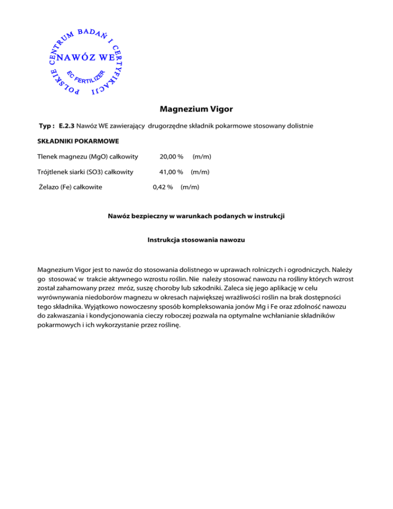 CE E C E NT R BADAŃ I U M ER CJ I PO I SK Z K RTIL I A EC FE R T YF I NAW Ó Z W E L Magnezium Vigor Typ : E.2.3 Nawóz WE zawierający drugorzędne składnik pokarmowe stosowany dolistnie SKŁADNIKI POKARMOWE Tlenek magnezu (MgO) całkowity 20,00 % (m/m) Trójtlenek siarki (SO3) całkowity 41,00 % (m/m) Żelazo (Fe) całkowite 0,42 % (m/m) Nawóz bezpieczny w warunkach podanych w instrukcji Instrukcja stosowania nawozu Magnezium Vigor jest to nawóz do stosowania dolistnego w uprawach rolniczych i ogrodniczych. Należy go stosować w trakcie aktywnego wzrostu roślin. Nie należy stosować nawozu na rośliny których wzrost został zahamowany przez mróz, suszę choroby lub szkodniki. Zaleca się jego aplikację w celu wyrównywania niedoborów magnezu w okresach największej wrażliwości roślin na brak dostępności tego składnika. Wyjątkowo nowoczesny sposób kompleksowania jonów Mg i Fe oraz zdolność nawozu do zakwaszania i kondycjonowania cieczy roboczej pozwala na optymalne wchłanianie składników pokarmowych i ich wykorzystanie przez roślinę. Orientacyjne dawki nawozu i terminy stosowania Dawka nawozu (kg/ha) Termin stosowania 1 do 2 Stosować kilka razy w okresie od początku krzewienia do pojawienia się liścia flagowego włącznie. Dawkę 2,5 kg stosować w okresie ochrony liścia flagowego i kłosa w celu poprawy jakości ziarniaków. Ziemniaki 2,0 Stosować do dwóch razy w okresie wegetacyjnym. Pierwszy zabieg około 7dni po pełni wschodów. Drugi po 10 - 14 dniach. Buraki cukrowe 2,0 Stosować raz lub dwa razy w okresie od 2 do 8 liści właściwych. Rzepak 1,5 Stosować dwa razy w okresie wegetacji. Raz w fazie pomiędzy 4 a 8 liściem właściwym drugi raz w momencie wydłużania się pędów. Zboża jare i ozime Kukurydza 1,0 do 2,0 Stosować raz lub dwa razy w okresie od 2 do 8 liści właściwych Stosować raz lub dwa razy w okresie od 6 do 8 liści właściwych Rośliny strączkowe 1,0 do 2,0 Warzywa w polu 1,0 do 2,0 jabłonie 2,0 do 3,0 pozostałe drzewa owocowe 1,0 do 2,0 truskawki 1,0 do 2,0 po stwierdzeniu niedoborów magnezu 3 -5 oprysków co kilka dni po kwitnieniu 3-4 razy co 10 dni po kwitnieniu 3-4 razy co 10 dni po kwitnieniu 3-4 razy co 10 dni Zalecana ilość wody: 100-300 l/ha. Ciecz roboczą przygotować z zachowaniem następującej kolejności: zbiornik opryskiwacza napełnić do 3/4 objętości woda, następnie uruchomić mieszadło i dodać ustaloną ilość nawozu. Po chwili uzupełnić wodą do żądanej objętości. Przygotowany roztwór zużyć bezpośrednio po sporządzeniu. W wypadku przygotowywania tzw. tank miksów nawóz wsypujemy jako pierwszy ze względu na jego zdolność do kondycjonowania i zakwaszania wody. Uwagi :Możliwość mieszania z innymi agrochemikaliami: Magnezium Vigor może być stosowany łącznie z większością dostępnych agrochemikaliów przeznaczonych do zabiegów przy pomocy opryskiwacza polowego czy sadowniczego. Przed sporządzeniem mieszaniny zbiornikowej w zbiorniku opryskiwacza zaleca się wykonanie próbnego mieszania w małej objętości wody. Nawóz może być stosowany z wykorzystaniem opryskiwaczy wszystkich typów. Zalecane opryskiwanie: średniokropliste lub drobnokropliste z włączonym mieszadłem .Zabieg należy przeprowadzać przy bezwietrznej pogodzie, w dni pochmurne lub wcześnie rano albo wieczorem. Środki ostrożności Nie przekraczać zalecanych dawek Przygotowany roztwór cieczy roboczej zużyć bezpośrednio po sporządzeniu., nie należy go zostawiać do następnego dnia. Chronić przed dziećmi Pojemnik z nawozem chronić przed uszkodzeniem W przypadku zanieczyszczenia oczu zmyć obficie wodą i pilnie skontaktować się z lekarzem. W przypadku zanieczyszczenia skóry zmyć obficie wodą. W trakcie pracy z nawozem nie należy jeść, pić i palić tytoniu, należy stosować środki ochrony osobistej W razie połknięcia pilnie skontaktować się z lekarzem W przypadku rozsypania się nawozu, jeżeli jest to możliwe, rozsypany proszek zebrać mechanicznie i umieścić w odpowiednio oznakowanych pojemnikach w celu utylizacji Po pracy umyć ręce i części ciała wystawione na działanie środka a odzież wyprać. KOD CN : 3105 90 91 Okres przydatności do stosowania: 5 lat KOD PKWIU : Instrukcja transportu i przechowywania : - Chronić przed bezpośrednim nasłonecznieniem - Chronić przed wilgocią i mrozem - Ilość warstw składowania w magazynie – max - Ilość warstw w czasie transportu – max - Nawóz przechowywać w temperaturze od 50C do 300C Data produkcji: Partia: Masa netto: Producent : Synthos Agro Sp. z o.o. ul. Chemików 1, 32-600 Oświęcim, tel. +48 33 847 47 77, fax +48 33 847 47 78 e-mail: [email protected]