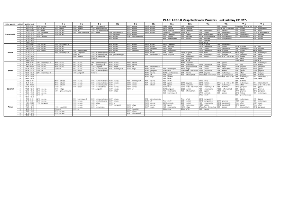 PLAN LEKCJI Zespolu Szkól w Pruszczu -rok szkolny 2016/17Dzień tygodnia Poniedziałek Wtorek Sroda Czwartek Piatek nr lekcji godzina lekcji 1 2 3 4 5 6 7 8 9 1 2 3 4 5 6 7 8 9 1 2 3 4 5 6 7 8 9 1 2 3 4 5 6 7 8 9 1 2 3 4 5 6 7 8 9 7.55 - 8.40 8.45 - 9.30 9.40 - 10.25 10.35 - 11.20 11.25 - 12.10 12.30 - 13.15 13.20 - 14.05 14.10 - 14.55 15.00 - 15.45 7.55 - 8-40 8.45 - 9.30 9.40 - 10.25 10.35 - 11.20 11.25 - 12.10 12.30 - 13.15 13.20 - 14.05 14.10 - 14.55 15.00 - 15.45 7.55 - 8-40 8.45 - 9.30 9.40 - 10.25 10.35 - 11.20 11.25 - 12.10 12.30 - 13.15 13.20 - 14.05 14.10 - 14.55 15.00 - 15.45 7.55 - 8-40 8.45 - 9.30 9.40 - 10.25 10.35 - 11.20 11.25 - 12.10 12.30 - 13.15 13.20 - 14.05 14.10 - 14.55 15.00 - 15.45 7.55 - 8-40 8.45 - 9.30 9.40 - 10.25 10.35 - 11.20 11.25 - 12.10 12.30 - 13.15 13.20 - 14.05 14.10 - 14.55 15.00 - 15.45 I II a 22/18 ed.wcz. 22/4 ed.wcz. 18/4 religia 11/18 j.angielski 22/19 wf 22/18 ed.wcz. 11/5 18/5 29/16 29/16 29/16 j.angielski religia ed.wcz. ed.wcz. ed.wcz. 22/18 22/18 22/18 18/18 29/9 29/16 29/16 29/16 29/9 informatyka A ed.wcz. ed.wcz. ed.wcz. informatyka B 29/16 29/16 29/16 27/ms ed.wcz. ed.wcz. ed.wcz. wf 22/9 22/18 22/18 22/18 22/19 22/9 22/18 22/18 22/18 22/19 ed.wcz. ed.wcz. ed.wcz. religia informatyka A ed.wcz. ed.wcz. ed.wcz. wf informatyka B ed.wcz. ed.wcz. ed.wcz. wf 29/18 29/18 29/18 27/19 18/16 1/19 ed.wcz. ed.wcz. ed.wcz. wf religia gimn.korekcyjna 22/18 ed.wcz. 22/18 ed.wcz. 11/18 j.angielski 11/18 27/ms 29/16 29/16 j.angielski wf ed.wcz. ed.wcz. II b 19/16 19/16 31/ms 1/19 ed.wcz. ed.wcz. wf gimn.korekcyjna II c III a 3/9 informatyka A 11/18 ed.polonistyczna 11/18 ed.polonistyczna 18/21 religia 15/9 11/17 34/17 34/17 informatyka A j.angielski ed.wcz. ed.wcz. III b III c IV a 42/17 42/17 42/17 42/17 42/18 1/19 ed.wcz. ed.wcz. ed.wcz. ed.wcz. ed.wcz. gimn.korekcyjna 10/15 10/15 10/15 10/15 ed.wcz. ed.wcz. ed.wcz. ed.wcz. 18/24 religia 23/12 historia 24/14 przyroda 7/ds wf chl 25/ms wf dz 35/12 j.angielski 21/5 muzyka 46/9 informatyka A ed.wcz. ed.wcz. ed.wcz. j,angielski 10/15 10/15 11/15 10/19 10/18 10/9 ed.wcz. ed.wcz. j.angielski wf ed.wcz. informatyka A 35/12 38/6 18/21 13/6 12/8 24/14 10/9 10/16 11/16 10/15 10/19 44/15 informatyka B ed.wcz. j.angielski ed.wcz. wf religia 10/7 10/7 10/7 ed.wcz. ed.wcz. ed.wcz. 1/19 10/19 10/15 10/15 44/17 gimn.korekcyjna wf ed.wcz. ed.wcz. religia 34/5 34/5 34/5 34/5 43/15 ed.matematyczna 34/19 11/15 ed.polonistyczna 1/19 43/15 ed.plastyczna 31/ms wf ed.wcz. ed.wcz. ed.wcz. ed.wcz. wf gimn.korekcyjna 42/17 42/17 42/17 11/17 19/9 11/16 31/ms 19/16 informatyka A j.angielski wf ed.wcz. 19/5 19/5 19/5 19/5 18/18 11/18 ed.wcz. ed.wcz. ed.wcz. ed.wcz. religia j.angielski 1/19 3/9 11/15 11/15 43/15 31/ms gimn.korekcyjna informatyka B j.angielski ed.polonistyczna ed.matematyczna wf 34/17 34/17 44/21 15/9 ed.wcz. ed.wcz. religia informatyka B 42/25 42/25 42/19 44/17 ed.wcz. ed.wcz. wf religia 19/16 19/16 19/16 18/16 ed.wcz. ed.wcz. ed.wcz. religia 43/15 43/15 11/15 11/15 11/15 ed.matematyczna ed.matematyczna ed.polonistyczna ed.przyrodnicza j.angielski 34/17 34/17 34/19 34/18 34/17 44/17 ed.wcz. ed.wcz. wf ed.wcz. ed.wcz. religia 42/9 42/24 42/17 42/17 42/19 informatyka A ed.wcz. ed.wcz. ed.wcz. wf 19/9 19/16 19/16 19/16 19/16 31/19 informatyka B ed.wcz. ed.wcz. ed.wcz. ed.wcz. wf 43/15 11/15 18/24 31/19 43/15 ed.matematyczna ed.polonistyczna religia wf ed.muzyczna 34/17 ed.wcz. 34/17 ed.wcz. 34/19 wf 11/17 j.angielski 44/18 42/19 11/17 42/17 42/9 religia wf j.angielski ed.wcz. informatyka B j.angielski technika religia matematyka j.polski przyroda 13/6 matematyka 25/ds wf dz 35/12 g.wychowawcza 12/8 j.polski 21/5 plastyka 7/ms wf chl 7/ds wf chl 12/8 j.polski 12/8 j.polski 25/ms wf dz 35/12 j.angielski 13/6 matematyka 46/9 informatyka B 7/ms 24/14 12/8 13/6 25/ds wf chl przyroda j.polski matematyka wf dz IV b 13/6 24/14 45/12 25/ms 20/8 38/6 21/5 matematyka przyroda j.angielski wf dz j.polski technika muzyka 24/14 przyroda 20/8 j.polski 13/6 matematyka 21/5 plastyka 7/ds wf chl 45/12 j.angielski 13/6 matematyka 13/6 g.wychowawcza 18/21 religia 25/ds wf dz 7/ms wf chl 23/8 historia 46/9 informatyka B 24/14 45/12 25/ms 20/22 46/9 przyroda j.angielski wf dz 7/ds wf chl j.polski informatyka A 7/ms 20/8 20/8 13/6 18/14 25/ds wf chl j.polski j.polski matematyka religia wf dz Va 13/6 30/8 46/9 27/14 38/6 21/5 27/ms 27/14 35/12 30/8 35/12 31/ds 13/6 21/5 matematyka j.polski informatyka A g.wychowawcza technika plastyka wf chl przyroda j.angielski A j.polski j.angielski B wf dz matematyka muzyka Vb 30/8 j.polski 7/ms wf chl 21/ds wf dz 21/5 muzyka 38/6 matematyka 24/14 przyroda 35/12 j. angielaski A 35/12 j. angielaski B 38/6 matematyka 30/8 j.polski 35/12 j.angielski A 24/14 przyroda 35/12 j.angielaski B 21/5 plastyka 31/ms wf dz 7/ds wf chl 35/12 j.angielski A 30/8 j.polski 30/8 j.polski 35/12 j.angielski B 27/14 przyroda 31/ds wf dz 27/ms wf chl 30/8 j.polski 30/8 j.polski 18/17 religia 46/9 informatyka A 23/6 historia 38/6 matematyka 7/14 g.wychowawcza 31/ds wf dz 7/ms wf chl 31/ms 23/12 18/24 46/9 13/6 30/8 27/14 27/ds 31/ms wf dz 7/ds wf chl 38/6 matematyka 38/6 technika 46/23 informatyka B 18/24 religia 30/8 j.polski wf dz historia religia informatyka B matematyka j.polski przyroda wf chl 35/12 j.angielski B 35/12 j.angielski A 13/6 matematyka 18/24 religia 27/ds wf chl 31/ms wf dz 30/8 j.polski 24/14 35/12 35/12 30/8 przyroda j.angielski A j.angielski B j.polski VI a VI b 31/ds wf dz 7/ms wf chl 30/8 j.polski 30/8 j.polski 21/5 muzyka 38/6 matematyka 3/9 informatyka A 31/ds 13/6 7/ds 31/12 21/5 41/8 41/8 wf dz matematyka wf chl g.wychowawcza plastyka j.polski j.polski 27/14 38/6 30/8 44/21 35/12 23/12 7/ds 31/ms przyroda matematyka j.polski religia j.angielski historia wf chl wf dz 1/21 27/14 35/12 30/8 7/ds 21/5 38/6 31/ds 38/6 38/6 31/ms 35/12 30/8 27/14 23/12 30/8 wdz przyroda j.angielski j.polski wf chl plastyka matematyka wf dz technika matematyka wf dz j.angielski j.polski przyroda historia g.wychowawcza 1/24 wdz 2