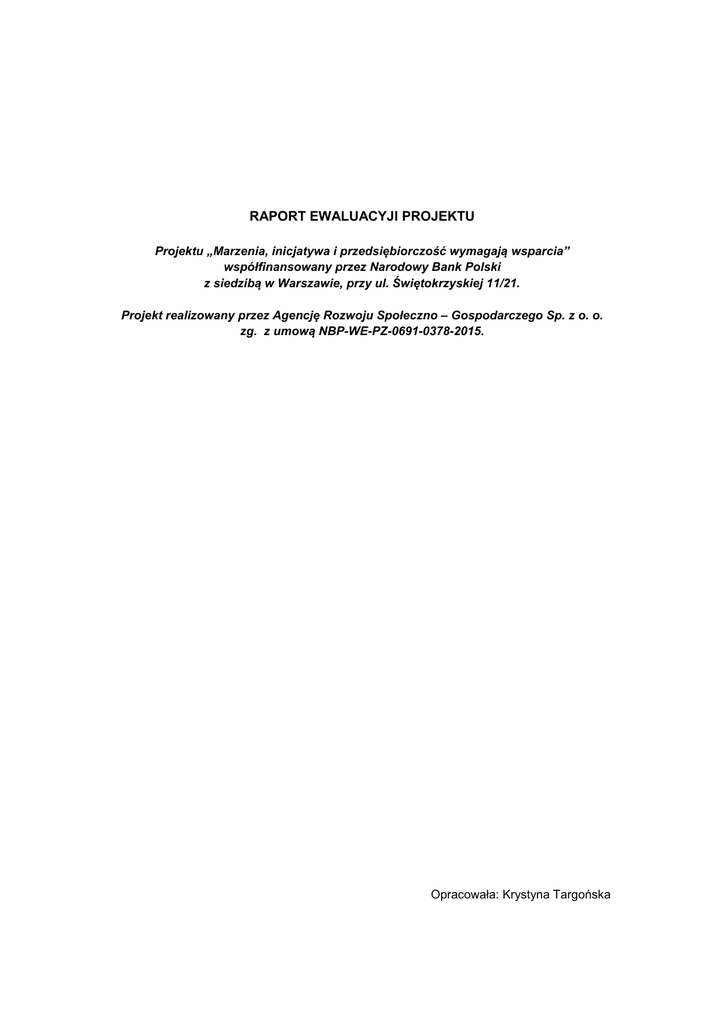 RAPORT EWALUACYJI PROJEKTU Projektu „Marzenia, inicjatywa i przedsiębiorczość wymagają wsparcia” współfinansowany przez Narodowy Bank Polski z siedzibą w Warszawie, przy ul. Świętokrzyskiej 11/21. Projekt realizowany przez Agencję Rozwoju Społeczno – Gospodarczego Sp. z o. o. zg. z umową NBP-WE-PZ-0691-0378-2015. Opracowała: Krystyna Targońska I. Wprowadzenie Projekt „Marzenia, inicjatywa i przedsiębiorczość wymagają wsparcia” współfinansowany był przez Narodowy Bank Polski z siedzibą w Warszawie, przy ul. Świętokrzyskiej 11/21. Projekt realizowany był przez Agencję Rozwoju Społeczno – Gospodarczego Sp. z o. o. zg z umową NBPWE-PZ-0691-0378-2015. Okres realizacji od 01.10.2015r. do 31.03.2016r. Odbiorcami projektu były osoby niepełnosprawne, od 18 do 55 roku życia, które nie brały udziału w projektach o podobnym charakterze. Zasięg projektu obejmował obszar powiatów: lubartowskiego, parczewskiego, lubelski i łeczyńskiego. Cel główny projektu: Wzrost poziomu wiedzy i umiejętności 32 osób niepełnosprawnych w zakresie bezpiecznego korzystania z usług bankowych, zakładania działalności gospodarczej oraz aktywnego poszukiwania pracy, w tym samozatrudnienia osiągnięty do końca marca 2016r. Proces autoewaluacji obejmował cztery etapy tj.: planowanie, gromadzenie i analizę danych, przedstawienie wyników ewaluacji w formie raportu oraz ich wykorzystanie. Dane wykorzystywane podczas procesu ewaluacji były zbierane za pomocą zastosowania metody ankiet. Ankieta przed rozpoczęciem pierwszej formy wparcia i po zakończeniu ostatniej formy wsparcia . Odbiorcy projektu zostali poinformowani w dokumentach rekrutacyjnych o tym, że będą proszeni o wzięcie udziału w ewaluacji również po zakończeniu projektu. Wyrazili zgodę na przetwarzanie danych osobowych na potrzeby ewentualnych badań. Przedmiotem autoewaluacji była ocena skuteczności, efektywności i trwałości projektu, a przede wszystkim osiągnięte rezultaty. Sposób mierzenia opierał na 68 ankietach wypełnionych przez odbiorców projektu przed rozpoczęciem pierwszej formy wsparcia i po zakończeniu ostatniej formy wsparcia w projekcie (34 ankiety przed i 34 ankiety po ). Informacje płynące z wypełnionych ankiet zostały przedstawione w sposób syntetyczny (bez wskazań i odwoływania się do odpowiedzi poszczególnych uczestników) w postaci zbiorczych zestawień statystycznych. Odbiorcy projektu wypełniali również po zakończeniu udziału w projekcie ankietę końcową oceniającą uczestnictwo w projekcie. W ewaluacji wykorzystane zostały również informacje i dane z ankiety predyspozycji i zainteresowań, testów i formularzy . Ewaluacja miała również na celu określenie przyszłych potrzeb w zakresie wiedzy, umiejętności i przedsiębiorczości tej grupy. II. Informacje o projekcie 1. Charakterystyka uczestników projektu W projekcie wzięło udział 34 uczestników 18 kobiet i 16 mężczyzn. Przeważająca grupą były osoby w przedziale wiekowym 36-49 lat 19 osób (52,9%) oraz osoby w przedziale wiekowym 26-35 lat -10 osób (29,4%). Większość uczestników bo aż 26 osób (76,5%) zamieszkuje w mieście a 8 osób (23,5%) na wsi. Łącznie 13 osób (38,2 %) posiadało wykształcenie średnie, 10 osób (29,4%) zawodowe, 8 osób (23,5%) wyższe a 3 osoby (8,9% )podstawowe lub gimnazjalne. W momencie przystąpienia do projektu spośród 34 uczestników 50% to były osoby bezrobotne, a 50% osób pracujące na umowę cywilno-prawną (umowa zlecenie lub umowy o pracę na czas określony (zastępstwo). Tylko 14,7% osób pracowało na umowy o pracę. Aż 88,2% osób pracujących zatrudnionych było tylko na część etatu, nie dla tego, że miało przeciwskazania ale z powodu braku zatrudnienia na pełny etat. Ponad 76,5% tych osób wykonywało pracę niezgodnie ze swoim wyuczonym zawodem, wykształceniem czy wcześniejszym doświadczeniem, tylko dlatego, że w tym zawodzie, że nie było dla innych ofert pracy a z powodu niepełnosprawności osoby te mają trudności z przemieszczaniem się. W projekcie przeważały osoby posiadające niepełnosprawność ruchową (26,5%) na wózkach inwalidzkich i poruszających się o kulach. Wiek Mężczyzna Kobieta suma do 25 26 -35 2 0 2 6 4 10 36 49 8 11 19 powyżej 50 0 3 3 Miejsce zamieszkania Wieś Miasto 3 5 8 13 13 26 Wykształcenie Podstawowe gimnazjalne Zawodowe średnie wyższe 1 2 3 4 6 10 7 6 13 4 4 8 2. Cele projektu Cel główny: Wzrost poziomu wiedzy i umiejętności 32 osób niepełnosprawnych w zakresie bezpiecznego korzystania z usług bankowych, zakładania działalności gospodarczej oraz aktywnego poszukiwania pracy, w tym samozatrudnienia osiągnięty do końca marca 2016r. Cele szczegółowe: 1) Zwiększenie poziomu wiedzy w zakresie zakładania działalności gospodarczej przez 32 os. niepełnosprawne osiągnięty do końca marca 2016r. 2) Poszerzanie wiedzy ekonomicznej oraz kształtowanie postawy przedsiębiorczej wśród 32 osób niepełnosprawnych osiągnięty do końca marca 2016r. 3) Podniesienie wiedzy z zakresu bezpiecznego korzystania z szerokiej i różnorodnej oferty banków przez 32 os. niepełnosprawne osiągnięty do końca marca 2016r. 4) Zwiększenie poziomu wiedzy z zakresu aktywnego poszukiwania pracy i samozatrudnienia przez 32 os. niepełnosprawne osiągnięty do końca marca 2016r. 3. Analiza badań Analiza badań przeprowadzonych w początkowej fazie realizacji projektu potwierdziła, że osoby niepełnosprawne mają duże utrudnienia na rynku pracy. Aż 50% uczestników projektu wskazywało, że jednym z głównych źródeł utrzymania są świadczenia rentowe lub środki uzyskiwane z pomocy społecznej i 85,3% stwierdziło, że te środki nie wystarczają na to, aby godnie żyć. Z tego powodu aż 76,5% uczestników podjęło pracę niezgodnie ze swoim wyuczonym zawodem, wykształceniem, ambicjami, za mniejsze wynagrodzenie i w niepełnym wymiarze godzinowym. Aż 76,5% 