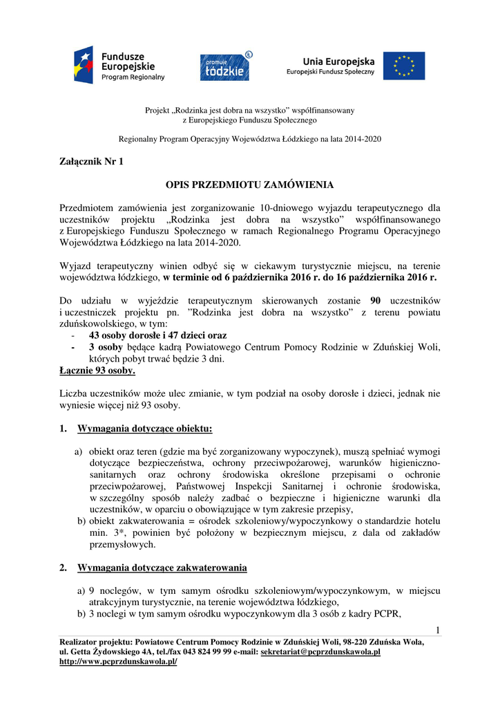 Projekt „Rodzinka jest dobra na wszystko” współfinansowany z Europejskiego Funduszu Społecznego Regionalny Program Operacyjny Województwa Łódzkiego na lata 2014-2020 Załącznik Nr 1 OPIS PRZEDMIOTU ZAMÓWIENIA Przedmiotem zamówienia jest zorganizowanie 10-dniowego wyjazdu terapeutycznego dla uczestników projektu „Rodzinka jest dobra na wszystko” współfinansowanego z Europejskiego Funduszu Społecznego w ramach Regionalnego Programu Operacyjnego Województwa Łódzkiego na lata 2014-2020. Wyjazd terapeutyczny winien odbyć się w ciekawym turystycznie miejscu, na terenie województwa łódzkiego, w terminie od 6 października 2016 r. do 16 października 2016 r. Do udziału w wyjeździe terapeutycznym skierowanych zostanie 90 uczestników i uczestniczek projektu pn. ”Rodzinka jest dobra na wszystko” z terenu powiatu zduńskowolskiego, w tym: - 43 osoby dorosłe i 47 dzieci oraz - 3 osoby będące kadrą Powiatowego Centrum Pomocy Rodzinie w Zduńskiej Woli, których pobyt trwać będzie 3 dni. Łącznie 93 osoby. Liczba uczestników może ulec zmianie, w tym podział na osoby dorosłe i dzieci, jednak nie wyniesie więcej niż 93 osoby. 1. Wymagania dotyczące obiektu: a) obiekt oraz teren (gdzie ma być zorganizowany wypoczynek), muszą spełniać wymogi dotyczące bezpieczeństwa, ochrony przeciwpożarowej, warunków higienicznosanitarnych oraz ochrony środowiska określone przepisami o ochronie przeciwpożarowej, Państwowej Inspekcji Sanitarnej i ochronie środowiska, w szczególny sposób należy zadbać o bezpieczne i higieniczne warunki dla uczestników, w oparciu o obowiązujące w tym zakresie przepisy, b) obiekt zakwaterowania = ośrodek szkoleniowy/wypoczynkowy o standardzie hotelu min. 3*, powinien być położony w bezpiecznym miejscu, z dala od zakładów przemysłowych. 2. Wymagania dotyczące zakwaterowania a) 9 noclegów, w tym samym ośrodku szkoleniowym/wypoczynkowym, w miejscu atrakcyjnym turystycznie, na terenie województwa łódzkiego, b) 3 noclegi w tym samym ośrodku wypoczynkowym dla 3 osób z kadry PCPR, 1 Realizator projektu: Powiatowe Centrum Pomocy Rodzinie w Zduńskiej Woli, 98-220 Zduńska Wola, ul. Getta Żydowskiego 4A, tel./fax 043 824 99 99 e-mail: [email protected] http://www.pcprzdunskawola.pl/ Projekt „Rodzinka jest dobra na wszystko” współfinansowany z Europejskiego Funduszu Społecznego Regionalny Program Operacyjny Województwa Łódzkiego na lata 2014-2020 c) 2 lub 3 osobowe pokoje z pełnym węzłem sanitarnym (natrysk, umywalka, WC), bieżąca ciepła woda przez całą dobę oraz TV, d) wyposażenie pokoi: łóżka z pościelą, szafka ubraniowa oraz wieszaki umożliwiające rozpakowanie bagażu przez każdego uczestnika wypoczynku (stosownie do liczby uczestników), e) łóżka w pokojach dwuosobowych powinny być oddzielone od siebie i stanowić odrębne posłania. Zamawiający nie dopuszcza pokoi z łóżkami piętrowymi. f) pokoje i łazienki utrzymane w czystości, bez wilgoci i zagrzybienia, g) świetlica i sale szkoleniowe na terenie ośrodka. 3. Wymagania dotyczące wyżywienia a) Zapewnienie pełnego wyżywienia uczestnikom w każdym dniu pobytu tj. cztery posiłki dziennie: 10 śniadań w tym 1 prowiant suchy w dniu wyjazdu na wypoczynek, 10 dwudaniowych obiadów, 10 podwieczorków, 10 kolacji w tym 1 prowiant suchy w dniu powrotu. b) 9 śniadań w formie bufetu szwedzkiego (zawierających co najmniej: pieczywo ciemne i jasne, 2 dania ciepłe np. parówki, jajecznica, naleśniki, wędliny różne, sery różne, masło, dżemy, płatki śniadaniowe, mleko ciepłe i zimne, świeże warzywa i owoce, bez ograniczeń: soki, woda mineralna, kawa herbata, itp.); c) 10 dwudaniowych obiadów z deserem (zawierających co najmniej: zupę, mięsa różne, ryby różne, ziemniaki/ryż/makaron/kasza, gotowane jarzyny, surówki, bez ograniczeń: soki, woda mineralna, kawa, herbata, itp.); d) 10 podwieczorków; e) 9 kolacji (zawierających co najmniej: pieczywo ciemne i jasne, przystawki różne - co najmniej 4 rodzaje, dania ciepłe, wędliny różne, sery różne, świeże warzywa i owoce, bez ograniczeń: woda mineralna, kawa, herbata, w tym: 2 kolacje w formie ogniska/grilla w I weekend pobytu oraz w przedostatnim dniu pobytu podczas, którego zostaną podane np.: kiełbaski, kaszanka, mięsa, szaszłyki, surówki, pieczywo ciemne i jasne, warzywa, herbata, kawa soki, sosy: keczup, musztarda i inne. f) Wymaga się, aby uczestnicy przez cały okres pobytu bez ograniczeń mieli dostęp do napojów, kawy, herbaty, ciastek, świeżych owoców. g) Zapewnienie pełnego wyżywienia dla 3 osób z kadry PCPR podczas 3 - dniowego pobytu. h) W czasie organizowanych wycieczek zapewniony zostanie suchy prowiant (kanapki, owoce, napoje), a po powrocie do ośrodka gorący posiłek. i) Miejsce przeznaczone do spożywania posiłków – stołówka – wydzielona od pozostałych pomieszczeń i znajdująca się na terenie ośrodka, umożliwiająca spożywanie posiłków jednocześnie przez wszystkich uczestników wypoczynku. 2 Realizator projektu: Powiatowe Centrum Pomocy Rodzinie w Zduńskiej Woli, 98-220 Zduńska Wola, ul. Getta Żydowskiego 4A, tel./fax 043 824 99 99 e-mail: [email protected] http://www.pcprzdunskawola.pl/ Projekt „Rodzinka jest dobra na wszystko” współfinansowany z Europejskiego Funduszu Społecznego Regionalny Program Operacyjny Województwa Łódzkiego na lata 2014-2020 4. Sprzęt i wyposażenie ośrodka: a) świetlica wyposażona w sprzęt nagłaśniający, z możliwością zorganizowania przez wychowawców m.in.: dyskotek, konkursów, turniejów i czasu wolnego oraz z możliwością przystosowania do prowadzenia zajęć socjoterapeutycznych i terapeutycznych, b) boisko z możliwością gry w piłkę nożną, siatkową i koszykową, c) sprzęt sportowy do organizowania zajęć przez wychowawców, dostosowany do potrzeb uczestników oraz realizacji oferty programowej, d) materiały do zajęć prowadzonych pr