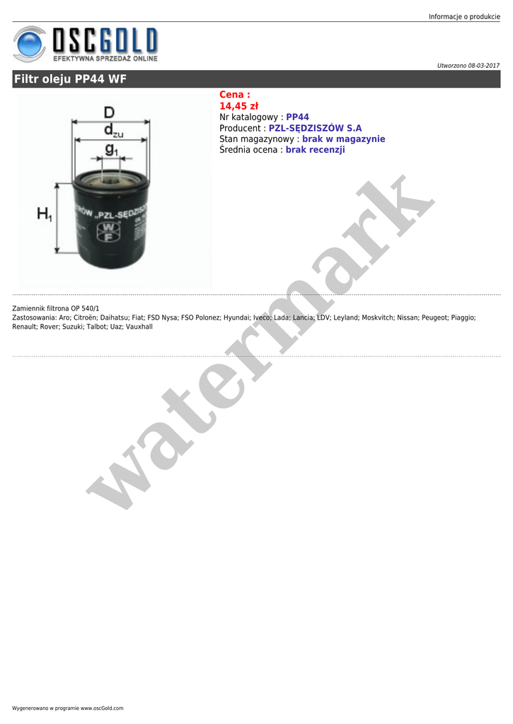 Informacje o produkcie Utworzono 08-03-2017 Filtr oleju PP44 WF Cena : 14,45 zł er m ar k Nr katalogowy : PP44 Producent : PZL-SĘDZISZÓW S.A Stan magazynowy : brak w magazynie Średnia ocena : brak recenzji w at Zamiennik filtrona OP 540/1 Zastosowania: Aro; Citroën; Daihatsu; Fiat; FSD Nysa; FSO Polonez; Hyundai; Iveco; Lada; Lancia; LDV; Leyland; Moskvitch; Nissan; Peugeot; Piaggio; Renault; Rover; Suzuki; Talbot; Uaz; Vauxhall Wygenerowano w programie www.oscGold.com
