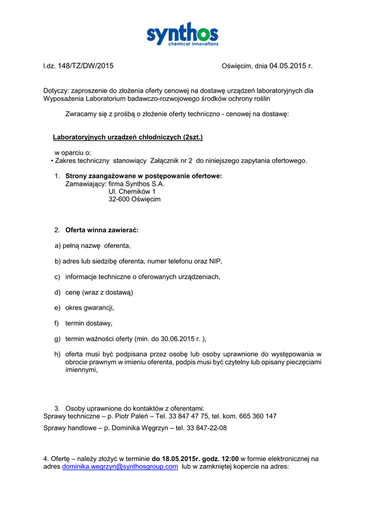 l.dz. 148/TZ/DW/2015 Oświęcim, dnia 04.05.2015 r. Dotyczy: zaproszenie do złożenia oferty cenowej na dostawę urządzeń laboratoryjnych dla Wyposażenia Laboratorium badawczo-rozwojowego środków ochrony roślin Zwracamy się z prośbą o złożenie oferty techniczno - cenowej na dostawę: Laboratoryjnych urządzeń chłodniczych (2szt.) w oparciu o: • Zakres techniczny stanowiący Załącznik nr 2 do niniejszego zapytania ofertowego. 1. Strony zaangażowane w postępowanie ofertowe: Zamawiający: firma Synthos S.A. Ul. Chemików 1 32-600 Oświęcim 2. Oferta winna zawierać: a) pełną nazwę oferenta, b) adres lub siedzibę oferenta, numer telefonu oraz NIP, c) informacje techniczne o oferowanych urządzeniach, d) cenę (wraz z dostawą) e) okres gwarancji, f) termin dostawy, g) termin ważności oferty (min. do 30.06.2015 r. ), h) oferta musi być podpisana przez osobę lub osoby uprawnione do występowania w obrocie prawnym w imieniu oferenta, podpis musi być czytelny lub opisany pieczęciami imiennymi, 3. Osoby uprawnione do kontaktów z oferentami: Sprawy techniczne – p. Piotr Paleń – Tel. 33 847 47 75, tel. kom. 665 360 147 Sprawy handlowe – p. Dominika Węgrzyn – tel. 33 847-22-08 4. Ofertę – należy złożyć w terminie do 18.05.2015r. godz. 12:00 w formie elektronicznej na adres [email protected] lub w zamkniętej kopercie na adres: Synthos S.A., przy ul. Chemików 1, 32-600 Oświęcim, Dział Zakupów Technicznych budynek E-119, pokój nr 17 z napisem: L.dz. 148/TZ/DW/2015 oferta – ,,urządzenia chłodnicze” nie otwierać 5. Postępowanie ofertowe prowadzone będzie wg procedur własnych Zamawiającego. 6. Po rozpatrzeniu ofert o decyzji Zamawiającego oferenci zostaną powiadomieni pisemnie. 7. Umowa zostanie zawarta z wybranym kontrahentem. 8. Koszt przygotowania oferty ponosi wyłącznie oferent. 9. Zamawiającemu przysługuje prawo do swobodnego wyboru oferty. 10. Z tytułu nieuwzględnienia ofert, oferentom nie przysługują żadne roszczenia przeciwko Zamawiającemu. 11. W razie nieuwzględnienia żadnej z ofert, Zamawiający zastrzega sobie możliwość negocjacji z wybranym oferentem. 12. Kryteria oceny ofert: • • • 70 % - cena 20 % - termin realizacji 10 % - gwarancja Prosimy o potwierdzenie gotowości do złożenia oferty cenowej telefonicznie 33/847 22 08 lub e-mail [email protected] Załączniki: - załącznik nr 1 - warunki handlowe - załącznik nr 2 – zakres techniczny Załącznik nr 1 Warunki handlowe dot. zapytania ofertowego nr 148/TZ/DW/2015 l.dz. 1. 2. 3. Wymagania Synthos SA Numer oferty ( wypełnić ) Oferta ważna do dnia ( wypełnić ) Cena Waluta 30.06.2015 PLN/EUR/USD 4. Termin płatności faktur 5. 6. Gwarancja ( wypełnić ) Termin realizacji 7. sugerowane 60 dni od dnia wpływu do zamawiającego min. 24 miesiące Do 8 tygodni od otrzymania zamówienia Uwagi/zmiany wprowadzone przez Wykonawcę Załącznik nr 2 do zapytania ofertowego nr 148/TZ/DW/2015 ZAKRES TECHNICZNY Przedmiotem zapytania są Urządzenia chłodnicze laboratoryjne. WYMAGANE PARAMETRY TECHNICZNE 1. Szafa chłodnicza (1 sztuka) Specyfikacja techniczna: • • • • • • • • • • • • • • • • • • • • • • • • • • • • Pojemność ok. 1500 L Zakres temperatury roboczej od ok. 0°C do ok. +15°C Sterowanie elektroniczne Zintegrowana pamięć danych z możliwością zapisu zdarzeń alarmowych Zewnętrzny cyfrowy wskaźnik temperatury Dynamiczny układ chłodzenia Automatyczne odszranianie Alarm braku zasilania Podtrzymanie przez minimum 72 godziny dokumentowania temperatury wnętrza i transmisji danych w przypadku braku zasilania Alarm temperatury i otwartych drzwi Oświetlenie LED Drzwi ze szkła izolacyjnego Materiał wnętrza: stal chromoniklowa Materiał półek: ruszty powlekane tworzywem sztucznym Półki przestawne Ilość półek: minimum 8 Rolki samonastawne Ładowność półek minimum 50 kg Samodomykające się drzwi Uchwyt otwierający w listwie drzwi Interfejs RS 485 Wymiary zewnętrzne nie większe niż - szer. x wys. x gł.: 1500 x 2200 x 900 mm Urządzenie wyposażone w kółka z hamulcem Poziom szumu: nie więcej niż 57 dB (A) Zasilanie 230 V Instrukcja obsługi w języku polskim Gwarancja: minimum 24 miesiące Warunki serwisu gwarancyjnego i pogwarancyjnego 2. Chłodziarko-zamrażarka (1 sztuka) Specyfikacja techniczna: • • • • • • • • • • • • • • • • • • • • • Pojemność użytkowa chłodziarki ok. 250 L Pojemność użytkowa zamrażarki ok. 110 L Zakres temperatury roboczej chłodziarki od ok. 2°C do ok. +10°C Zakres temperatury roboczej zamrażarki od ok. -10°C do ok. -30°C Sterowanie elektroniczne Zewnętrzny cyfrowy wskaźnik temperatury Dla chłodziarki: dynamiczny układ chłodzenia i automatyczne odszranianie Alarm braku zasilania Alarm otwartych drzwi Materiał półek chłodziarki: gęste ruszty powlekane tworzywem sztucznym (do przechowywania małych elementów) Ilość półek: minimum 5 (w tym minimum 4 przestawne) Ładowność półek chłodziarki minimum 40 kg Ilość szuflad w zamrażarce: 3 Samodomykające się drzwi Przestawne mocowanie drzwi Interfejs RS 485 Poziom szumu: nie więcej niż 45 dB (A) Zasilanie 230 V Instrukcja obsługi w języku polskim Gwarancja: minimum 24 miesiące Warunki serwisu gwarancyjnego i pogwarancyjnego