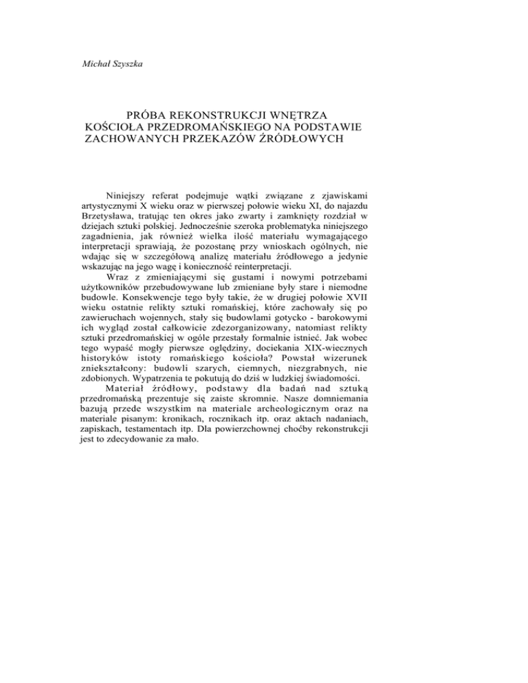 Michał Szyszka PRÓBA REKONSTRUKCJI WNĘTRZA KOŚCIOŁA PRZEDROMAŃSKIEGO NA PODSTAWIE ZACHOWANYCH PRZEKAZÓW ŹRÓDŁOWYCH Niniejszy referat podejmuje wątki związane z zjawiskami artystycznymi X wieku oraz w pierwszej połowie wieku XI, do najazdu Brzetysława, tratując ten okres jako zwarty i zamknięty rozdział w dziejach sztuki polskiej. Jednocześnie szeroka problematyka niniejszego zagadnienia, jak również wielka ilość materiału wymagającego interpretacji sprawiają, że pozostanę przy wnioskach ogólnych, nie wdając się w szczegółową analizę materiału źródłowego a jedynie wskazując na jego wagę i konieczność reinterpretacji. Wraz z zmieniającymi się gustami i nowymi potrzebami użytkowników przebudowywane lub zmieniane były stare i niemodne budowle. Konsekwencje tego były takie, że w drugiej połowie XVII wieku ostatnie relikty sztuki romańskiej, które zachowały się po zawieruchach wojennych, stały się budowlami gotycko - barokowymi ich wygląd został całkowicie zdezorganizowany, natomiast relikty sztuki przedromańskiej w ogóle przestały formalnie istnieć. Jak wobec tego wypaść mogły pierwsze oględziny, dociekania XIX-wiecznych historyków istoty romańskiego kościoła? Powstał wizerunek zniekształcony: budowli szarych, ciemnych, niezgrabnych, nie zdobionych. Wypatrzenia te pokutują do dziś w ludzkiej świadomości. Materiał źródłowy, podstawy dla badań nad sztuką przedromańską prezentuje się zaiste skromnie. Nasze domniemania bazują przede wszystkim na materiale archeologicznym oraz na materiale pisanym: kronikach, rocznikach itp. oraz aktach nadaniach, zapiskach, testamentach itp. Dla powierzchownej choćby rekonstrukcji jest to zdecydowanie za mało. Michał Szyszka Oczywistym jest, iż przed pojawieniem się architektury związanej z nową, chrześcijańską kulturą istniały na ziemiach polskich dawne, plemienne tradycje budowlane. Jednak historia nie dała nam przykładu drewnianego dworu bądź drewnianej siedziby książęcej.1 Rodzimych elementów w monumentalnej sztuce przedromańskiej najprawdopodobniej nie znajdziemy, jako że w całości była zjawiskiem sprowadzonym. Kluczowymi wydarzeniami dla sztuki romańskiej były wydarzenia związane z chrztem Polski. Ten zaiste artefakt to przyczynek dla importu począwszy od wzorów sztuki, kształtów architektury, jej symboliki i interpretacji, przez ideały postaw, postulowane typy osobowości, wzory życiowe, kończywszy na ich wykonawcach i realizatorach. Być może słusznie uważa się, że rok 966 to data pojawienia się w Polsce monumentalnej architektury murowanej.2 Należy jednak ponownie zwrócić uwagę na problemy związane z chronologią. Praktycznie nie możemy w zadowalający sposób datować pierwszych budowli romańskich. Mamy tu do czynienia głównie z reliktami, w najlepszym wypadku ruinami, zazwyczaj jednak są to fragmenty fundamentów, 4 często ich negatyw. Powstało wiele interpretacji odnośnie datowania i proweniencji pierwszej sztuki romańskiej. Pierwszy punkt sporu to teza bizantyjska dla najstarszej zabudowy Krakowa oraz Wiślicy, związana z chrystianizacją metodiańską (T. Lehr-Spławiński, J. Widąjewicz, Z. Świechowski). Jednak przejęcie typów architektonicznych mogło równie dobrze wiązać się z panowaniem sukcesora państwa Wielkomorawskiego Czech. To tłumaczyłoby podobieństwo rotundy Marii Panny na Wawelu do ówczesnej katedry św. Wita w Pradze (zbudowanej ok. 926-929 roku). Równoważna teza podważająca szerokie wpływy czeskie w Polsce przychyla się do cofnięcia w chronologii opanowania Małopolski przez ośrodek gnieźnieński do lat sześćdziesiątych dziewiątego wieku. Konsekwencją takiego stanu rzeczy byłaby względna jedność ziem Wiślan i Polan, co mogłoby tłumaczyć podobieństwa tak oryginalnego ' Historia Kultury materialnej Polski w zarysie, pod red. W.Hensla i J.Pazdura, 1.1, pod red. M.Dembińskiej i Z.Podwińskiej, Wrocław 1978, s.202-226. Jeśli natomiast by wierzyć relacji Długosza takie musiały istnieć. 2 Z.Świechowski, Sztuka romańska w Polsce, Warszawa 1990, s.ł 1. 3 Jak np. na Ostrowiu Lednickim. 4 Tu-pierwsze katedry w Pozananiu czy Gnieźnie. Próba rekonstrukcji wnętrza kościoła przedromańskiego na podstawie ... systemu architektonicznego, jakim jest pallatium połączone z kaplicą. Nie wnikając w szczegóły chciałbym tylko zwrócić uwagę na niejednorodność wpływów i ich krzyżowanie się. Dumnie brzmiące hasło „wzory bizantyjskie" nie powinno prowokować do przewartościowywania wiążących się z nim pojęć. Przecież cała sztuka wczesnego średniowiecza była synkretyzmem tradycji późnorzymskich i ich mutacji: sztuki wczesnochrześcijańskiej i bizantyjskiej (ten styl w pełni jeszcze się nie wykształcił, dlatego mowa o mutacji) oraz elementów rodzimych - barbarzyńskich. 5 Jeśli owe tradycje bizantyjskie docierają do Wielkopolski to nie tylko przez państwo Wiślan i akcję Metodego, nie tylko przez państwo Czeskie, ale także przez Ratyzbonę i Magdeburg, wraz z sztuką związaną z państwem Ottonów, jasno kontynuujących to, co zaczął w tej dziedzinie Karol Wielki, wywożąc z Rawenny prócz gotowych programów sztuki marmury, posadzki czy kolumny. Pora przedstawić materiały, którymi dysponujemy, a na bazie których możemy następnie starać się utworzyć modelowe wnętrze przedromańskiego kościoła. W X wieku wraz z kształtowaniem się pierwszej organizacji państwowej, formuje się jej organizacja przestrzenna, wzory konstrukcji urbanistycznych, w końcu zespół podobnych budowli. To państwowa, pierwsza geneza architektury romańskiej. Druga wynika bezpośrednio z potrzeb nowej religii. Obie genezy „ucieleśniły się" podczas chrztu polski dając młodemu księciu nową jakość, doskonale odpowiadającą na jego potrzeby. Jeśli pójdziemy dalej obraną drogą zobaczymy w sztuce przedromańskiej cztery wątki: bu