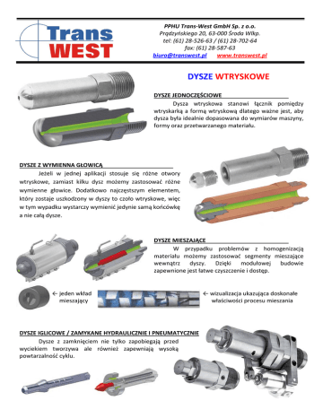 PPHU Trans-West GmbH Sp. z o.o. Prądzyńskiego 20, 63-000 Środa Wlkp. tel: (61) 28-526-63 / (61) 28-702-64 fax: (61) 28-587-63 [email protected] www.transwest.pl DYSZE WTRYSKOWE DYSZE JEDNOCZĘŚCIOWE Dysza wtryskowa stanowi łącznik pomiędzy wtryskarką a formą wtryskową dlatego ważne jest, aby dysza była idealnie dopasowana do wymiarów maszyny, formy oraz przetwarzanego materiału. DYSZE Z WYMIENNA GŁOWICĄ Jeżeli w jednej aplikacji stosuje się różne otwory wtryskowe, zamiast kilku dysz możemy zastosować różne wymienne głowice. Dodatkowo najczęstszym elementem, który zostaje uszkodzony w dyszy to czoło wtryskowe, więc w tym wypadku wystarczy wymienić jedynie samą końcówkę a nie całą dysze. DYSZE MIESZAJĄCE W przypadku problemów z homogenizacją materiału możemy zastosować segmenty mieszające wewnątrz dyszy. Dzięki modułowej budowie zapewnione jest łatwe czyszczenie i dostęp. ← jeden wkład mieszający DYSZE IGLICOWE / ZAMYKANE HYDRAULICZNIE I PNEUMATYCZNIE Dysze z zamknięciem nie tylko zapobiegają przed wyciekiem tworzywa ale również zapewniają wysoką powtarzalność cyklu. ← wizualizacja ukazująca doskonałe właściwości procesu mieszania DYSZE FILTRUJĄCE Dysze z wkładem filtrującym stosuje się aby zapewnić najwyższą jakość i strukturę materiału, bez niepożądanych wtrąceń ani zanieczyszczeń. Dodatkowo filtr chroni systemy gorąco kanałowe przed zablokowaniem przepływu i zapewnia stabilność procesu. Standardowe rozmiary filtrów: mm Typ 1 Typ 2 Typ 3 L 45 45 50 d Ø 14 Ø 20 Ø 25 d1 Ø8 Ø 12 Ø 16 d2 Ø 2,5 Ø 2,8 Ø 3,8 S 0,2 / 0,3 / 0,6 / 0,8 / 1,0 0,2 / 0,4 / 0,6 / 0,8 / 1,0 0,2 / 0,4 / 0,6 / 0,8 / 1,0 ADAPTERY Podobnie jak w przypadku dysz z wymienną głowicą adaptery służą do zamontowania wielu głowic do jednego korpusu dyszy. Oprócz naszej szerokiej gamy standardowych modeli jesteśmy wstanie opracować i zaoferować wszelkie wykonania niestandardowe i specjalne. W CELU ZAPOZNANIA SIĘ Z PEŁNYM ASORTYMENTEM SERDECZNIE ZAPRASZAMY NA NASZĄ STRONĘ INTERNETOWĄ: www.transwest.pl ZAPYTANIA OFERTOWE PROSIMY KIEROWAĆ NA: [email protected]