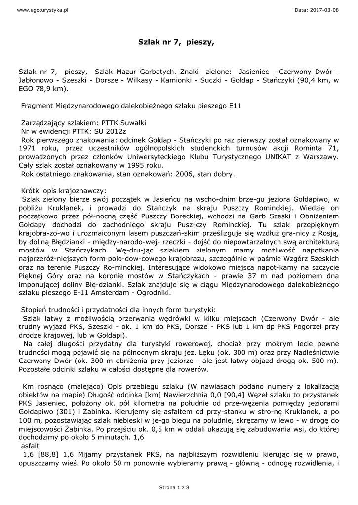 www.egoturystyka.pl Data: 2017-03-08 Szlak nr 7, pieszy, Szlak nr 7, pieszy, Szlak Mazur Garbatych. Znaki zielone: Jasieniec - Czerwony Dwór Jabłonowo - Szeszki - Dorsze - Wilkasy - Kamionki - Suczki - Gołdap - Stańczyki (90,4 km, w EGO 78,9 km). Fragment Międzynarodowego dalekobieżnego szlaku pieszego E11 Zarządzający szlakiem: PTTK Suwałki Nr w ewidencji PTTK: SU 2012z Rok pierwszego znakowania: odcinek Gołdap - Stańczyki po raz pierwszy został oznakowany w 1971 roku, przez uczestników ogólnopolskich studenckich turnusów akcji Rominta 71, prowadzonych przez członków Uniwersyteckiego Klubu Turystycznego UNIKAT z Warszawy. Cały szlak został oznakowany w 1995 roku. Rok ostatniego znakowania, stan oznakowań: 2006, stan dobry. Krótki opis krajoznawczy: Szlak zielony bierze swój początek w Jasieńcu na wscho-dnim brze-gu jeziora Gołdapiwo, w pobliżu Kruklanek, i prowadzi do Stańczyk na skraju Puszczy Rominckiej. Wiedzie on początkowo przez pół-nocną część Puszczy Boreckiej, wchodzi na Garb Szeski i Obniżeniem Gołdapy dochodzi do zachodniego skraju Pusz-czy Rominckiej. Tu szlak przepięknym krajobra-zo-wo i urozmaiconym lasem puszczań-skim prześlizguje się wzdłuż gra-nicy z Rosją, by doliną Błędzianki - między-narodo-wej- rzeczki - dojść do niepowtarzalnych swą architekturą mostów w Stańczykach. Wę-dru-jąc szlakiem zielonym mamy możliwość napotkania najprzeróż-niejszych form polo-dow-cowego krajobrazu, szczególnie w paśmie Wzgórz Szeskich oraz na terenie Puszczy Ro-minckiej. Interesujące widokowo miejsca napot-kamy na szczycie Pięknej Góry oraz na koronie mostów w Stańczykach - prawie 37 m nad poziomem dna imponującej doliny Błę-dzianki. Szlak znajduje się w ciągu Międzynarodowego dalekobieżnego szlaku pieszego E-11 Amsterdam - Ogrodniki. Stopień trudności i przydatności dla innych form turystyki: Szlak łatwy z możliwością przerwania wędrówki w kilku miejscach (Czerwony Dwór - ale trudny wyjazd PKS, Szeszki - ok. 1 km do PKS, Dorsze - PKS lub 1 km dp PKS Pogorzel przy drodze krajowej, lub w Gołdapi). Na całej długości przydatny dla turystyki rowerowej, chociaż przy mokrym lecie pewne trudności mogą pojawić się na północnym skraju jez. Łęku (ok. 300 m) oraz przy Nadleśnictwie Czerwony Dwór (ok. 300 m obniżenia przy jeziorze - ale jest łatwy objazd drogą ok. 500 m). Pozostałe odcinki szlaku w całości dostępne dla rowerów. Km rosnąco (malejąco) Opis przebiegu szlaku (W nawiasach podano numery z lokalizacją obiektów na mapie) Długość odcinka [km] Nawierzchnia 0,0 [90,4] Węzeł szlaku to przystanek PKS Jasieniec, położony ok. pół kilometra na południe od prze-wężenia pomiędzy jeziorami Gołdapiwo (301) i Żabinka. Kierujemy się asfaltem od przy-stanku w stro-nę Kruklanek, a po 100 m, pozostawiając szlak niebieski w je-go biegu na południe, skręcamy w lewo - w drogę do miejscowości Żabinka. Po przejściu ok. 0,5 km w oddali ukazują się zabudowania wsi, do której dochodzimy po około 5 minutach. 1,6 asfalt 1,6 [88,8] 1,6 Mijamy przystanek PKS, na najbliższym rozwidleniu kierując się w prawo, opuszczamy wieś. Po około 50 m ponownie wybieramy prawą - główną - odnogę rozwidlenia, i Strona 1 z 8 www.egoturystyka.pl Data: 2017-03-08 Szlak nr 7, pieszy, idąc w stronę widocznego w oddali gospodarstwa kontynuujemy wędrówkę wśród pól. Mijamy po prawej domostowo. Kolejne 500 m drogi doprowadza nas do starej wierzby, którą ob-cho-dzimy z lewej i wijącą się drogą przechodzimy obok zagrody Żabinki 18. 1,7 żwirówka 3,3 [87,1] W ostrym skręcie w lewo maszerujemy w kierunku lasu. Trzymając się głównej drogi, mija-my po lewej kolejne gospodarstwo (Żabinki 20; 3,8 km szlaku). 0,5 gruntowa 3,8 [86,6] Droga kręcąc się, schodzi w obniżenie. Ku wschodowi dominuje nad lasem wzniesienie Czar-ciej Góry. Po prawej leżące w dole w kształcie gruszki jezio-ro Łękuk, otoczone la-sem łęgo-wym. Obchodzimy jezioro od północy mocno zniszczoną drogą. 0,4 Jw. 4,2 [86,2] 4,2 Prze-cho-dzi-my strumień przeno-szą-cy wody je-ziorka Łękuk (302) do jeziora Gołdapiwo. 50 m od wypływu strumienia z je-ziora widać wodowskaz - punkt pomiarowy Stacji Monitoringu Środo-wi-ska. Na rozdrożu - 200 m dalej - kierujemy się w pra-wo, przechodzimy maleńki stru-mień sączączy się do jeziora i wznoszącym się stokiem wę-drujemy wzdłuż brzegu jeziora. Niedaleko od strumienia mijamy z prawej resztki zabudowań. W głębi drzew z prawej strony też resztki zabu-dowań. Przechodzimy łąkę nadjeziorną porośniętą trzciną i podcho-dzimy na niewielkie wzgórze, kierując się w stronę wysokiego masztu z wiatromierzem i dalej ku zabudowaniom wsi Czarcia Góra. 1,0 Jw. 5,2 [85,2] Mijamy budynek Stacji kompleksowego monitoringu środowiska. Pusz-cza Bo-rec-ka (303). Idziemy dalej, po prawej mijamy gospodarstwo Czarcia Góra 1 i sto metrów dalej dochodzimy do bitej, żwirowej drogi prowa-dzą-cej do wsi Jeziorowskie. 0,2 Jw. 5,4 [85,0] Tu skręcamy w prawo i zaraz na zakręcie w lewo 0,2 Droga bita 5,6 [84,8] Opu-szczamy żwirówkę, kierując się w lewo, w starą drogę brukową. Biegnie ona przez połud-niowe zbocza Diablej Góry (304). 0,2 bruk 5,8 [84,6] Po 200 m bruk skręca w prawo, my zaś idziemy w lewo żwirówką. 0,3 żwirówka 6,1 [84,3] 100 m dalej, przy słu-p-ku oddziałowym 175/162 kierujemy się w prawą, leśną drogę (5,9 km). 0,1 leśna gruntowa 6,2 [84,2] Prowadzi nas ona przez mieszany las ze świerkiem i sosną. Gdy droga biegnie pośród podmokłych łąk, prze-kraczamy przepust i nieco dalej pod-chodzimy zboczem wzniesienia. Na najbliższym zakręcie drogi wybie-ra-my to rozwidlenie, którym skręcamy ostro w prawo i pofalo-wanym tere-nem docho-dzi-my do następnego roz-widlenia. Tu kierujemy się w lewo i dochodzimy do szerszej, wyjeżdżonej drogi. Mijając kolejne drogi leśne wędrujemy, trzyma-jąc się głównego traktu, podsypaneg