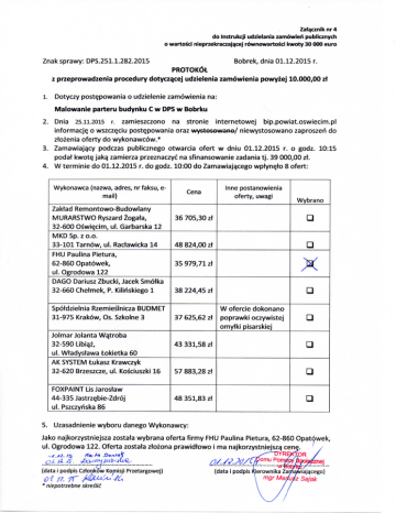 Zatqcznik nr 4 do Instrukcji udzielania zamowieri publicznych O wartosci nieprzekraczajace j rownowartosci kwoty 30 000 euro Znak sprawy: DPS.251.1.282.2015 Bobrek, dnia 01.12.2015 r. PROTOK6t z przeprowadzenia procedury dotyczqcej udzielenia zamowienia powyzej 10.000,00 zt 1. Dotyczy postQpowania o udzielenie zamowienia na: Malowanie partem budynku C w DPS w Bobrku 2. Dnia 25.11.2015 r. zamieszczono na stronie internetowej bip.powiat.oswiecim.pl informacje, o wszczeciu post^powania oraz wystosowano/ niewystosowano zaproszeh do ztozenia oferty do wykonawcow.* 3. Zamawiajaxy podczas publicznego otwarcia ofert w dniu 01.12.2015 r. o godz. 10:15 podat kwote. jakq zamierza przeznaczyc na sfinansowanie zadania tj. 39 000,00 zt. 4. W terminie do 01.12.2015 r. do godz. 10:00 do Zamawiaja.cego wptyneto 8 ofert: Wykonawca (nazwa, adres, nr faksu, email) Zaktad Remontowo-Budowlany MURARSTWO Ryszard Zogata, 32-600 Oswi^cim, ul. Garbarska 12 MKD Sp. zo.o. 33-101 Tarnow, ul. Ractawicka 14 FHU Paulina Pietura, 62-860 Opatowek, ul. Ogrodowa 122 DAGO Dariusz Zbucki, Jacek Smotka 32-660 Chetmek, P. Kiliriskiego 1 Inne postanowienia oferty, uwagi Cena 36 705,30 zt • 48 824,00 zt • 35 979,71 zt X 38 224,45 zt • Spotdzielnia Rzemieslnicza BUDMET W ofercie dokonano 31-975 Krakow, Os. Szkolne 3 37 625,62 zt poprawki oczywistej omytki pisarskiej Jolmar Jolanta Wa^troba 32-590 Libia.z, 43 331,58 zt ul. Wtadystawa tokietka 60 AK SYSTEM tukasz Krawczyk 32-620 Brzeszcze, ul. Kosciuszki 16 57 883,28 zt FOXPAINT LisJarostaw 44-335 Jastrz^bie-Zdroj ul. Pszczyhska 86 Wybrano 48 351,83 zt • • • • 5. Uzasadnienie wyboru danego Wykonawcy: Jako najkorzystniejsza zostata wybrana oferta firmy FHU Paulina Pietura, 62-860 Opatowek, ul. Ogrodowa 122. Oferta zostata ztozona prawidtowo i ma najkorzystniejsza. cene. •4.42. is rim k* £>*ma>k „.QLJ±A\„.S^?V^^T.. (data i podpis Cztonkow Komisji Przetargowej) * niepotrzebne skreslic DYREKjOR /M/frMfzjP?"* ^feKjpy^ (data i podpis Kierownika ZamaMaja.cego) mgrMa/u/zSajak