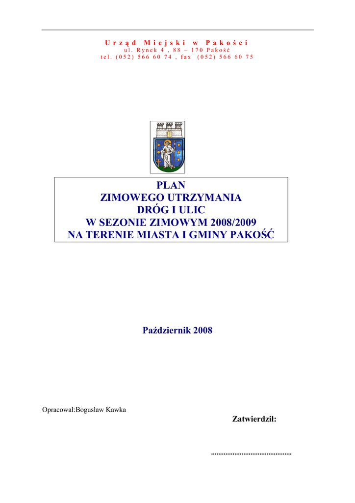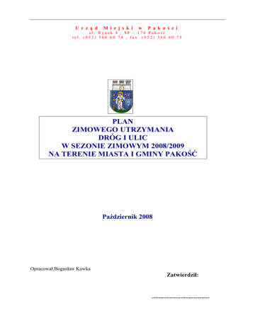 U r z ą d M i e j s k i w P a k o ś c i ul. Rynek 4 , 88 – 170 Pakość tel. (052) 566 60 74 , fax (052) 566 60 75 PLAN ZIMOWEGO UTRZYMANIA DRÓG I ULIC W SEZONIE ZIMOWYM 2008/2009 NA TERENIE MIASTA I GMINY PAKOŚĆ Październik 2008 Opracował:Bogusław Kawka Zatwierdził: ............................................. 1.INFORMACJE OGÓLNE 1.1.Podstawy prawne Prawną podstawę utrzymania dróg i ulic na terenie Miasta i Gminy Pakość w okresie zimowym stanowią: ustawa z dnia 21 marca 1985 roku o drogach publicznych (Dz.U. z 2004 r. Nr 204, poz. 2086 z późn. zm.); Zarządzenie nr 46 Ministra Transportu i Gospodarki Morskiej z dnia 25 października 1994 roku, w sprawie zasad odśnieŜania i usuwania gołoledzi na drogach publicznych ( DZ. U. Nr 10 MTiGM z dnia 26 października 1994 r.); Ustawa z dnia 13 września 1996 roku o utrzymaniu czystości i porządku w gminach (Dz.U. Nr 132, poz. 622 z późn. zm.). Obowiązki Gminy oraz właścicieli i zarządców nieruchomości w tym zakresie określa Uchwała Nr XXXII/221/06 Rady Miejskiej w Pakości z dnia 22 czerwca 2006 r. w sprawie regulaminu utrzymania czystości i porządku na terenie gminy Pakość. 1.2.Zasady przeprowadzenia akcji zimowej Umowny sezon zimowy w zakresie oczyszczania miasta rozpoczyna się od dnia podpisania umowy i trwa do końca miesiąca marzec 2009 rok. W przypadku wydłuŜenia skutków zimy Zamawiający zastrzega prawo zmiany terminu „Akcji Zima”. Łączna długość dróg i ulic w ramach zimowego utrzymania wynosi: -miasto 22,56 km -gmina 40,91 km Koordynatorem „ Akcji Zima” jest Urząd Miejski w Pakości. W skład Zespołu ds. „Akcji Zima” wchodzą: 1.Burmistrz Pakości – Wiesław Kończal 2.Kierownik Posterunku Policji w Pakości – aspirant Tomasz Pacholski 3.Kierownik Referatu Komunalno Inwestycyjnego Rolnictwa i Ochrony Środowiska Urzędu Miejskiego – Joanna Zemełka 4.Pracownik Urzędu Miejskiego – Bogusław Kawka Koordynowanie akcją zima 2008/2009 polega na nadzorze i uzgodnieniu działań z Wykonawcą usługi zimowego utrzymania dróg i ulic. Oznacza to, Ŝe firma, z którą Gmina zawrze w wyniku przetargu umowę, gwarantuje w tym okresie pełne zabezpieczenie kadrowe, techniczne i materiałowe, zapewniające skuteczne zwalczanie skutków zimy na ulicach, drogach i chodnikach zgodnie z Instrukcją dotyczącą prowadzenia akcji zimowego utrzymywania dróg, ulic i chodników na terenie Miasta i Gminy Pakość. Wykonawca wszystkie polecenia i uwagi Koordynatora dokumentuję w formie zapisu w dzienniku, w którym naleŜy odnotowywać wszystkie wydarzenia związane z prowadzeniem akcji zimowej (jakie i ile metrów drogi, ulice, chodniki odśnieŜono z podaniem daty zdarzenia, osoby zlecającej i godziny zgłoszenia). Do zadań Wykonawcy naleŜy: 1.Organizacja materiałów, środków technicznych i transportowych przy odśnieŜaniu dróg, ulic oraz likwidacja gołoledzi na terenie miasta i gminy. (Materiały i środki do zwalczania gołoledzi Wykonawca zabezpiecza we własnym zakresie zgodnie z normami zawartymi w Rozporządzeniu Ministra Środowiska z dnia 27 października 2005 r., Dz.U. 2005 nr 230 poz. 1960). 2.Organizacja prac w zakresie oczyszczania miasta i gminy ze śniegu i błota śnieŜnego sposobem ręcznym i mechanicznym, utrzymania przejezdności dróg i ulic na terenie miasta i gminy, z uwzględnieniem w miarę potrzeb usług zleconych ewentualnie Podwykonawcom. 3.Organizacja i prowadzenie wywozu błota śnieŜnego z ulic na terenie miasta. Wykonawca zobowiązany jest do stosowania powyŜszych zaleceń w przypadku katastrofalnego opadu śniegu, zamieci i gołoledzi. Zgodnie z w/w Uchwałą Rady Miejskiej Nr XXXII/221/06 na właścicielu i zarządcy nieruchomości spoczywa obowiązek usunięcia śliskości z chodników połoŜonych wzdłuŜ nieruchomości, a takŜe uprzątnięcia błota, śniegu, lodu i innych zanieczyszczeń z tych chodników i umieszczenia ich przy krawęŜniku chodnika od strony jezdni, dotyczy to równieŜ podwórzy budynków mieszkalnych. Właściciel nieruchomości zobowiązany jest takŜe do usuwania nawisów (sopli) z okapów rynien i innych części elewacji. W posesjach stanowiących mieszkaniowy zasób gminy obowiązek ten spoczywa na Przedsiębiorstwie Usług Gminnych Sp. z o.o. z siedzibą w Pakości. Standaryzacja prac w ramach zimowego utrzymania dróg ma na celu zapewnienie moŜliwie jednakowych warunków ruchu na drogach zaliczonych do tej samej kategorii na terenie gminy. SKŁADOWISKO ŚNIEGU WYZNACZONO PRZY RZECE NOTEĆ, W ODLEGŁOŚCI DO 1 KM OD MIASTA (UL. śABIA) 2.INSTRUKCJA DOTYCZĄCA PROWADZENIA AKCJI ZIMOWEGO UTRZYMANIA DRÓG, ULIC I CHODNIKÓW NA TERENIE MIASTA I GMINY PAKOŚĆ Ogólnie w zimowym utrzymaniu dróg przy średnich warunkach pogodowych obowiązuje 6 standardów. Nie określa się w standardach techniki odśnieŜania ani technologii zwalczania śliskości. W związku z tym stan w danym standardzie jest obowiązujący. W wyjątkowych wypadkach mogą być dopuszczalne odstępstwa od standardów, ale słowo „dopuszcza” naleŜy interpretować jako „zezwala” lecz nie „nakazuje”. W sezonie zimowym 2008/2009 drogi zamiejskie będą utrzymywane w standardzie 3 i 5, ulice w miastach w standardzie 2 zgodnie z w/w zarządzeniem nr 46 Ministra Transportu i Gospodarki Morskiej z 1994 r. (tabela 1.).