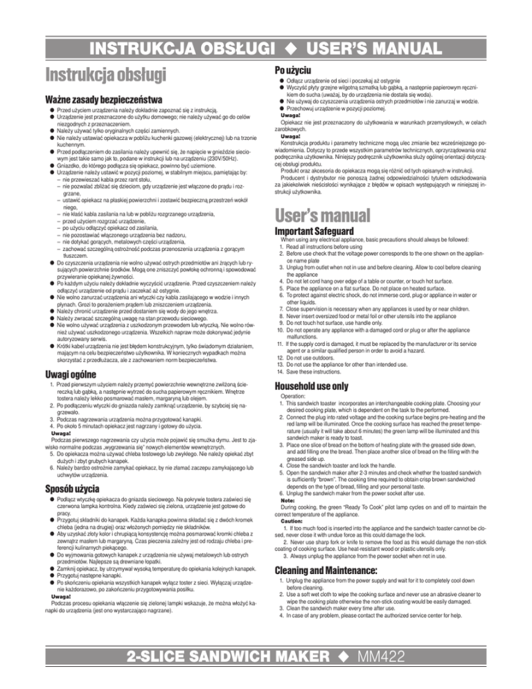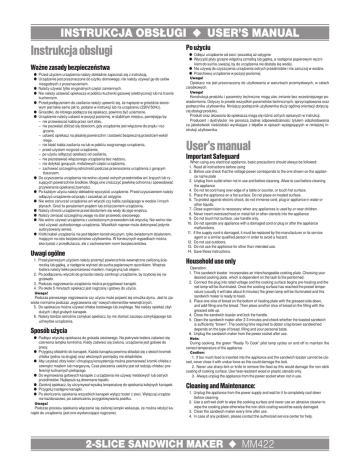 INSTRUKCJA OBSŁUGI u USER’S MANUAL Instrukcja obsługi Ważne zasady bezpieczeństwa Przed użyciem urządzenia należy dokładnie zapoznać się z instrukcją. Urządzenie jest przeznaczone do użytku domowego; nie należy używać go do celów niezgodnych z przeznaczeniem. Należy używać tylko oryginalnych części zamiennych. Nie należy ustawiać opiekacza w pobliżu kuchenki gazowej (elektrycznej) lub na trzonie kuchennym. Przed podłączeniem do zasilania należy upewnić się, że napięcie w gnieździe sieciowym jest takie samo jak to, podane w instrukcji lub na urządzeniu (230V/50Hz). Gniazdko, do którego podłącza się opiekacz, powinno być uziemione. Urządzenie należy ustawić w pozycji poziomej, w stabilnym miejscu, pamiętając by: – nie przewieszać kabla przez rant stołu, – nie pozwalać zbliżać się dzieciom, gdy urządzenie jest włączone do prądu i rozgrzane, – ustawić opiekacz na płaskiej powierzchni i zostawić bezpieczną przestrzeń wokół niego, – nie kłaść kabla zasilania na lub w pobliżu rozgrzanego urządzenia, – przed użyciem rozgrzać urządzenie, – po użyciu odłączyć opiekacz od zasilania, – nie pozostawiać włączonego urządzenia bez nadzoru, – nie dotykać gorących, metalowych części urządzenia, – zachować szczególną ostrożność podczas przenoszenia urządzenia z gorącym tłuszczem. Do czyszczenia urządzenia nie wolno używać ostrych przedmiotów ani żrących lub rysujących powierzchnie środków. Mogą one zniszczyć powłokę ochronną i spowodować przywieranie opiekanej żywności. Po każdym użyciu należy dokładnie wyczyścić urządzenie. Przed czyszczeniem należy odłączyć urządzenie od prądu i zaczekać aż ostygnie. Nie wolno zanurzać urządzenia ani wtyczki czy kabla zasilającego w wodzie i innych płynach. Grozi to porażeniem prądem lub zniszczeniem urządzenia. Należy chronić urządzenie przed dostaniem się wody do jego wnętrza. Należy zwracać szczególną uwagę na stan przewodu sieciowego. Nie wolno używać urządzenia z uszkodzonym przewodem lub wtyczką. Nie wolno również używać uszkodzonego urządzenia. Wszelkich napraw może dokonywać jedynie autoryzowany serwis. Krótki kabel urządzenia nie jest błędem konstrukcyjnym, tylko świadomym działaniem, mającym na celu bezpieczeństwo użytkownika. W koniecznych wypadkach można skorzystać z przedłużacza, ale z zachowaniem norm bezpieczeństwa. Uwagi ogólne 1. Przed pierwszym użyciem należy przemyć powierzchnie wewnętrzne zwilżoną ściereczką lub gąbką, a następnie wytrzeć do sucha papierowym ręcznikiem. Wnętrze tostera należy lekko posmarować masłem, margaryną lub olejem. 2. Po podłączeniu wtyczki do gniazda należy zamknąć urządzenie, by szybciej się nagrzewało. 3. Podczas nagrzewania urządzenia można przygotować kanapki. 4. Po około 5 minutach opiekacz jest nagrzany i gotowy do użycia. Uwaga! Podczas pierwszego nagrzewania czy użycia może pojawić się smużka dymu. Jest to zjawisko normalne podczas „wygrzewania się” nowych elementów wewnętrznych. 5. Do opiekacza można używać chleba tostowego lub zwykłego. Nie należy opiekać zbyt dużych i zbyt grubych kanapek. 6. Należy bardzo ostrożnie zamykać opiekacz, by nie złamać zaczepu zamykającego lub uchwytów urządzenia. Sposób użycia Podłącz wtyczkę opiekacza do gniazda sieciowego. Na pokrywie tostera zaświeci się czerwona lampka kontrolna. Kiedy zaświeci się zielona, urządzenie jest gotowe do pracy. Przygotuj składniki do kanapek. Każda kanapka powinna składać się z dwóch kromek chleba (jedna na drugiej) oraz włożonych pomiędzy nie składników. Aby uzyskać złoty kolor i chrupiącą konsystencję można posmarować kromki chleba z zewnątrz masłem lub margaryną. Czas pieczenia zależny jest od rodzaju chleba i preferencji kulinarnych piekącego. Do wyjmowania gotowych kanapek z urządzenia nie używaj metalowych lub ostrych przedmiotów. Najlepsze są drewniane łopatki. Zamknij opiekacz, by utrzymywał wysoką temperaturę do opiekania kolejnych kanapek. Przygotuj następne kanapki. Po skończeniu opiekania wszystkich kanapek wyłącz toster z sieci. Wyłączaj urządzenie każdorazowo, po zakończeniu przygotowywania posiłku. Uwaga! Podczas procesu opiekania włączenie się zielonej lampki wskazuje, że można włożyć kanapki do urządzenia (jest ono wystarczająco nagrzane). Po użyciu Odłącz urządzenie od sieci i poczekaj aż ostygnie Wyczyść płyty grzejne wilgotną szmatką lub gąbką, a następnie papierowym ręcznikiem do sucha (uważaj, by do urządzenia nie dostała się woda). Nie używaj do czyszczenia urządzenia ostrych przedmiotów i nie zanurzaj w wodzie. Przechowuj urządzenie w pozycji poziomej. Uwaga! Opiekacz nie jest przeznaczony do użytkowania w warunkach przemysłowych, w celach zarobkowych. Uwaga! Konstrukcja produktu i parametry techniczne mogą ulec zmianie bez wcześniejszego powiadomienia. Dotyczy to przede wszystkim parametrów technicznych, oprzyrządowania oraz podręcznika użytkownika. Niniejszy podręcznik użytkownika służy ogólnej orientacji dotyczącej obsługi produktu. Produkt oraz akcesoria do opiekacza mogą się różnić od tych opisanych w instrukcji. Producent i dystrybutor nie ponoszą żadnej odpowiedzialności tytułem odszkodowania za jakiekolwiek nieścisłości wynikające z błędów w opisach występujących w niniejszej instrukcji użytkownika. User’s manual Important Safeguard When using any electrical appliance, basic precautions should always be followed: 1. Read all instructions before using 2. Before use check that the voltage power corresponds to the one shown on the appliance name plate 3. Unplug from outlet when not in use and before cleaning. Allow to cool before cleaning the appliance 4. Do not let cord hang over edge of a table or counter, or touch hot surface. 5. Place the appliance on a flat surface