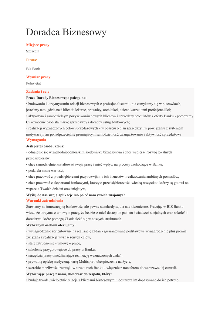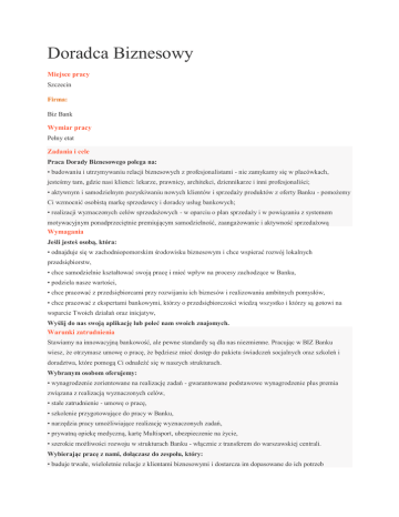 Doradca Biznesowy Miejsce pracy Szczecin Firma: Biz Bank Wymiar pracy Pełny etat Zadania i cele Praca Dorady Biznesowego polega na: • budowaniu i utrzymywaniu relacji biznesowych z profesjonalistami - nie zamykamy się w placówkach, jesteśmy tam, gdzie nasi klienci: lekarze, prawnicy, architekci, dziennikarze i inni profesjonaliści; • aktywnym i samodzielnym pozyskiwaniu nowych klientów i sprzedaży produktów z oferty Banku - pomożemy Ci wzmocnić osobistą markę sprzedawcy i doradcy usług bankowych; • realizacji wyznaczonych celów sprzedażowych - w oparciu o plan sprzedaży i w powiązaniu z systemem motywacyjnym ponadprzeciętnie premiującym samodzielność, zaangażowanie i aktywność sprzedażową Wymagania Jeśli jesteś osobą, która: • odnajduje się w zachodniopomorskim środowisku biznesowym i chce wspierać rozwój lokalnych przedsiębiorstw, • chce samodzielnie kształtować swoją pracę i mieć wpływ na procesy zachodzące w Banku, • podziela nasze wartości, • chce pracować z przedsiębiorcami przy rozwijaniu ich biznesów i realizowaniu ambitnych pomysłów, • chce pracować z ekspertami bankowymi, którzy o przedsiębiorczości wiedzą wszystko i którzy są gotowi na wsparcie Twoich działań oraz inicjatyw, Wyślij do nas swoją aplikację lub poleć nam swoich znajomych. Warunki zatrudnienia Stawiamy na innowacyjną bankowość, ale pewne standardy są dla nas niezmienne. Pracując w BIZ Banku wiesz, że otrzymasz umowę o pracę, że będziesz mieć dostęp do pakietu świadczeń socjalnych oraz szkoleń i doradztwa, które pomogą Ci odnaleźć się w naszych strukturach. Wybranym osobom oferujemy: • wynagrodzenie zorientowane na realizację zadań - gwarantowane podstawowe wynagrodzenie plus premia związana z realizacją wyznaczonych celów, • stałe zatrudnienie - umowę o pracę, • szkolenie przygotowujące do pracy w Banku, • narzędzia pracy umożliwiające realizację wyznaczonych zadań, • prywatną opiekę medyczną, kartę Multisport, ubezpieczenie na życie, • szerokie możliwości rozwoju w strukturach Banku - włącznie z transferem do warszawskiej centrali. Wybierając pracę z nami, dołączasz do zespołu, który: • buduje trwałe, wieloletnie relacje z klientami biznesowymi i dostarcza im dopasowane do ich potrzeb rozwiązania bankowe, • tworzy aplikacje, produkty ułatwiające bankowanie i wprowadza je, jako pierwszy na rynku, • kieruje się mottem: "przyjazny świat finansów dla przedsiębiorczych" CV należy składać za pośrednictwem strony, klikając przycisk aplikuj: https://sharehire.pl/offer/d4bfa611
