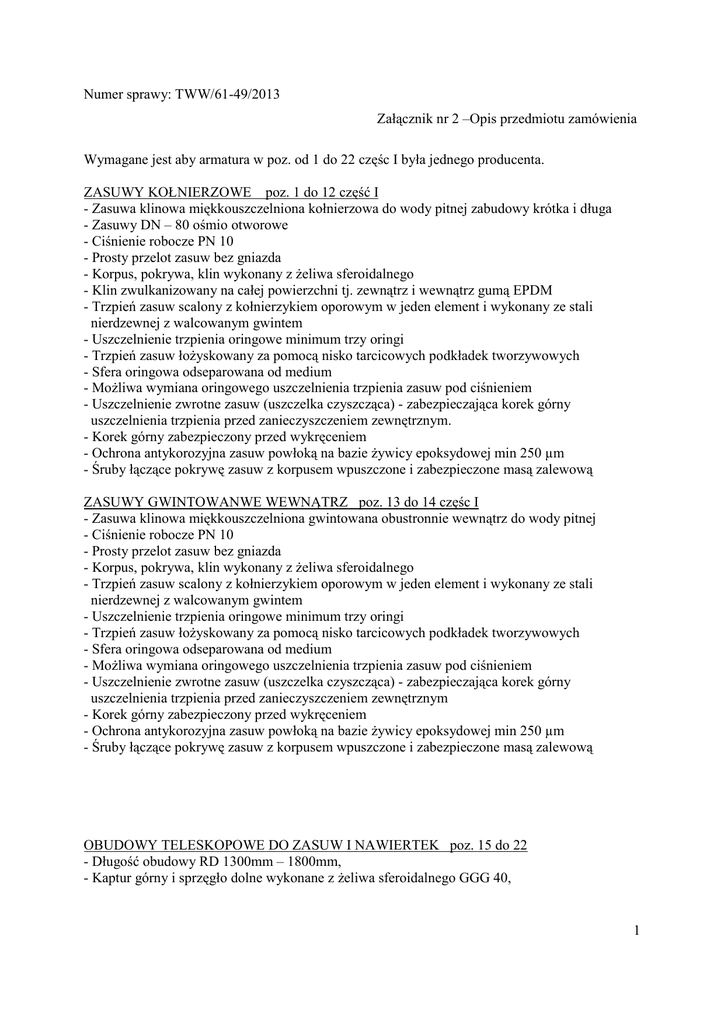 Numer sprawy: TWW/61-49/2013 Załącznik nr 2 –Opis przedmiotu zamówienia Wymagane jest aby armatura w poz. od 1 do 22 częśc I była jednego producenta. ZASUWY KOŁNIERZOWE poz. 1 do 12 część I - Zasuwa klinowa miękkouszczelniona kołnierzowa do wody pitnej zabudowy krótka i długa - Zasuwy DN – 80 ośmio otworowe - Ciśnienie robocze PN 10 - Prosty przelot zasuw bez gniazda - Korpus, pokrywa, klin wykonany z żeliwa sferoidalnego - Klin zwulkanizowany na całej powierzchni tj. zewnątrz i wewnątrz gumą EPDM - Trzpień zasuw scalony z kołnierzykiem oporowym w jeden element i wykonany ze stali nierdzewnej z walcowanym gwintem - Uszczelnienie trzpienia oringowe minimum trzy oringi - Trzpień zasuw łożyskowany za pomocą nisko tarcicowych podkładek tworzywowych - Sfera oringowa odseparowana od medium - Możliwa wymiana oringowego uszczelnienia trzpienia zasuw pod ciśnieniem - Uszczelnienie zwrotne zasuw (uszczelka czyszcząca) - zabezpieczająca korek górny uszczelnienia trzpienia przed zanieczyszczeniem zewnętrznym. - Korek górny zabezpieczony przed wykręceniem - Ochrona antykorozyjna zasuw powłoką na bazie żywicy epoksydowej min 250 µm - Śruby łączące pokrywę zasuw z korpusem wpuszczone i zabezpieczone masą zalewową ZASUWY GWINTOWANWE WEWNĄTRZ poz. 13 do 14 częśc I - Zasuwa klinowa miękkouszczelniona gwintowana obustronnie wewnątrz do wody pitnej - Ciśnienie robocze PN 10 - Prosty przelot zasuw bez gniazda - Korpus, pokrywa, klin wykonany z żeliwa sferoidalnego - Trzpień zasuw scalony z kołnierzykiem oporowym w jeden element i wykonany ze stali nierdzewnej z walcowanym gwintem - Uszczelnienie trzpienia oringowe minimum trzy oringi - Trzpień zasuw łożyskowany za pomocą nisko tarcicowych podkładek tworzywowych - Sfera oringowa odseparowana od medium - Możliwa wymiana oringowego uszczelnienia trzpienia zasuw pod ciśnieniem - Uszczelnienie zwrotne zasuw (uszczelka czyszcząca) - zabezpieczająca korek górny uszczelnienia trzpienia przed zanieczyszczeniem zewnętrznym - Korek górny zabezpieczony przed wykręceniem - Ochrona antykorozyjna zasuw powłoką na bazie żywicy epoksydowej min 250 µm - Śruby łączące pokrywę zasuw z korpusem wpuszczone i zabezpieczone masą zalewową OBUDOWY TELESKOPOWE DO ZASUW I NAWIERTEK poz. 15 do 22 - Długość obudowy RD 1300mm – 1800mm, - Kaptur górny i sprzęgło dolne wykonane z żeliwa sferoidalnego GGG 40, 1 - Kaptur górny malowany na niebiesko powłoką na bazie żywicy epoksydowej min 250 µm - Kielich dolny i rura osłonowa wykonane z polietylenu - Do każdej obudowy dostawca dostarczy w komplecie połączenie sprzęgła z trzpieniem zasuwy za pomocą zawleczki Wrzeciono (trzpień) w całości ocynkowany o profilu kwadratowym, - Kaptur górny przymocowany do wrzeciona za pomocą śruby, co pozwala na dopasowanie długości obudowy. SAMONAWIERTKA DO NAWIERCANIA RUR Z TWORZYW SZTUCZNYCH PE – HD i PVC-U z wewnętrznym zaworem odcinającym poz. 23 do 27 - Korpus, głowica, obejma wykonane z żeliwa sferoidalnego - Głowica zabezpieczona w korpusie przed wykręceniem specjalnym kołkiem gwintowanym - Nóż nacinający wykonany ze stali nierdzewnej - Trzpień ze stali nierdzewnej z walcowanym gwintem - Uszczelnienie trzpienia o-ringowe - Uszczelka czyszcząca zabezpieczająca korek górny uszczelnienia trzpienia przed kontaktem z ziemią. - Odejście przyłącza domowego gwintowane wewnątrz 2'' - Ciśnienie robocze PN – 10 - Dolna część samonawiertki przylegająca do nawiercanej rury w całości wyłożona gumą EPDM - Obejma dolna wykonana z żeliwa sferoidalnego w całości wyłożona gumą EPDM - Śruby, nakrętki i podkładki łączące samonawiertkę z obejmą wykonane ze stali nierdzewnej - Ochrona antykorozyjna powłoką na bazie żywicy epoksydowej, minimum 250 mikronów Samonawiertka winna posiadać wbudowany wewnątrz zawór zapewniający 100 % odcięcie wody. HYDRANTY NADZIEMNE Z POJEDYŃCZYM ZAMKNIĘCIEM poz.31-32 część I - Połączenia kołnierzowe i owiercenie wg PN-EN 1092-2:1999 (DIN 2501) (DN – 80 ośmio otworowe) - Maksymalne ciśnienie robocze PN – 16 - Hydrant nadziemny DN 80 posiada dwie nasady na węże fi – 75 - Głębokość wkopu : 1250mm, 1500mm - Korpus górny, korpus dolny, kolumna, grzyb wykonane z żeliwa sferoidalnego GGG40 EN-GJS-400-15 - Samoczynne całkowite odwodnienie z chwilą odcięcia wody - Całość materiałów odpornych na korozję - Trzpień górny i dolny wrzeciono wykonany ze stali nierdzewnej z walcowanym gwintem - Uszczelnienie trzpienia górnego o-ringowe, umieszczone w mosiężnej wkrętce - Elementy odcinająco-zamykające /grzyb/ całkowicie zawulkanizowane gumą EPDM - Ochrona antykorozyjna powłoką na bazie żywicy epoksydowej, minimum 250 mikronów, dodatkowe -Zabezpieczenie przed promieniowaniem UV. - Kolor niebieski zgodnie z zamówieniem zamawiającego. KOLANO HYDRANTOWE poz. 33 część I - Kolano żeliwne dwukołnierzowe 90° DN 80 ze stopką N z żeliwa sferoidalnego ośmio otworowe 2 - Maksymalne ciśnienie robocze PN – 10 - Zabezpieczenie antykorozyjne powłoką na bazie żywicy epoksydowej minimum 250 mikronów KRÓCIEC FF poz. 34 część I - Króciec żeliwny dwukołnierzowy FF DN 80 L = 300 mm. z żeliwa sferoidalnego ośmio otworowe - Maksymalne ciśnienie robocze PN – 10 - Zabezpieczenie antykorozyjne powłoką na bazie żywicy epoksydowej minimum 250 mikronów SKRZYNKI DO ZASUW I NAWIERTEK poz.29 część I - skrzynka duża 190 x 270 x 270 - korpus z tworzywa PE – HD - pokrywka z żeliwa szarego i zabezpieczona antykorozyjnie farbą bitumiczną OBEJMY ŻELIWNE Z GWINTEM WEWN. DO RUR PE/PVC poz. 1-4 część II - Obejma wykonana z żeliwa sferoidalnego z gwintem wewnętrznym 2'' - śruby, nakrętki i podkładki łączące elementy obejmy ze stali nierdzewnej - połówki obejmy w całości wyłożone gumą EPDM - ochrona antykorozyjna powłoką na bazie żywicy epoksydowej minimum 250 mikronów OPASKI NAPRAWC