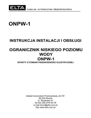 ZAKŁAD AUTOMATYKI PRZEMYSŁOWEJ ONPW-1 INSTRUKCJA INSTALACJI I OBSŁUGI OGRANICZNIK NISKIEGO POZIOMU WODY ONPW-1 OPARTY O POMIAR PRZEWODNOŚCI ELEKTRYCZNEJ Zakład Automatyki Przemysłowej „ELTA” 84-230 Rumia ul. Ślusarska 41 tel./fax (58) 679-34-78 e-mail [email protected] http www.elta.com.pl ONPW-1 - INSTRUKCJA INSTALACJI I OBSŁUGI 2 SPIS TREŚCI SPIS TREŚCI.................................................................................................................................................................. 1 1. BEZPIECZEŃSTWO ................................................................................................................................................. 3 2. WIDOK PŁYTY CZOŁOWEJ ................................................................................................................................... 3 3. PRZEZNACZENIE .................................................................................................................................................... 4 4. PODSTAWOWE DANE TECHNICZNE................................................................................................................... 4 5. OPIS TECHNICZNY.................................................................................................................................................. 4 6. PRZEPISY MONTAśU ............................................................................................................................................. 5 7. URUCHOMIENIE...................................................................................................................................................... 5 8. KONSERWACJA....................................................................................................................................................... 6 9. KOMPLETACJA........................................................................................................................................................ 6 10. TYPOWE NIEPRAWIDŁOWOŚCI W PRACY URZĄDZENIA............................................................................ 6 11. PRZYKŁADOWE SCHEMATY POŁĄCZEŃ ........................................................................................................ 7 12. OPIS ZACISKÓW ONPW-1 ................................................................................................................................... 8 KARTA GWARANCYJNA URZĄDZENIA ................................................................................................................. 9 PROTOKÓŁ POMIARÓW .......................................................................................................................................... 10 ZAKŁAD AUTOMATYKI PRZEMYSŁOWEJ ”ELTA” 84-230 RUMIA UL.ŚLUSARSKA 41 TEL: (58) 679-34-78 MAIL: [email protected] HTTP: WWW.ELTA.COM.PL ONPW-1 - INSTRUKCJA INSTALACJI I OBSŁUGI 3 1. BEZPIECZEŃSTWO Regulator ONPW-1 zasilany jest napięciem 230V AC, zatem moŜe być instalowany jedynie przez pracowników posiadających odpowiednie kwalifikacje. Przez pracowników posiadających odpowiednie kwalifikacje naleŜy rozumieć osoby, które uzyskały odpowiednie przeszkolenie w zakresie elektrotechniki, zastosowań i uŜytkowania urządzeń bezpieczeństwa i sprzętu ochrony osobistej przy eksploatacji i przy pracy z instalacjami i urządzeniami elektrycznymi, jak równiŜ w zakresie udzielania pierwszej pomocy i zapobiegania wypadkom, w wyniku czego uzyskały dostateczny zasób wiadomosci i umiejętności niezbędny przy instalacji i odbiorze tego urządzenia. Niebezpieczeństwo Przy wykręcaniu sondy SPW-1, która jest połączona z układem ONPW-1 z otworu, w którym jest osadzona, moŜe dojść do wyrzutu pary lub gorącej wody pod ciśnieniem. Stwarza to zagroŜenie odniesienia powaŜnych obraŜeń cielesnych (poparzenia). W związku z tym dopuszcza się demontaŜ sondy wyłącznie po likwidacji ciśnienia w kotle/zbiorniku, itd., po uprzednim sprawdzeniu, Ŝe ciśnienie wewnątrz tego urządzenia równe jest atmosferycznemu. OstrzeŜenie Podczas pracy układu ONPW-1 na listwie zaciskowej występuje napięcie sieci. Stwarza to zagroŜenie poraŜenia prądem elektrycznym. Przed przystąpieniem do demontaŜu lub montaŜu pokrywy obudowy naleŜy odciąć dopływ zasilania do urządzenia. 2. WIDOK PŁYTY CZOŁOWEJ ZAKŁAD AUTOMATYKI PRZEMYSŁOWEJ ”ELTA” 84-230 RUMIA UL.ŚLUSARSKA 41 TEL: (58) 679-34-78 MAIL: [email protected] HTTP: WWW.ELTA.COM.PL ONPW-1 - INSTRUKCJA INSTALACJI I OBSŁUGI 4 3. PRZEZNACZENIE Układ elektroniczny ONPW–1 przeznaczony jest do sygnalizacji przekroczenia poziomu cieczy przewodzących. Układ współpracuje z sondą SPW-1. Fakt przekroczenia zadanego parametru sygnalizowany jest lampką LED, oraz wyłączeniem wewnętrznego przekaźnika, którego grupy styków przełączalnych dostępne są na zaciskach obudowy. Powrót do stanu załączenia moŜliwy jest dopiero po podniesieniu się poziomu cieczy powyŜej poziomu minimalnego, oraz naciśnięciu przycisku KASOWANIE. Układ umoŜliwia podłączenie zewnętrznych kontrolek LED i przycisków TEST LAMPEK i KASOWANIE. 4. PODSTAWOWE DANE TECHNICZNE • Napięcie zasilania: • Pobór mocy: • Napięcie zasilania sondy pomiarowej: • ObciąŜalność styków przekaźnika: • Stopień ochrony: • • • Zakres temperatur pracy: Maksymalna długość połączeń z sondą: Minimalna przewodność wody: • • • • Bezwładność układu pomiarowego: Masa: Wymiary (wys., szer., dł.): PołoŜenie pracy: • MontaŜ: 230V 50Hz (+10 % - 15%) max 10VA 12V AC 50 Hz 2 A, 230 V AC1 obudowa: IP40 płyta czołowa: IP20 0, +20 oC, +40oC 50 mb nie mniej niŜ 2mS/m (przy zanurzeniu elektrody pomiarowej na głębokość 20 mm i odległości między elektrodami 50 mm) 5 s (+1-1s) 0,5 kg 75mm, 55mm, 110mm dowolne szyna TS35 5. OPIS TECHNICZNY Zadaniem układu ONPW–1 jest określenie poziomu wody poprzez pomiar prądu
