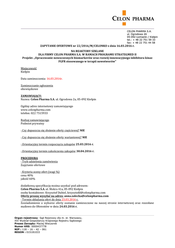 ZAPYTANIE OFERTOWE nr 22/2016/M/CELONKO z