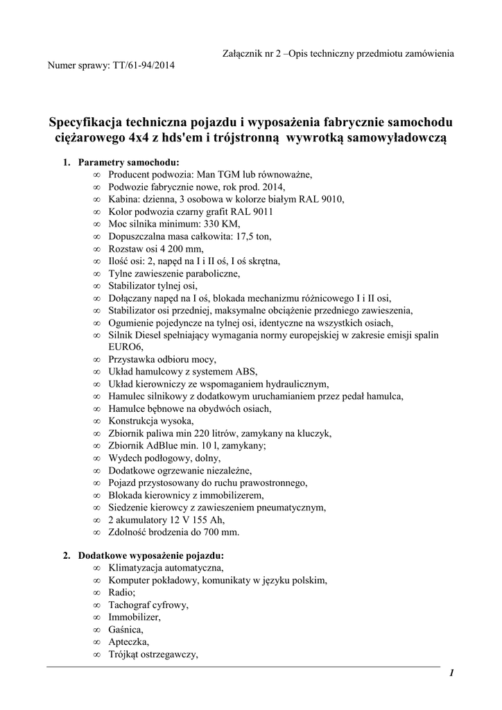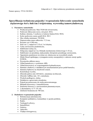 Załącznik nr 2 –Opis techniczny przedmiotu zamówienia Numer sprawy: TT/61-94/2014 Specyfikacja techniczna pojazdu i wyposażenia fabrycznie samochodu ciężarowego 4x4 z hds'em i trójstronną wywrotką samowyładowczą 1. Parametry samochodu: • Producent podwozia: Man TGM lub równoważne, • Podwozie fabrycznie nowe, rok prod. 2014, • Kabina: dzienna, 3 osobowa w kolorze białym RAL 9010, • Kolor podwozia czarny grafit RAL 9011 • Moc silnika minimum: 330 KM, • Dopuszczalna masa całkowita: 17,5 ton, • Rozstaw osi 4 200 mm, • Ilość osi: 2, napęd na I i II oś, I oś skrętna, • Tylne zawieszenie paraboliczne, • Stabilizator tylnej osi, • Dołączany napęd na I oś, blokada mechanizmu różnicowego I i II osi, • Stabilizator osi przedniej, maksymalne obciążenie przedniego zawieszenia, • Ogumienie pojedyncze na tylnej osi, identyczne na wszystkich osiach, • Silnik Diesel spełniający wymagania normy europejskiej w zakresie emisji spalin EURO6, • Przystawka odbioru mocy, • Układ hamulcowy z systemem ABS, • Układ kierowniczy ze wspomaganiem hydraulicznym, • Hamulec silnikowy z dodatkowym uruchamianiem przez pedał hamulca, • Hamulce bębnowe na obydwóch osiach, • Konstrukcja wysoka, • Zbiornik paliwa min 220 litrów, zamykany na kluczyk, • Zbiornik AdBlue min. 10 l, zamykany; • Wydech podłogowy, dolny, • Dodatkowe ogrzewanie niezależne, • Pojazd przystosowany do ruchu prawostronnego, • Blokada kierownicy z immobilizerem, • Siedzenie kierowcy z zawieszeniem pneumatycznym, • 2 akumulatory 12 V 155 Ah, • Zdolność brodzenia do 700 mm. 2. Dodatkowe wyposażenie pojazdu: • Klimatyzacja automatyczna, • Komputer pokładowy, komunikaty w języku polskim, • Radio; • Tachograf cyfrowy, • Immobilizer, • Gaśnica, • Apteczka, • Trójkąt ostrzegawczy, 1 • Hydrauliczny podnośnik oraz klucz do kół, • Sprzęg przyczepy, • Koło zapasowe (typ i rozmiar jednakowy z zastosowanym w pojeździe), • Świadectwo homologacji, • Okres gwarancji na podwozie i napęd 24 miesiące lub limit 100 000 km, 3. Zabudowa: 3.1. HDS : • dźwig fabrycznie nowy, rok prod. 2014, • moment udźwigu, max. 120,00 kNm, • moment obrotowy żurawia 21,50 kNm, • wysięg hydrauliczny 8,30 m, • wysięg/udźwig : 2,15 m - 5 580 kg 4,30 m - 2 845 kg 6,10 m - 1 970 kg 8,00 m - 1 490 kg • • • • • • • • • • • • • • • • • • • • masa żurawia około 1 780 kg, zabudowa za kabiną kierowcy przed wywrotką samowyładowczą, elektroniczny system zabezpieczenia przed przeciążeniem zawierający min. system ostrzegający przed przeciążeniem żurawia oraz blokujący pracę w momencie przeciążenia, wizualny sygnalizator procentowego wykorzystania możliwości urządzenia, podświetlany wyświetlacz ciekłokrystaliczny przy panelu sterowania umożliwiający śledzenie parametrów pracy żurawia i umożliwiający wybranie aktywnych funkcji żurawia, wyłączniki awaryjne STOP na wszystkich stanowiskach sterowniczych, sterowanie z prawej i z lewej strony, nogi podporowe wysuwane i opuszczane hydraulicznie, kąt obrotu 390 stopni - realizowany na listwie zębatej, hak 8 t, system zwiększający szybkość wysuwu ramion teleskopowych, piąta i szósta funkcja, standardowe belki nóg podporowych o rozstawie około 4 375 mm, podstawa kolumny odlewana, zbiornik oleju 90 l, system uzależniający udźwig żurawia od szerokości i rozstawienia podpór, czujnik położenia ramienia wewnętrznego żurawia, całość wykonana ze szwedzkiej certyfikowanej stali WELDOX 700, poziomnice na belkach podporowych, zestaw montażowy, katalog części zamiennych, kolor RAL 3020, chwytak do materiałów sypkich z zębami o pojemności 350 l, okres gwarancji : 24 miesiące na strukturalne elementy żurawia, 12 miesięcy na hydrauliczne elementy żurawia, 12 miesięcy na chwytak. 3.2. Wywrotka trójstronna : • wywrotka o wymiarach gabarytowych 4 200 mm, 2 500 mm, 600 mm, (długość, szerokość i wysokość), • objętość ok. 5,7 m3; • podłoga 4 mm, materiał HARDOX, 2 • • • • • • • • • • • • • • • • • • • • • burty 2,2 mm, stal 18G2Z, burta przednia stalowa ok. 800 mm, burty boczne nie dzielone z dolnymi i górnymi zawiasami, wspomaganie sprężynowe burt, burta tylna z górnymi zawiasami, zamki otwierane automatycznie, zawór rozdzielający żuraw - wywrotka, sterowanie wywrotem pneumatyczne z kabiny, sygnalizacja podniesienia skrzyni na pulpicie w kabinie, rama pośrednia wydłużona pod montaż żurawia, osłony świateł tylnych z uchylną kratką, plandeka zwijana na burcie przedniej szer. ok. 2 400 mm, stopnie ułatwiające wejście na skrzynie, wszystkie zawiasy kulowe, uchwyty do mocowania ładunku 6 szt, po 3 szt. na stronę, bariery boczne aluminiowe, błotniki plastikowe pełne na koła tylne, żółte światła obrysowe, tablice wyróżniające, konturowe oklejenie taśmami odblaskowymi, wywrotka śrutowana, gruntowana i malowana w jednym kolorze, RAL 5017, skrzynka narzędziowa plastik, okres gwarancji 12 miesięcy. 3