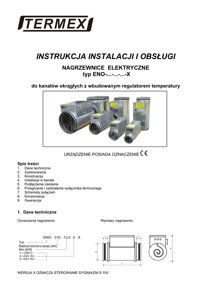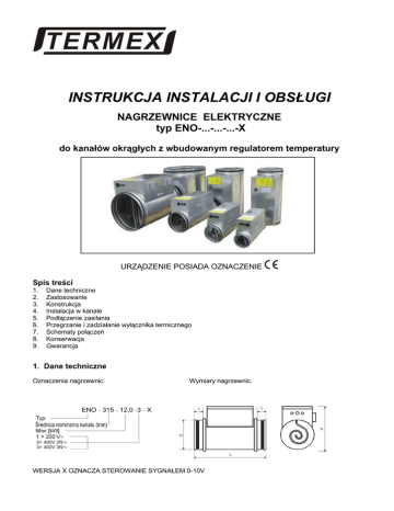 TERMEX INSTRUKCJA INSTALACJI I OBSŁUGI NAGRZEWNICE ELEKTRYCZNE typ ENO-...-...-...-X do kanałów okrągłych z wbudowanym regulatorem temperatury URZĄDZENIE POSIADA OZNACZENIE Spis treści 1. 2. 3. 4. 5. 6. 7. 8. 9. Dane techniczne Zastosowanie Konstrukcja Instalacja w kanale Podłączenie zasilania Przegrzanie i zadziałanie wyłącznika termicznego Schematy połączeń Konserwacja Gwarancja 1. Dane techniczne Oznaczenia nagrzewnic. Wymiary nagrzewnic. 2= 400V 2N 3= 400V 3N WERSJA X OZNACZA STEROWANIE SYGNAŁEM 0-10V Tabela 1. Dane techniczne nagrzewnic. Lp. Typ 1 1. ENO-100-0,4-1-X 2. ENO-100-0,8-1-X 3. ENO-100-1,2-1-X 4. ENO-125-0,4-1-X 5. ENO-125-0,5-1-X 6. ENO-125-0,8-1-X 7. ENO-125-1,0-1-X 8. ENO-125-1,2-1-X 9. ENO-125-1,5-1-X 10. ENO-160-0,8-1-X 11. ENO-160-1,0-1-X 12. ENO-160-1,6-1-X 13. ENO-160-2,0-1-X 14. ENO-160-2,4-1-X 15. ENO-160-3,0-2-X 16. ENO-160-3,6-2-X 17. ENO-160-4,0-2-X 18. ENO-160-3,0-3-X 19. ENO-160-6,0-3-X 20. ENO-200-0,8-1-X 21. ENO-200-1,0-1-X 22. ENO-200-1,2-1-X 23. ENO-200-1,6-1-X 24. ENO-200-2,0-1-X 25. ENO-200-2,4-1-X 26. ENO-200-3,0-2-X 27. ENO-200-3,6-2-X 28. ENO-200-4,0-2-X 29. ENO-200-3,0-3-X 30. ENO-200-3,6-3-X 31. ENO-200-6,0-3-X 32. ENO-250-1,0-1-X 33. ENO-250-1,2-1-X 34. ENO-250-1,5-1-X 35. ENO-250-2,0-1-X 36. ENO-250-2,4-1-X 37. ENO-250-3,0-2-X 38. ENO-250-3,6-2-X 39. ENO-250-4,0-2-X 40. ENO-250-3,0-3-X 41. ENO-250-3,6-3-X 42. ENO-250-4,5-3-X 43. ENO-250-6,0-3-X 44. ENO-250-9,0-3-X 45. ENO-315-1,0-1-X 46. ENO-315-1,5-1-X 47. ENO-315-2,0-1-X 48. ENO-315-3,0-2-X 49. ENO-315-4,0-2-X 50. ENO-315-3,0-3-X 51. ENO-315-4,5-3-X 52. ENO-315-6,0-3-X 53. ENO-315-9,0-3-X 54. ENO-315-12,0-3-X 55. ENO-400-1,0-1-X 56. ENO-400-1,5-1-X 57. ENO-400-2,0-1-X 58. ENO-400-3,0-2-X 59. ENO-400-4,0-2-X 60. ENO-400-3,0-3-X 61. ENO-400-4,5-3-X 62. ENO-400-6,0-3-X 63. ENO-400-9,0-3-X 64. ENO-400-12,0-3-X Średnica nominalna kanału [mm] 2 100 100 100 125 125 125 125 125 125 160 160 160 160 160 160 160 160 160 160 200 200 200 200 200 200 200 200 200 200 200 200 250 250 250 250 250 250 250 250 250 250 250 250 250 315 315 315 315 315 315 315 315 315 315 400 400 400 400 400 400 400 400 400 400 Moc [kW] 3 0,4 0,8 1,2 0,4 0,5 0,8 1,0 1,2 1,5 0,8 1,0 1,6 2,0 2,4 3,0 3,6 4,0 3,0 6,0 0,8 1,0 1,2 1,6 2,0 2,4 3,0 3,6 4,0 3,0 3,6 6,0 1,0 1,2 1,5 2,0 2,4 3,0 3,6 4,0 3,0 3,6 4,5 6,0 9,0 1,0 1,5 2,0 3,0 4,0 3,0 4,5 6,0 9,0 12,0 1,0 1,5 2,0 3,0 4,0 3,0 4,5 6,0 9,0 12,0 Napięcia zasilania [V] Ilość elementów grzejnych Prąd [A] Przepływ min. 3 [m /h] D 4 5 1x0,4 230∼ 2x0.4 230∼ 3x0,4 230∼ 1x0,4 230∼ 1x0,5 230∼ 2x0,4 230∼ 2x0,5 230∼ 3x0,4 230∼ 3x0,5 230∼ 1x0,8 230∼ 1x1,0 230∼ 2x0,8 230∼ 2x1,0 230∼ 3x0,8 230∼ 3x1,0 2x400V 2N∼ 4x0,9 2x400V 2N∼ 4x1,0 2x400V 2N∼ 3x400V 3N∼ (Y) 3x1,0 3x400V 3N∼ (Y) 6x1,0 1x0,8 230∼ 1x1,0 230∼ 1x1,2 230∼ 2x0,8 230∼ 2x1,0 230∼ 2x1,2 230∼ 3x1,0 2x400V 2N∼ 3x1,2 2x400V 2N∼ 4x1,0 2x400V 2N∼ 3x400V 3N∼ (Y) 3x1,0 3x400V 3N∼ (Y) 3x1,2 3x400V 3N∼ (Y) 6x1,0 1x1,0 230∼ 1x1,2 230∼ 1x1,5 230∼ 2x1,0 230∼ 2x1,2 230∼ 2x400 3x1,0 2x400 4x0,9 2x400 4x1,0 3x400V 3N∼ (Y) 3x1,0 3x400V 3N∼ (Y) 3x1,2 3x400V 3N∼ (D) 3x1,5 3x400V 3N∼ (Y) 6x1,0 3x400V 3N∼ (D) 2x(3x1,5) 1x1,0 230∼ 1x1,5 230∼ 2x1,0 230∼ 2x1,5 2x400V 2N∼ 4x1,0 2x400V 2N∼ 3x400V 3N∼ (Y) 3x1,0 3x400V 3N∼ (D) 3x1,5 3x400V 3N∼ (Y) 6x1,0 3x400V 3N∼ (D) 2x(3x1,5) 3x400V 3N∼ (D) (6+3)x1,33 1x1,0 230∼ 1x1,5 230∼ 2x1,0 230∼ 2x1,5 2x400V 2N∼ 4x1,0 2x400V 2N∼ 3x400V 3N∼ (Y) 3x1,0 3x400V 3N∼ (D) 3x1,5 3x400V 3N∼ (Y) 6x1,0 3x400V 3N∼ (D) 2x(3x1,5) 3x400V 3N∼ (D) (6+3)x1,33 6 1,7 3,5 5,2 1,7 2,2 3,5 4,3 5,2 6,5 3,5 4,3 7,0 8,7 10,4 7,5 9,0 10,0 4,3 8,7 3,5 4,3 5,2 7,0 8,7 10,4 7,5 9,0 10,0 4,3 5,2 8,7 4,3 5,2 6,5 8,7 10,4 7,5 9,0 10,0 4,3 5,2 6,5 8,7 13,0 4,3 6,5 8,7 7,5 10,0 4,3 6,5 8,7 13,0 17,4 4,3 6,5 8,7 7,5 10,0 4,3 6,5 8,7 13,0 17,4 7 43 43 43 67 67 67 67 67 67 109 109 109 109 109 109 109 109 109 109 170 170 170 170 170 170 170 170 170 170 170 170 265 265 265 265 265 265 265 265 265 265 265 265 265 420 420 420 420 420 420 420 420 420 420 680 680 680 680 680 680 680 680 680 680 8 100 100 100 125 125 125 125 125 125 160 160 160 160 160 160 160 160 160 160 200 200 200 200 200 200 200 200 200 200 200 200 250 250 250 250 250 250 250 250 250 250 250 250 250 315 315 315 315 315 315 315 315 315 315 400 400 400 400 400 400 400 400 400 400 W y m i a r y [mm] L C H 9 400 400 400 400 400 400 400 400 400 400 400 400 400 400 400 400 400 400 500 400 400 400 400 400 400 400 400 400 400 400 500 400 400 400 400 400 400 400 400 400 400 400 500 500 400 400 400 400 400 400 400 400 500 500 400 400 400 400 400 400 400 400 500 500 10 40 40 40 40 40 40 40 40 40 40 40 40 40 40 40 40 40 40 40 40 40 40 40 40 40 40 40 40 40 40 40 40 40 40 40 40 40 40 40 40 40 40 40 40 60 60 60 60 60 60 60 60 60 60 60 60 60 60 60 60 60 60 60 60 11 200 200 200 225 225 225 225 225 225 260 260 260 260 260 260 260 260 260 260 300 300 300 300 300 300 300 300 300 300 300 300 350 350 350 350 350 350 350 350 350 350 350 350 350 415 415 415 415 415 415 415 415 415 415 500 500 500 500 500 500 500 500 500 500 Masa [kg] 12 1,90 2,10 2,35 2,25 2,25 2,65 2,65 2,95 2,95 3,15 3,80 3,40 3,55 3,75 3,95 4,15 4,15 3,95 4,85 3,25 3,30 3,35 3,65 3,75 3,85 4,10 4,45 4,45 4,10 4,30 5,40 3,80 3,85 3,95 4,20 4,30 4,60 5,05 5,05 4,60 4,75 5,10 5,90 6,70 4,90 5,10 5,45 5,65 6,35 5,90 6,20 7,30 7,85 9,55 6,50 6,60 6,95 7,15 6,85 7,40 7,70 8,75 9,35 10,45 2. Zastosowanie - - Ogrzewanie powietrza w kanałach grzewczych, wentylacyjnych – zwiększenie temperatury doprowadzanego powietrza zewnętrznego do wymaganej wartości, Dogrzewanie powietrza w centralach wentylacyjnych z odzyskiem ciepła – nagrzewnica wtórna, Dogrzewanie powietrza w pomieszczeniach, gdzie wymagana jest wyższa temperatura, Uzupełnienie strat ciepła podczas przesyłu w kanałach, Podniesienie temperatury powietrza przed centralą wentylacyjną albo pompą cieplną, w celu zapewnienia prawidłowej ich pracy, g