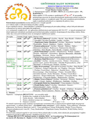 ` GRYFINSKIE RAJDY ROWEROWE - masowa impreza turystyczna 1. Organizatorzy: MłodzieŜowy Ośrodek Sportowy w Gryfinie Urząd Miasta i Gminy Gryfino 2. Harmonogram rajdów: START i META do wszystkich rajdów - PL. BARNIMA I. Meta rajdów I-VII czynna w godzinach 1300 do 1400. W przypadku późniejszego powrotu na metę potwierdzenie ukończenia moŜna uzyskać na następnym rajdzie (z wyjątkiem rajdu VII), pod warunkiem potwierdzenia rajdu w punktach połoŜonych co najmniej do połowy trasy. Potwierdzeń uczestnictwa moŜna dokonywać w trojaki sposób: a) w trakcie rajdu u osób prowadzących jadąc z grupą, b) po wspólnym starcie - indywidualnie w punktach dysponujących pieczątką (sklepy, sołtys) lub pod adresami wskazanymi na starcie (pieczątką lub podpisem), c) w sytuacjach wyjątkowych - po zgłoszeniu telefonicznym pod numerem 603 914 557 - w innych terminach niŜ dzień rajdu pod warunkiem uzyskania potwierdzeń pieczątką z punktów dysponujących nią (sklep, szkoła, firma, sołtys itp.) oraz potwierdzenia mety na następnym najbliŜszym rajdzie. Nr rajdu I II III IV Dodatkowy wspólnie z GDK Gryfino (VIII) Dodatkowy IX V Dodatkowy X VI VII Termin Godz. startu Nazwa i trasa „Do Puszczy Bukowej”: Gryfino - Raczki - Stare Brynki - Chlebowo 24.04. 1000-1030 - (Jarząbki) -Wysoka Gryfińska - Gardno - Gryfino 00 „Pagórkami Gminy Mescherin”: Gryfino - Mescherin - Staffelde 03.05 10 Neurochlitz - Rosow - Radekow - Tantow – Gryfino. „Pasmem północnym”: Gryfino - Mniszki - śabnica - Dębce 22.05. 1000-1030 Daleszewo (Łubnica) - Radziszewo- Radziszewko (Dysiek) – (Omulne) - Stare Brynki - Nowe Brynki - Czepino - Gryfino. „Ziemi Wełtyńskiej”: Gryfino - (Strzelczewo) - Wełtyń - Gardno 19.06. 1000-1030 Drzenin - Sobieradz - Chwarstnica - Borzym -Borzymek - Mielenko Gryfińskie - Wirówek - Wirów - Gryfino. Wariant krótszy przez Osuch (zamiast miejscowości podkreślonych). „Rodzinny Rajd Rowerowy” - V Gryfiński Festiwal Rowerowy 10.07. 1000–1500 „Jazzbike”: Gryfino - ścieŜka rowerowa - Wełtyń - Chwarstnica czas trwania jezioro Lucin - jezioro Wirowskie - Ośrodek Wypoczynkowy „Pod Muszlami” w Wirowie (jez. Wełtyń) - Gryfino. „Dęby Krzywoustego” (lub rajd na Ŝyczenie): Gryfino - Stare Brynki 21. 08. 1000 - 1600 czas trwania - Chlebowo - Polana Chlebowska - jez. Węglino - Karczma - Ponikwa - Przełęcz Trzech Braci - Bukowiec - Kamień Serce - Dęby Krzywoustego - Głaz Grońskiego - Chojna - Szwedzki Młyn Szwedzki Kamień - Oczko Marzanny - Przełęcz Trzech Braci Morowce - Droga Chlebowska - Strzelnica - Uroczysko Mosty - Stara Prochownia - Uroczysko Bunkry - Radziszewko - Gryfino. „Między Tywą a Pniewą”: Gryfino - Szczawno - śórawie - Bartkowo 11.09. 1000-1030 - Gajki - Ciosna - Steklno - Włodkowice - Steklinko - Gryfino. „Europejski Dzień bez Samochodu”- Trasa miejska w Gryfinie. 22.09. 1600–1700 „Wokół Doliny Salwy”: Gryfino - Mescherin - Geesow 03.10. 1000 Hohenreikendorf - Gartz – Gryfino. „Pasmem południowym”: Gryfino - Krajnik - (Głębina) - Krzypnica 16.10. 1000-1030 Pastuszka - Nowe Czarnowo - Pniewo - śórawki - Gryfino. km 29 29 25 38 32 17 + 8 km powrót 45 28 10 30 25 3. Finanse. Wpisowe – wykupienie BIULETYNU – na wszystkie rajdy 1. Rodzina (bez względu na liczbę dzieci) - 20 zł 2. Osoby dorosłe – indywidualnie - 10 zł 3. Dzieci, młodzieŜ ucząca się i studiująca - 5 zł 4. Emeryci i renciści - 50 % (poz. 1 i 2) W ramach wpisowego osoby (rodziny) uczestniczące systematycznie w tegorocznych rajdach będą otrzymywać opracowania - w ramach Złotej Serii - „Gryfińskie trasy rowerowe”. Tom I obejmie „Trasy północne” (Pasmem północnym, Do Puszczy Bukowej), tom II „ Trasy południowe”(Ziemi Wełtyńskiej, Między Tywą a Pniewą, Pasmem południowym) i tom III „ Trasy Zaodrzańskie” (Pagórkami Gminy Mescherin, Wokół Doliny Salwy). 4. Nagrody. W losowaniu cennych nagród (w tym rowery) biorą udział tylko te osoby, które ukończyły przynajmniej 5 rajdów podstawowych lub 6 rajdów łącznie z dodatkowymi (4+2, 3+3). Zakupu BIULETYNU dokonać moŜna w siedzibie MOS – ul. Iwaszkiewicza 70 (Gimnazjum) lub na starcie (Pl. Barnima I) - Rajdu I (24.04) i Rajdu II (03.05) w godz. 940 – 1000