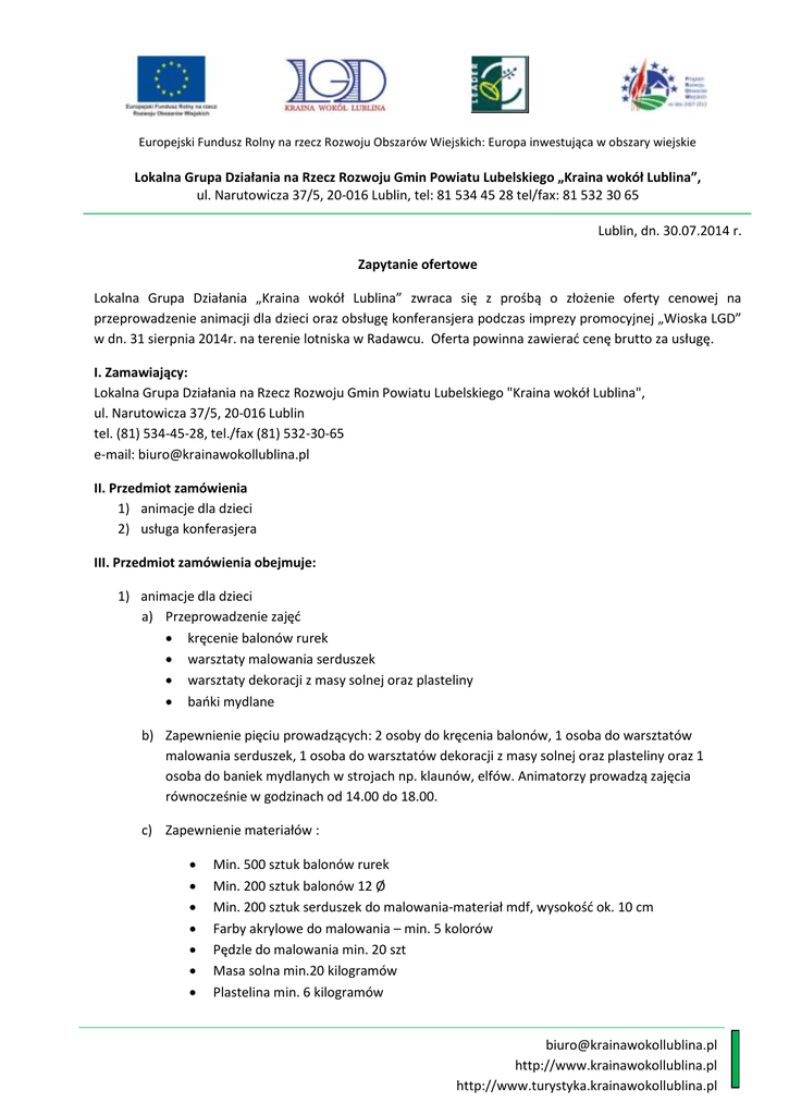 Europejski Fundusz Rolny na rzecz Rozwoju Obszarów Wiejskich: Europa inwestująca w obszary wiejskie Lokalna Grupa Działania na Rzecz Rozwoju Gmin Powiatu Lubelskiego „Kraina wokół Lublina”, ul. Narutowicza 37/5, 20-016 Lublin, tel: 81 534 45 28 tel/fax: 81 532 30 65 Lublin, dn. 30.07.2014 r. Zapytanie ofertowe Lokalna Grupa Działania „Kraina wokół Lublina” zwraca się z prośbą o złożenie oferty cenowej na przeprowadzenie animacji dla dzieci oraz obsługę konferansjera podczas imprezy promocyjnej „Wioska LGD” w dn. 31 sierpnia 2014r. na terenie lotniska w Radawcu. Oferta powinna zawierać cenę brutto za usługę. I. Zamawiający: Lokalna Grupa Działania na Rzecz Rozwoju Gmin Powiatu Lubelskiego "Kraina wokół Lublina", ul. Narutowicza 37/5, 20-016 Lublin tel. (81) 534-45-28, tel./fax (81) 532-30-65 e-mail: [email protected] II. Przedmiot zamówienia 1) animacje dla dzieci 2) usługa konferasjera III. Przedmiot zamówienia obejmuje: 1) animacje dla dzieci a) Przeprowadzenie zajęć kręcenie balonów rurek warsztaty malowania serduszek warsztaty dekoracji z masy solnej oraz plasteliny bańki mydlane b) Zapewnienie pięciu prowadzących: 2 osoby do kręcenia balonów, 1 osoba do warsztatów malowania serduszek, 1 osoba do warsztatów dekoracji z masy solnej oraz plasteliny oraz 1 osoba do baniek mydlanych w strojach np. klaunów, elfów. Animatorzy prowadzą zajęcia równocześnie w godzinach od 14.00 do 18.00. c) Zapewnienie materiałów : Min. 500 sztuk balonów rurek Min. 200 sztuk balonów 12 Ø Min. 200 sztuk serduszek do malowania-materiał mdf, wysokość ok. 10 cm Farby akrylowe do malowania – min. 5 kolorów Pędzle do malowania min. 20 szt Masa solna min.20 kilogramów Plastelina min. 6 kilogramów [email protected] http://www.krainawokollublina.pl http://www.turystyka.krainawokollublina.pl Europejski Fundusz Rolny na rzecz Rozwoju Obszarów Wiejskich: Europa inwestująca w obszary wiejskie Lokalna Grupa Działania na Rzecz Rozwoju Gmin Powiatu Lubelskiego „Kraina wokół Lublina”, ul. Narutowicza 37/5, 20-016 Lublin, tel: 81 534 45 28 tel/fax: 81 532 30 65 Przyrządów do zabawy puszczania baniek min – 6 szt. Płynu do baniek mydlanych gigantów – min. 10 litrów Zapewnienie ręczników papierowych. 2) Usługa konferansjera Konferansjer pracuje w godzinach od 12.00 do godziny 18.00 Konferansjer w stroju ludowym Impreza prowadzona wg scenariusz dostarczonego przez Zleceniodawcę Przed podpisaniem umowy Zleceniodawca zastrzega sobie prawo weryfikacji doświadczenia oraz kwalifikacji firmy, osób prowadzących. III. Termin wykonania zamówienia: 31 sierpnia 2014r. IV. Miejsce i termin składania ofert: Oferty należy składać do dnia 8 sierpnia 2014 r. do godz. 13.00 na adres Zamawiającego w następujący sposób: - dostarczyć osobiście do siedziby LGD „Kraina wokół Lublina”, ul. Narutowicza 37/5 lub - przesłać pocztą na adres: LGD „Kraina wokół Lublina”, ul. Narutowicza 37/5, 20-016 Lublin z dopiskiem „Wioska LGD” (liczy się data odbioru oferty w siedzibie) lub - pocztą elektroniczną na adres: [email protected] lub - przesłać faxem pod nr 81 532 30 65 V. Kryteria wyboru oferty: - 100% cena. Oferty złożone po terminie nie będą rozpatrywane. Osoba do kontaktu: Barbara Małek [email protected] http://www.krainawokollublina.pl http://www.turystyka.krainawokollublina.pl