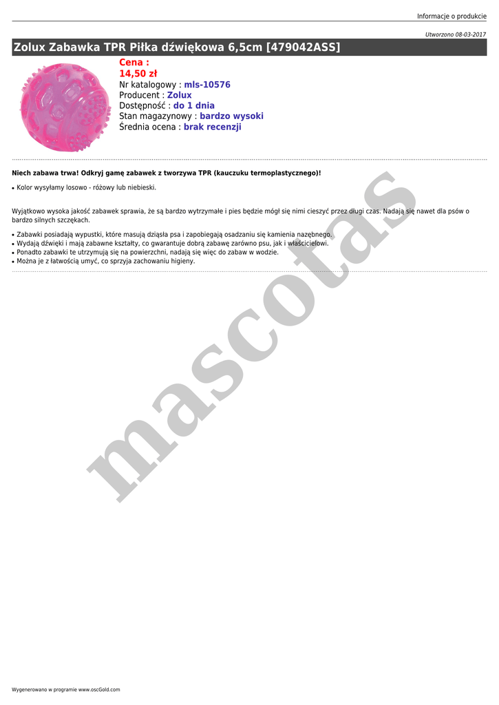 Informacje o produkcie Utworzono 08-03-2017 Zolux Zabawka TPR Piłka dźwiękowa 6,5cm [479042ASS] Cena : 14,50 zł Nr katalogowy : mls-10576 Producent : Zolux Dostępność : do 1 dnia Stan magazynowy : bardzo wysoki Średnia ocena : brak recenzji Niech zabawa trwa! Odkryj gamę zabawek z tworzywa TPR (kauczuku termoplastycznego)! Kolor wysyłamy losowo - różowy lub niebieski. s ● Wyjątkowo wysoka jakość zabawek sprawia, że są bardzo wytrzymałe i pies będzie mógł się nimi cieszyć przez długi czas. Nadają się nawet dla psów o bardzo silnych szczękach. ● ● m as ● Zabawki posiadają wypustki, które masują dziąsła psa i zapobiegają osadzaniu się kamienia nazębnego. Wydają dźwięki i mają zabawne kształty, co gwarantuje dobrą zabawę zarówno psu, jak i właścicielowi. Ponadto zabawki te utrzymują się na powierzchni, nadają się więc do zabaw w wodzie. Można je z łatwością umyć, co sprzyja zachowaniu higieny. co ta ● Wygenerowano w programie www.oscGold.com