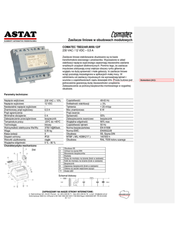 Zasilacze liniowe w obudowach modułowych COMATEC TBD2/AR.0050.12/F 230 VAC / 12 VDC – 0,5 A Zasilacze liniowe stabilizowane zbudowane są na bazie transformatora sieciowego i prostownika. Wyposażone w układ stabilizacji napięcia wyjściowego zapewniają niezawodne zasilanie wrażliwych urządzeń elektronicznych. Pomimo tego, że zasilacze impulsowe zdobywają coraz większe obszary rynku głównie ze względu na dużą sprawność i małe gabaryty, to zasilacze liniowe wciąż pozostają niezastąpione w aplikacjach małej mocy. W odróżnieniu od zasilaczy impulsowych nie wprowadzają tętnień i szumów o częstotliwościach rzędu dziesiątek kHz. Prosta budowa jest jednocześnie gwarancją dużej niezawodności urządzenia. Zabezpieczenie za pomocą bezpiecznika montowanego w wygodnej obudowie. Parametry techniczne: Napięcie wejściowe: Napięcie wyjściowe: Nastawialne napięcie wyjściowe: Znamionowy prąd wyjściowy: Prąd ograniczenia: Minimalne obciążenie: Zabezpieczenie przeciążeniowe: Temperatura pracy: Technologia: Wytrzymałość elektryczna We/Wy: Waga: Klasa izolacji: Stopień ochrony: Warunki użytkowania: Względna wilgotność: Charakterystyka mechaniczna 230 VAC ± 10% 12 VDC 0,5 A 0A bezpiecznik -20oC do +40oC liniowy 3750 V@60sek. 0,55 kg II IP20 ciągłe 5 % - 90 % 1 2 3 4 5 6 7 8 9 11 Częstotliwość: Dokładność stabilizacji: Tętnienia: Moc znamionowa: Prąd zwarcia: Sprawność: Zabezpieczenie zwarciowe: Względna wilgotność: Częstotliwość tętnień: Norma bezpieczeństwa Norma EMC: Obudowa: MTBF ( MIL HDBK217 ): Obudowa: 48-63 Hz ± 3% < 25 mVpp 6W 55% bezpiecznik 90% max 50 Hz EN 61558 EN55022/B 5S, Szyna DIN 140'000 h RAL 7035 koloru szarego Obudowa 5S Uchwyt na szynę DIN Mocowanie bezpiecznika Etykieta Śruby do montażu na ścianie (brak w zestawie) Kołki do montażu na ścianie (brak w zestawie) Bezpiecznik Zapasowy bezpiecznik (brak w zestawie) Osłona na zaciski wejściowe (opcja) Dioda LED Schemat blokowy ZAPRASZAMY NA NASZE STRONY INTERNETOWE: ul. Dąbrowskiego 441, 60-451 Poznań, tel. (061) 848 88 71, faks (061) 848 82 76, e-mail: [email protected] Konto bankowe: BOŚ S.A. O/Poznań nr 69 1540 1056 2001 8310 1156 0002 Regon: 630033055 NIP: 781-00-23-663 str. 1 z 1 Komentarz [A1]: